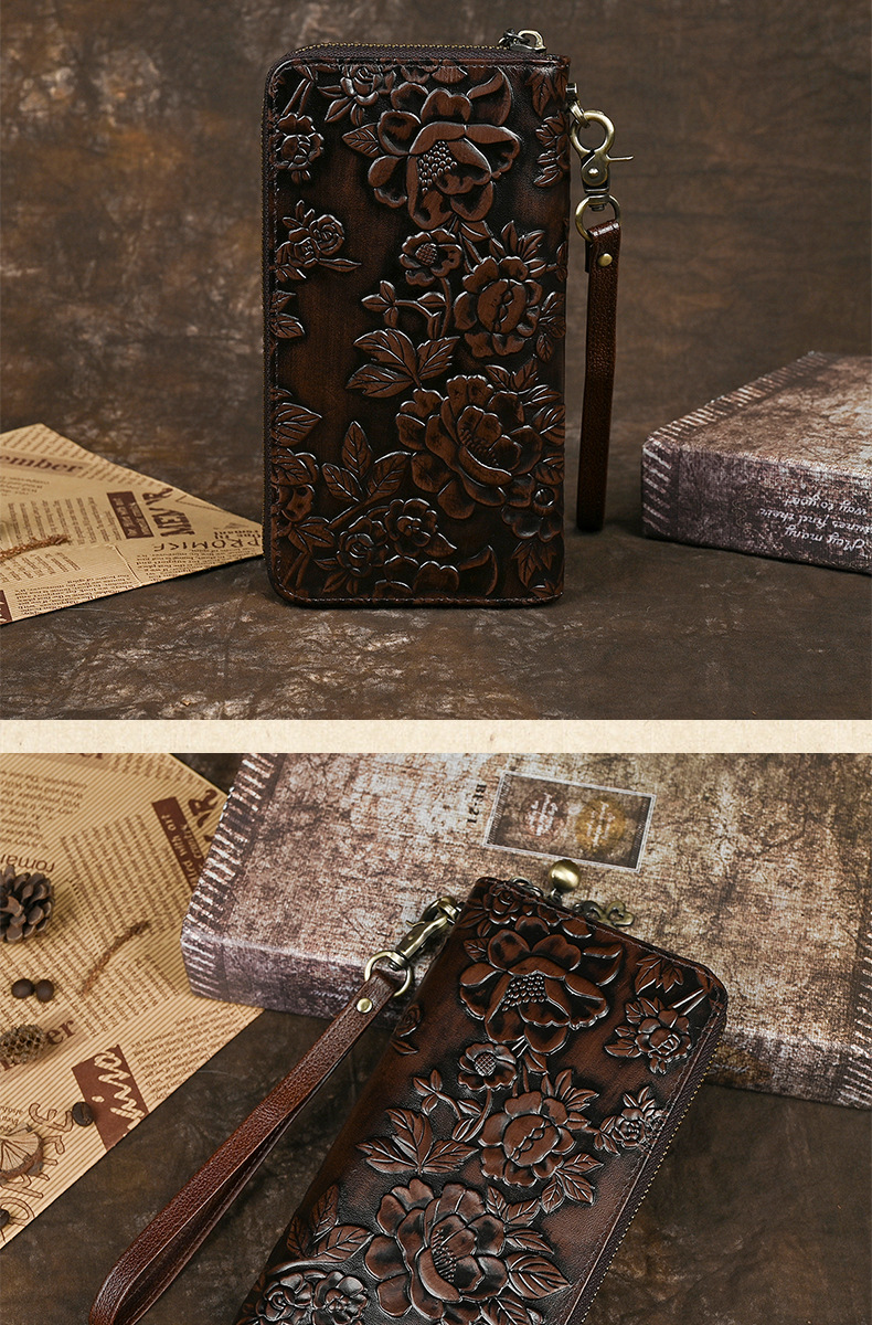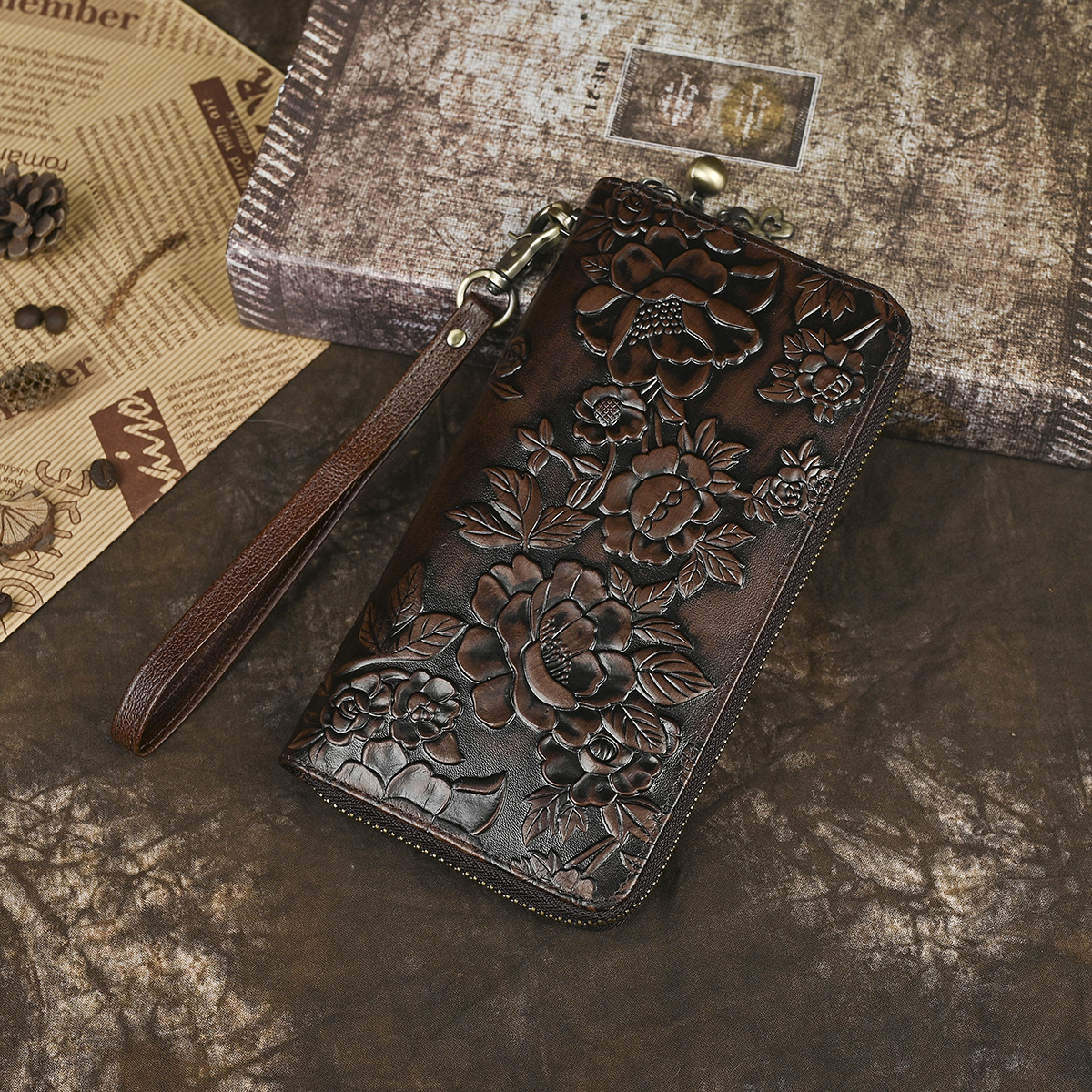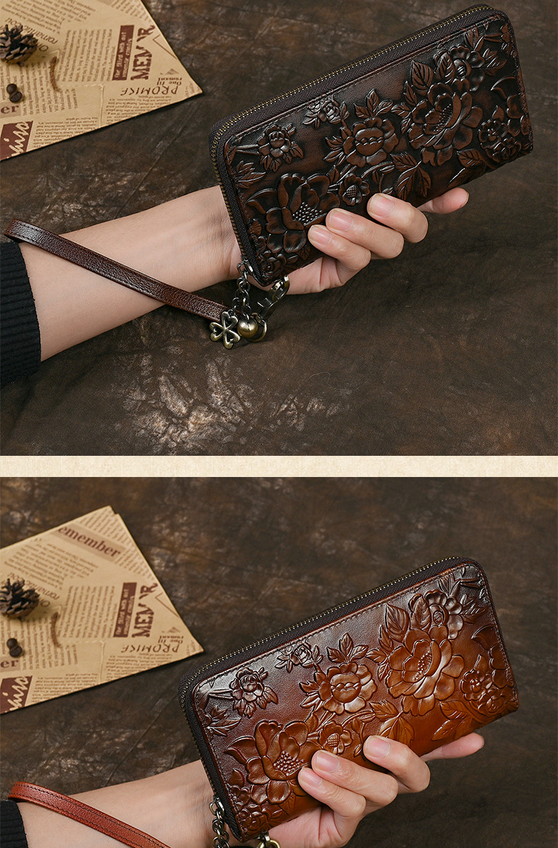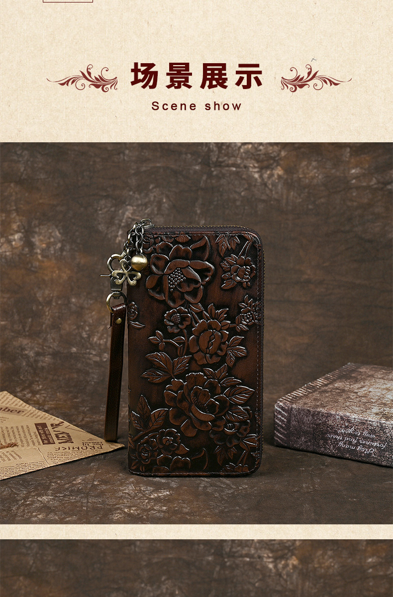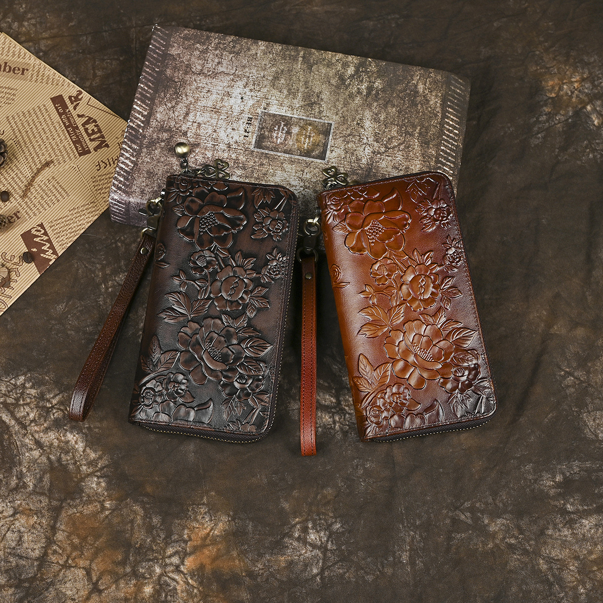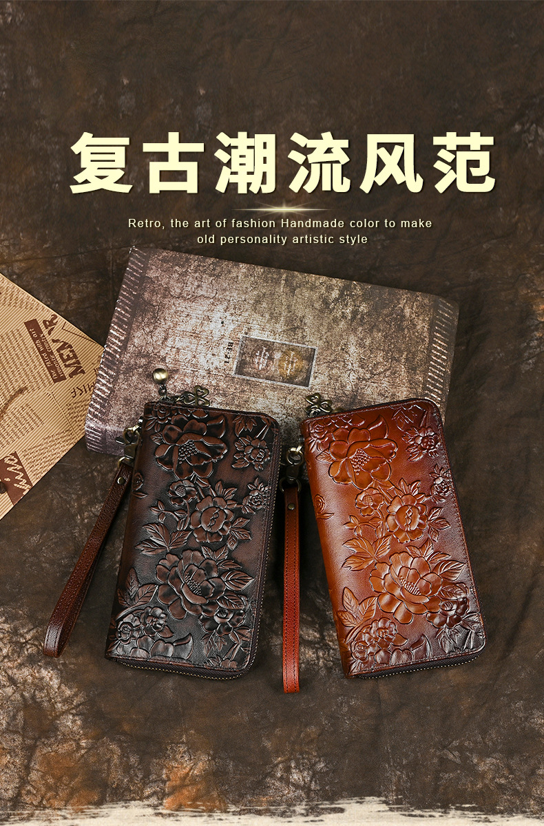 Chiếc ví cầm tay này có kiểu dáng thon dài, được làm từ chất da bò mềm mại và bền chắc. Điểm nhấn đặc biệt là họa tiết ép hoa và cây cỏ tinh xảo, mang đến vẻ đẹp dịu dàng và nữ tính. Bên trong ví có nhiều ngăn rộng rãi, giúp bạn dễ dàng sắp xếp tiền mặt, thẻ và các giấy tờ quan trọng. Rất tiện lợi khi cầm đi làm hoặc dự tiệc. | Tên sản phẩm: Ví Bóp Cầm Tay Nữ Chất Liệu Da Bò Họa Tiết Hoa Phục Cổ Cổ Điển - Túi Ví Nữ | Mã sản phẩm: A0984 - Giá: 670.000đ | Mã nhà sản xuất: GUDGE-G02Hình ảnh sản phẩm