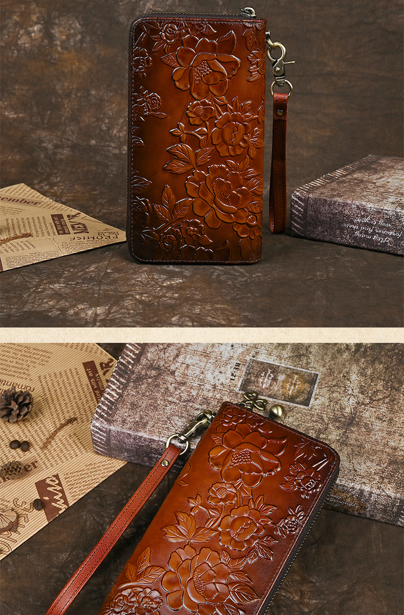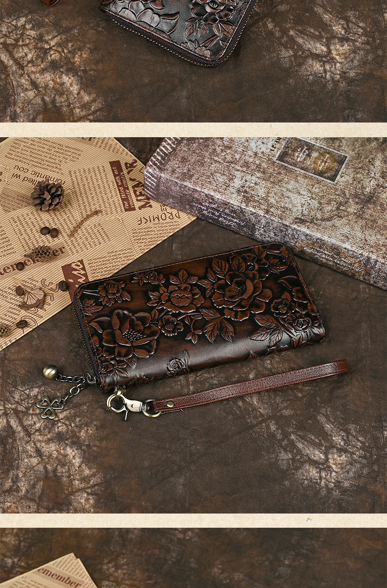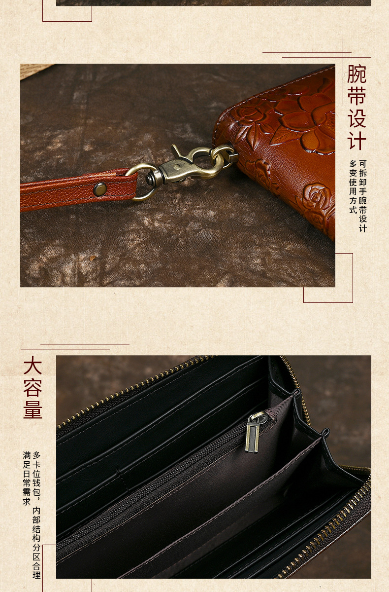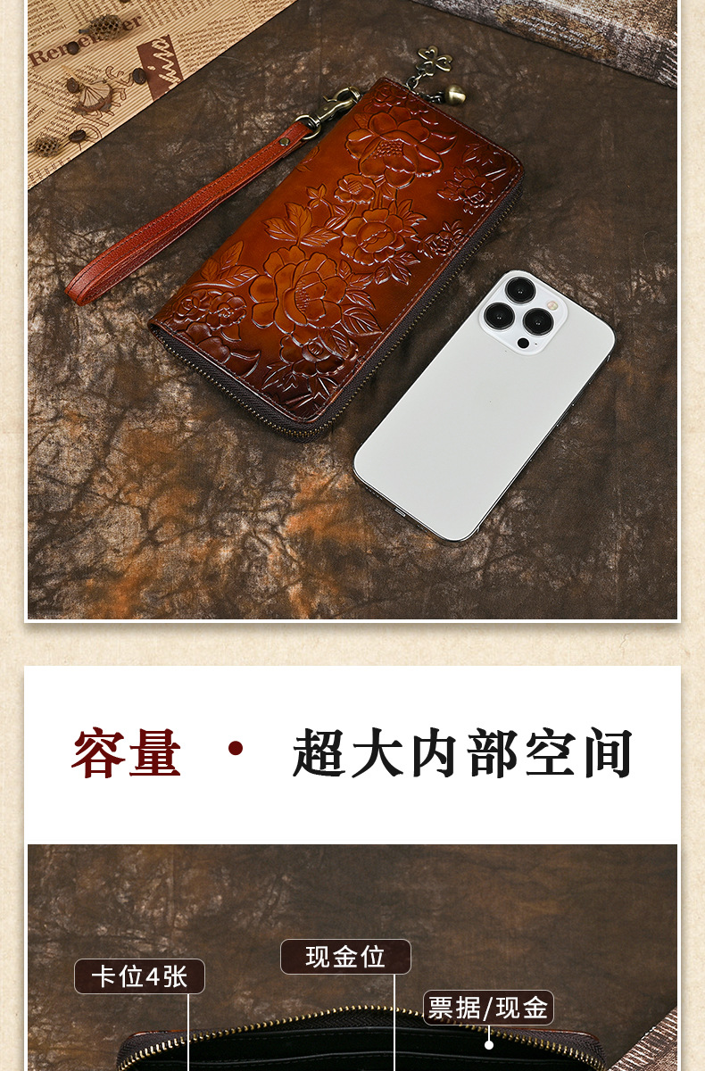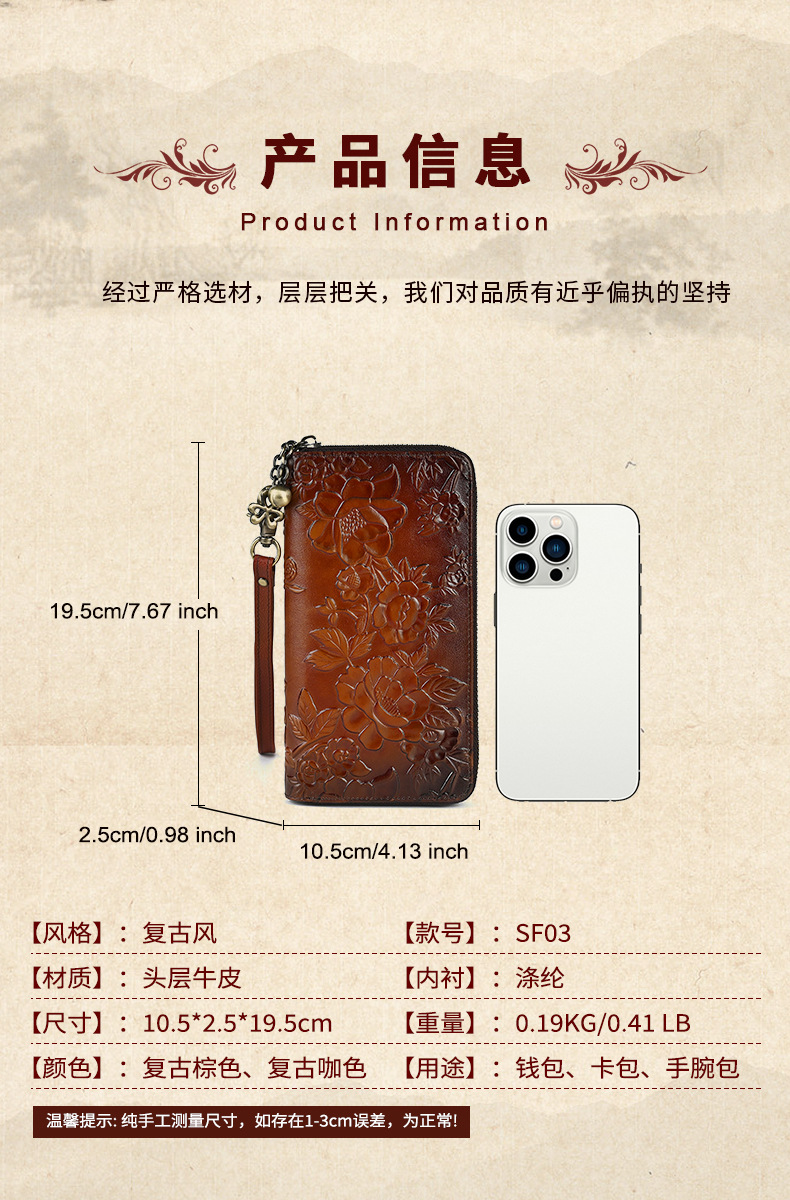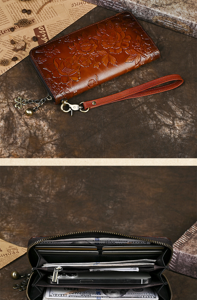 Chiếc ví cầm tay này có kiểu dáng thon dài, được làm từ chất da bò mềm mại và bền chắc. Điểm nhấn đặc biệt là họa tiết ép hoa và cây cỏ tinh xảo, mang đến vẻ đẹp dịu dàng và nữ tính. Bên trong ví có nhiều ngăn rộng rãi, giúp bạn dễ dàng sắp xếp tiền mặt, thẻ và các giấy tờ quan trọng. Rất tiện lợi khi cầm đi làm hoặc dự tiệc. | Tên sản phẩm: Ví Bóp Cầm Tay Nữ Chất Liệu Da Bò Họa Tiết Hoa Phục Cổ Cổ Điển - Túi Ví Nữ | Mã sản phẩm: A0984 - Giá: 670.000đ | Mã nhà sản xuất: GUDGE-G02Hình ảnh sản phẩm
