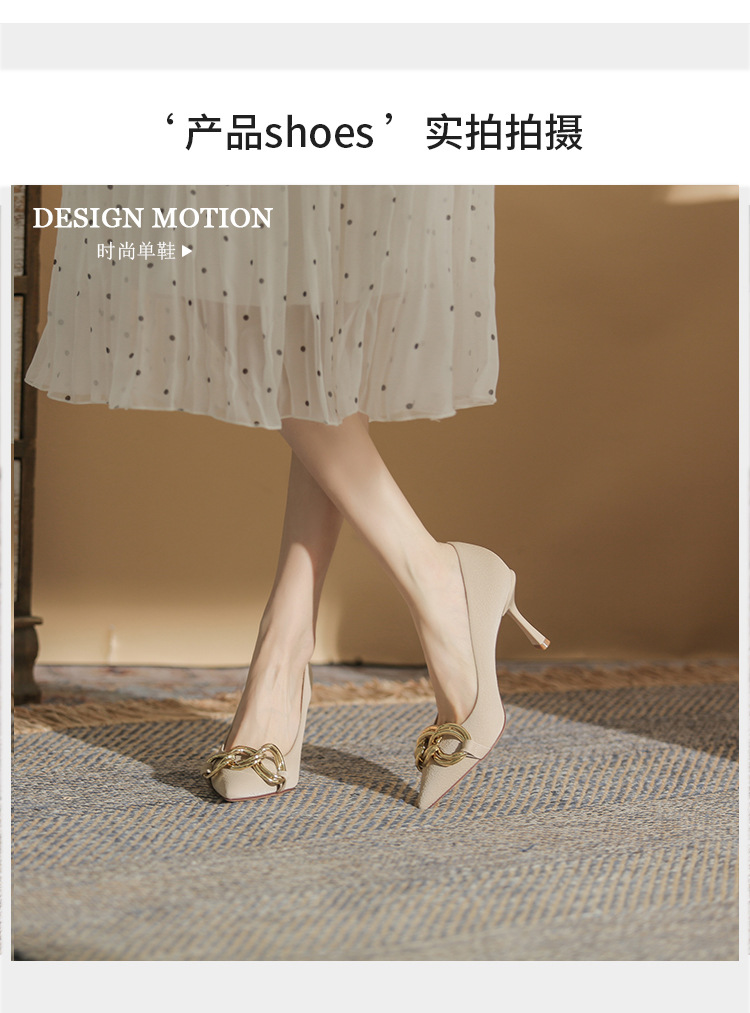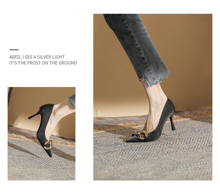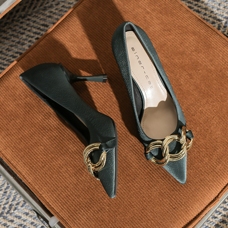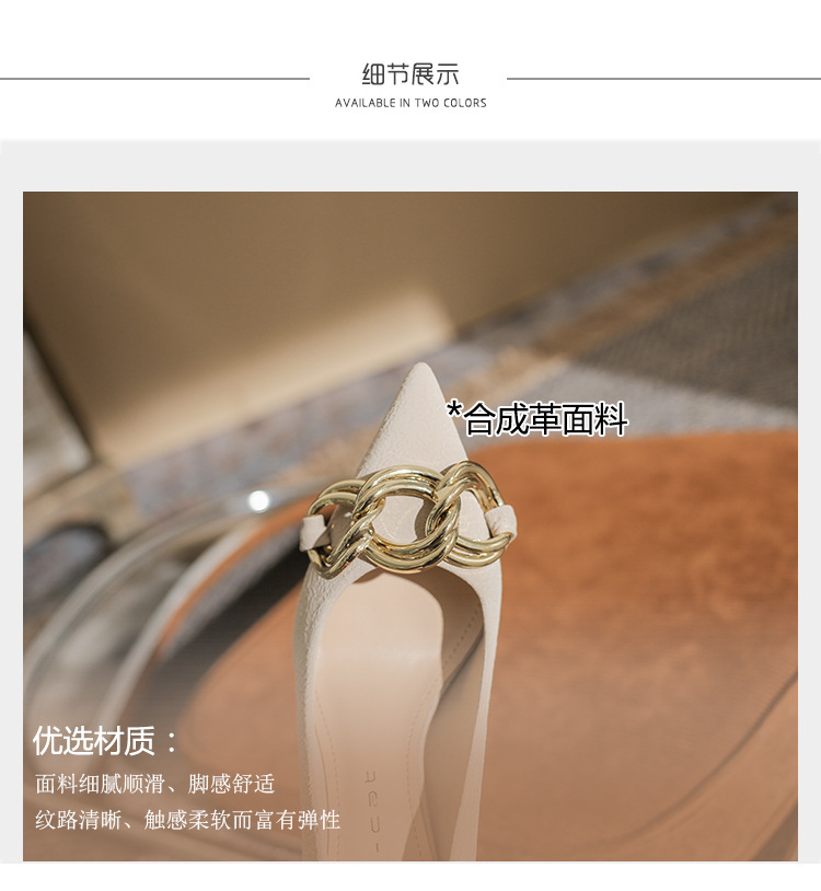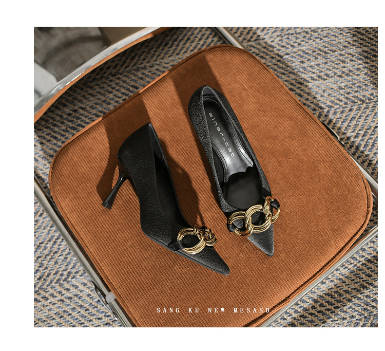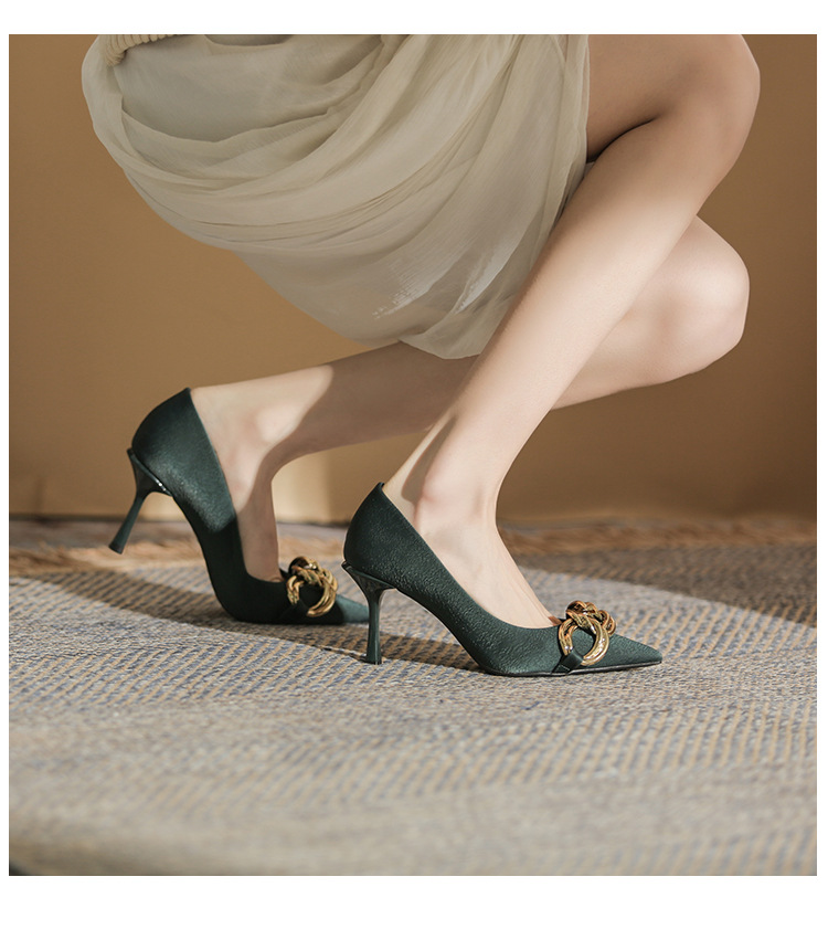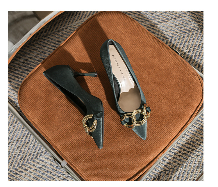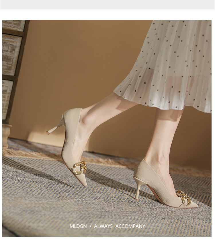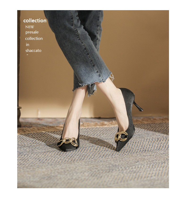 Giày cao gót nữ thiết kế kiểu mũi nhọn, cổ thấp, phong cách châu Âu hiện đại. Điểm nhấn là chi tiết dây xích kim loại tinh tế phía trên, tạo nên vẻ thanh lịch và cá tính. Phần gót thanh mảnh giúp tôn dáng và tăng thêm phần nữ tính. Sản phẩm thích hợp để đi làm, dự tiệc hoặc tạo điểm nhấn cho các bộ trang phục hàng ngày. Khi sử dụng, nên chọn size vừa vặn và kết hợp với những bộ cánh yêu thích. | Tên sản phẩm: Giày Cao Gót Nữ Mũi Nhọn Gót Nhọn Hàng Mùa Xuân Thu Đông Phong Cách Âu Mỹ - Giày Dép Nữ | Mã sản phẩm: A1067 - Giá: 840.000đ | Mã nhà sản xuất: HUDS-G03Hình ảnh sản phẩm