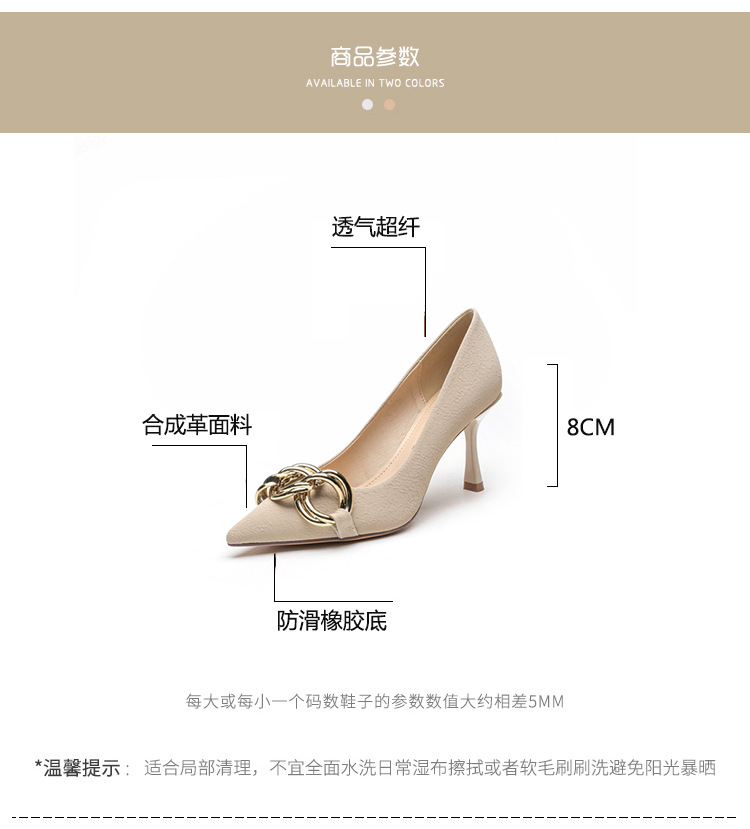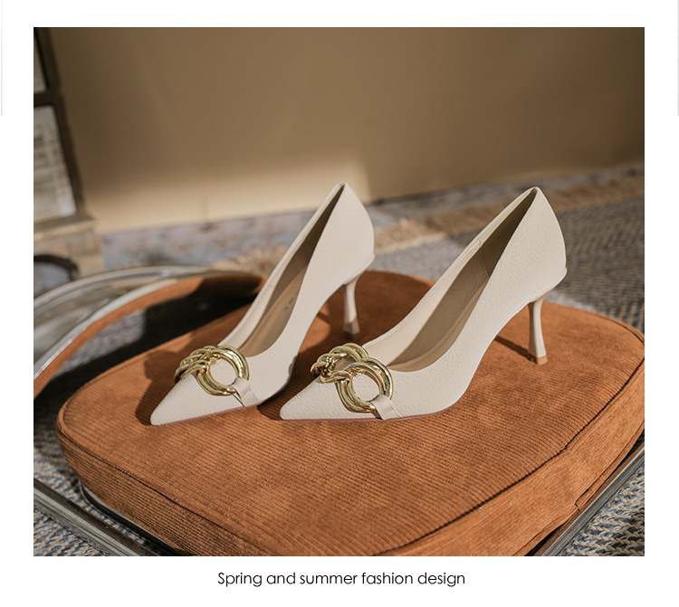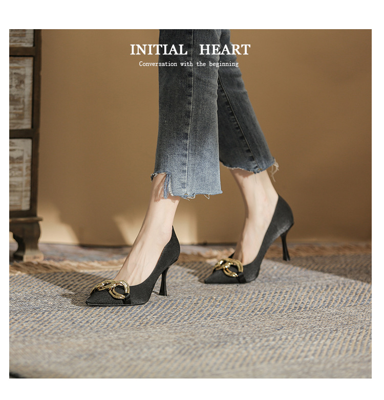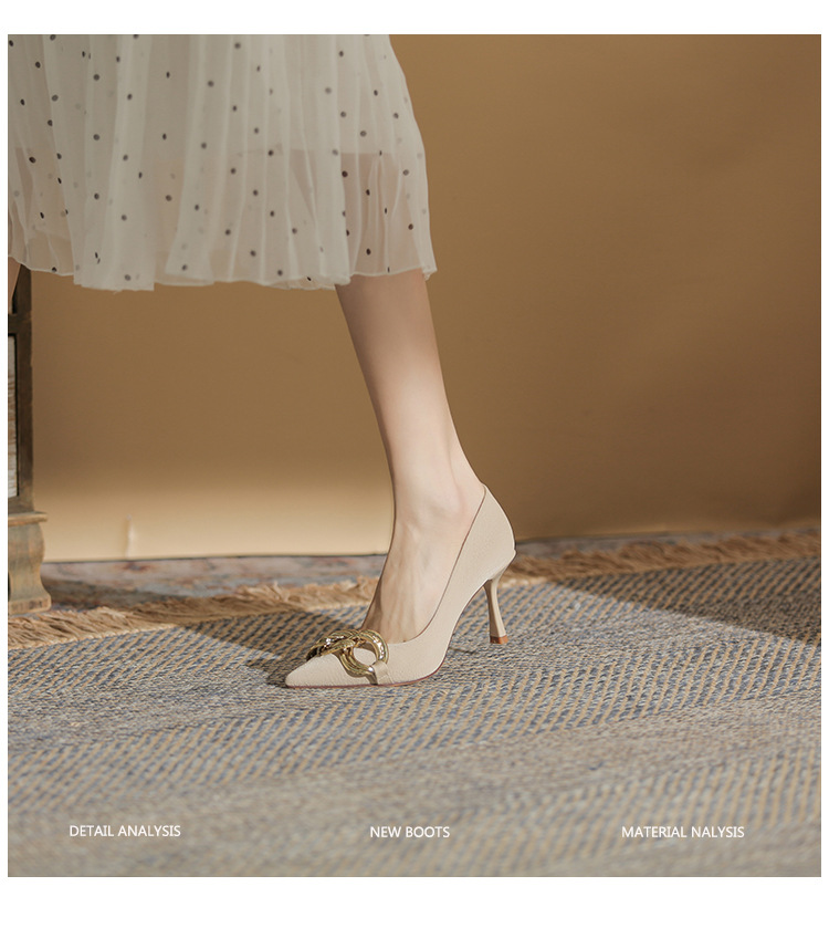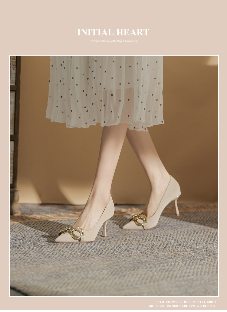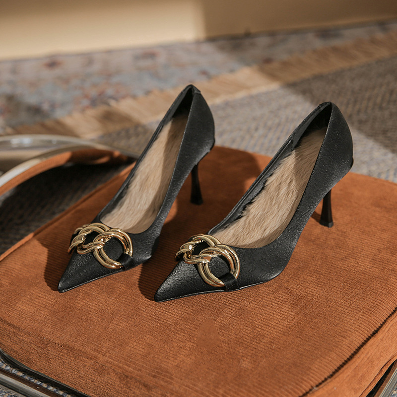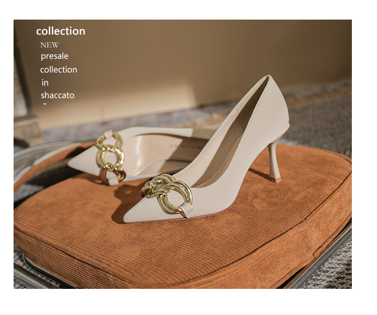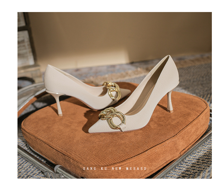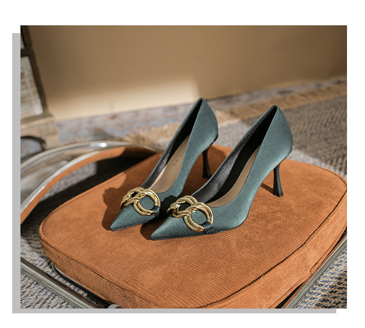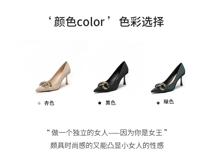Giày cao gót nữ thiết kế kiểu mũi nhọn, cổ thấp, phong cách châu Âu hiện đại. Điểm nhấn là chi tiết dây xích kim loại tinh tế phía trên, tạo nên vẻ thanh lịch và cá tính. Phần gót thanh mảnh giúp tôn dáng và tăng thêm phần nữ tính. Sản phẩm thích hợp để đi làm, dự tiệc hoặc tạo điểm nhấn cho các bộ trang phục hàng ngày. Khi sử dụng, nên chọn size vừa vặn và kết hợp với những bộ cánh yêu thích. | Tên sản phẩm: Giày Cao Gót Nữ Mũi Nhọn Gót Nhọn Hàng Mùa Xuân Thu Đông Phong Cách Âu Mỹ - Giày Dép Nữ | Mã sản phẩm: A1067 - Giá: 840.000đ | Mã nhà sản xuất: HUDS-G03Hình ảnh sản phẩm