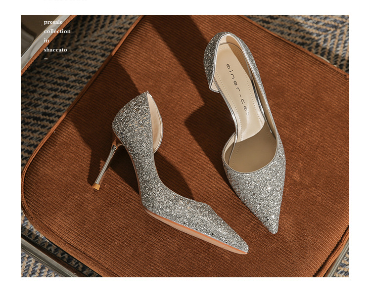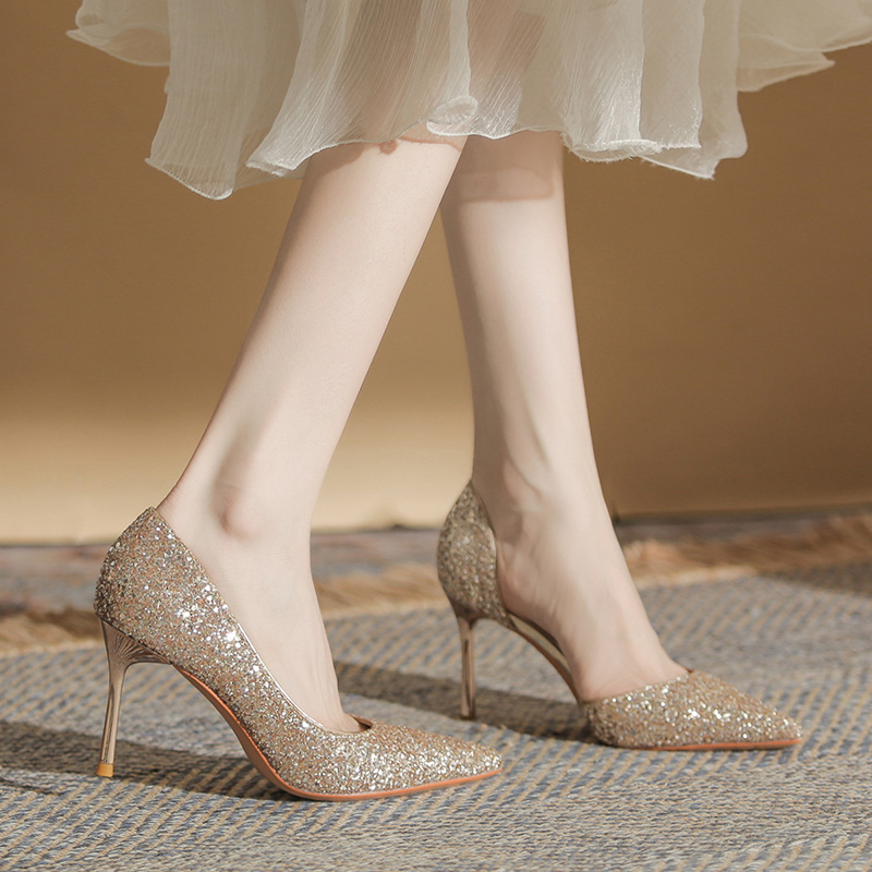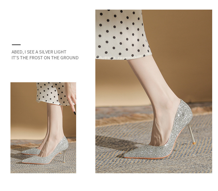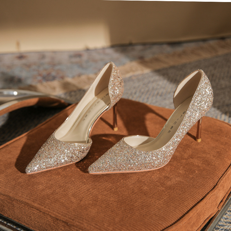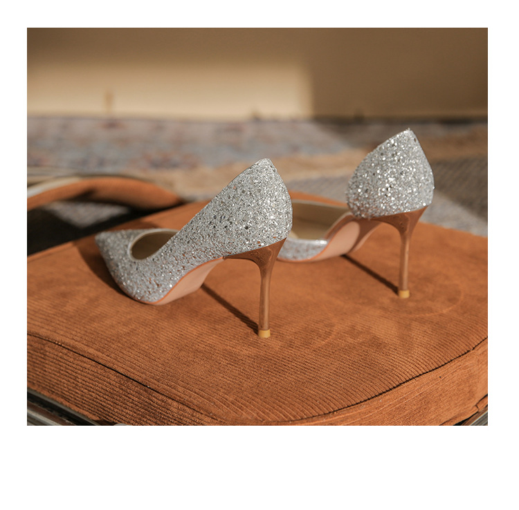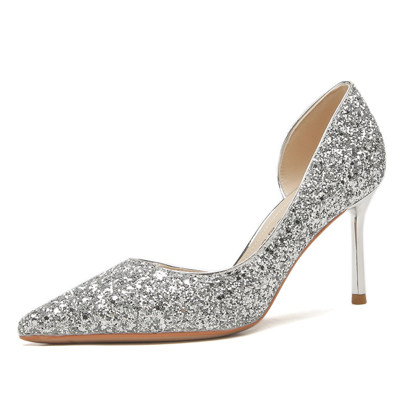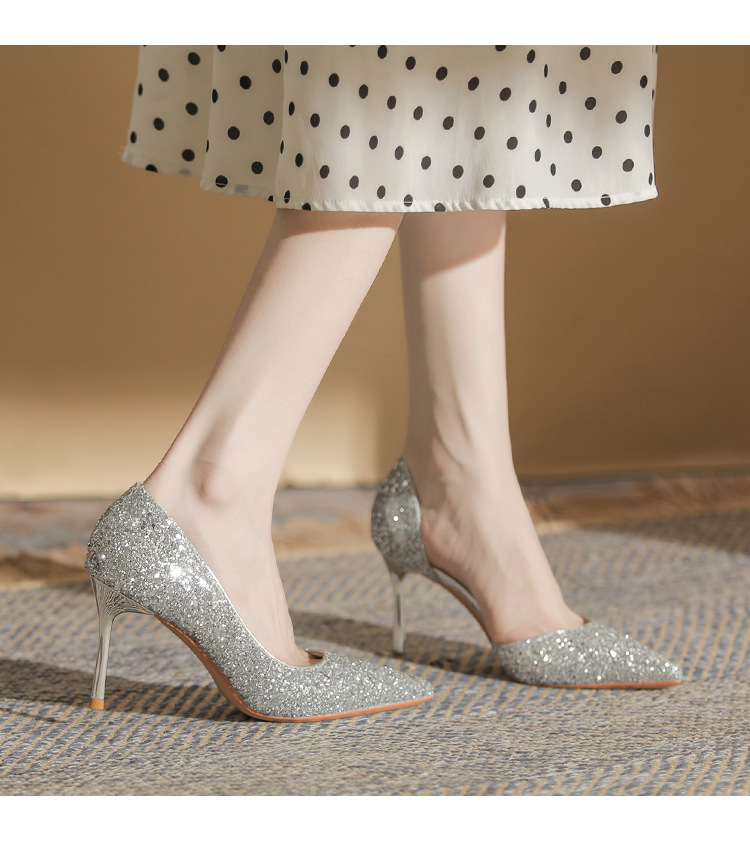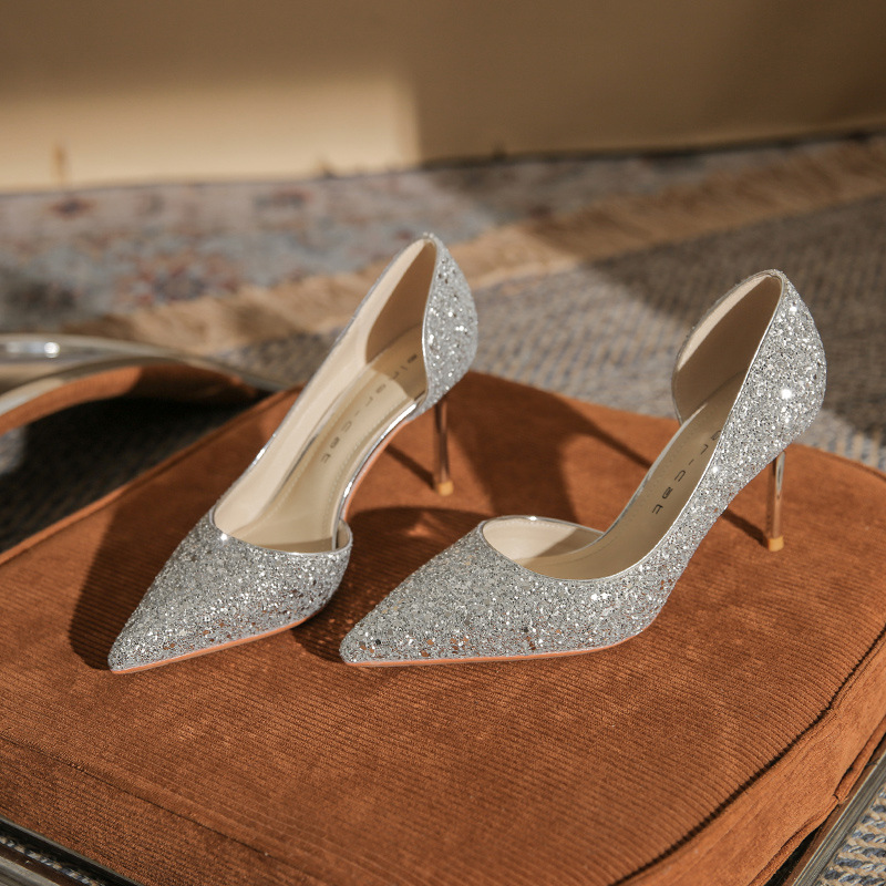 Đôi giày này có phần gót thon và mũi nhọn, tạo dáng thanh thoát. Chất liệu phủ ánh bạc lấp lánh như pha lê, phù hợp cho các dịp đặc biệt. Kiểu dáng được thiết kế mở nhẹ ở phần bên hông, giúp đôi chân thoải mái hơn. Bạn có thể dùng làm giày cho cô dâu hoặc bạn phụ dâu trong các buổi tiệc. Sử dụng bằng cách kết hợp cùng váy dài hoặc trang phục dự tiệc để tạo điểm nhấn. | Tên sản phẩm: Giày Cao Gót Nữ Mũi Nhọn Gót Nhọn Dùng Trong Lễ Cưới - Giày Dép Nữ | Mã sản phẩm: A1089 - Giá: 800.000đ | Mã nhà sản xuất: HUDS-G02Hình ảnh sản phẩm