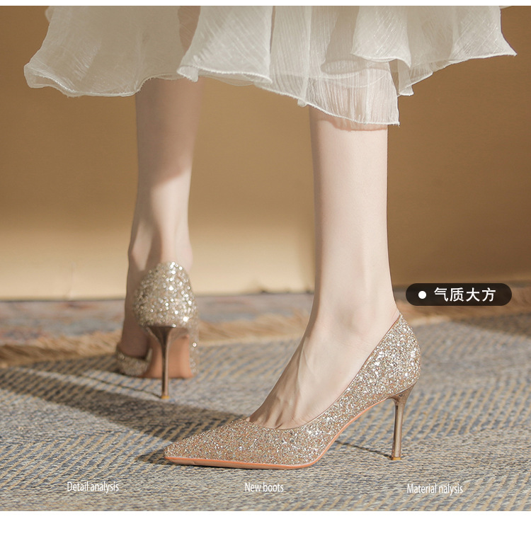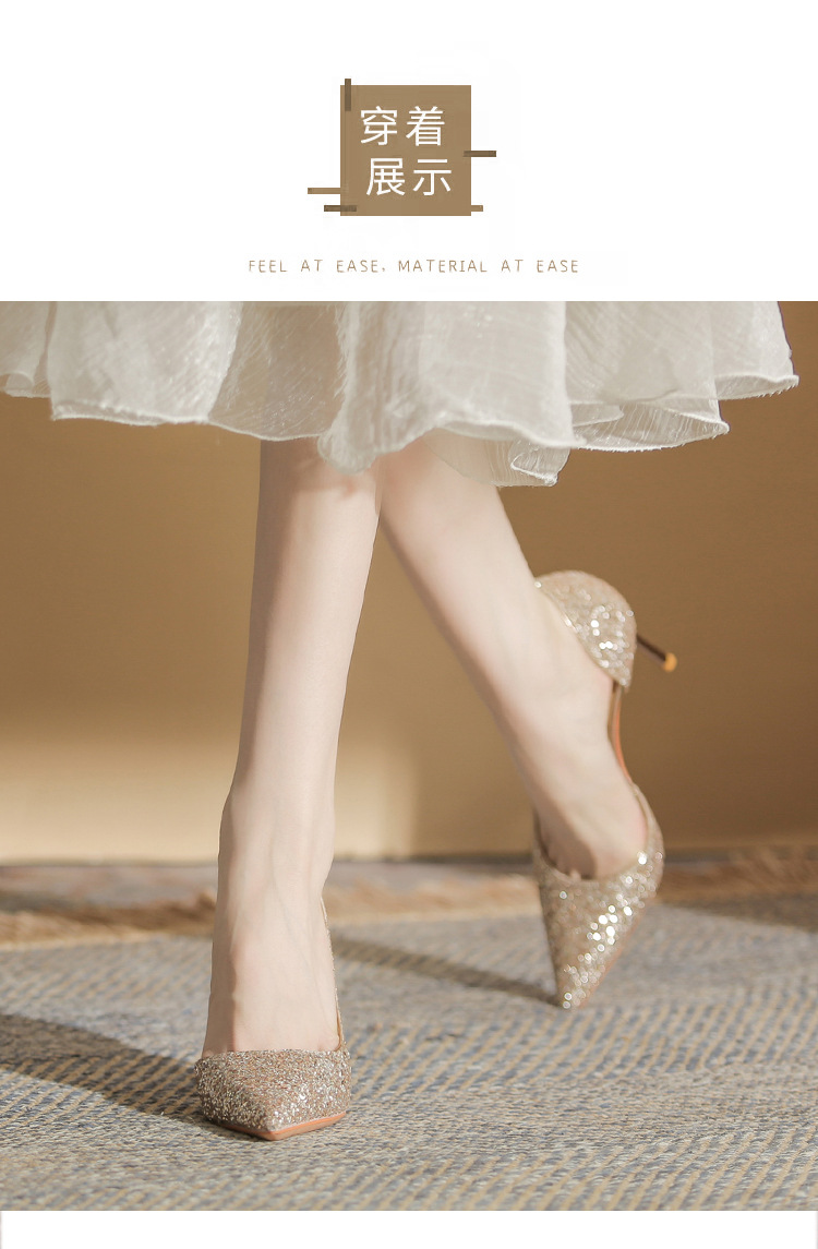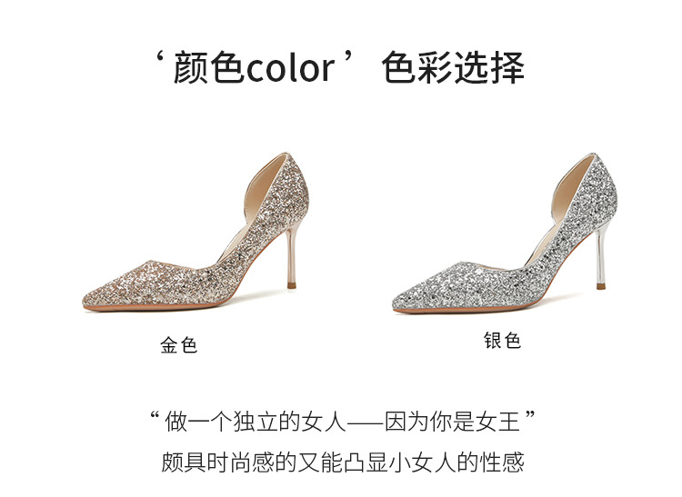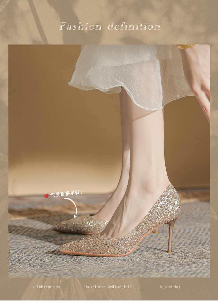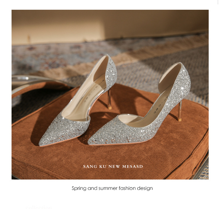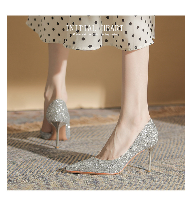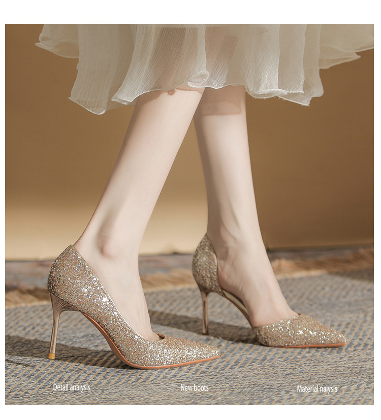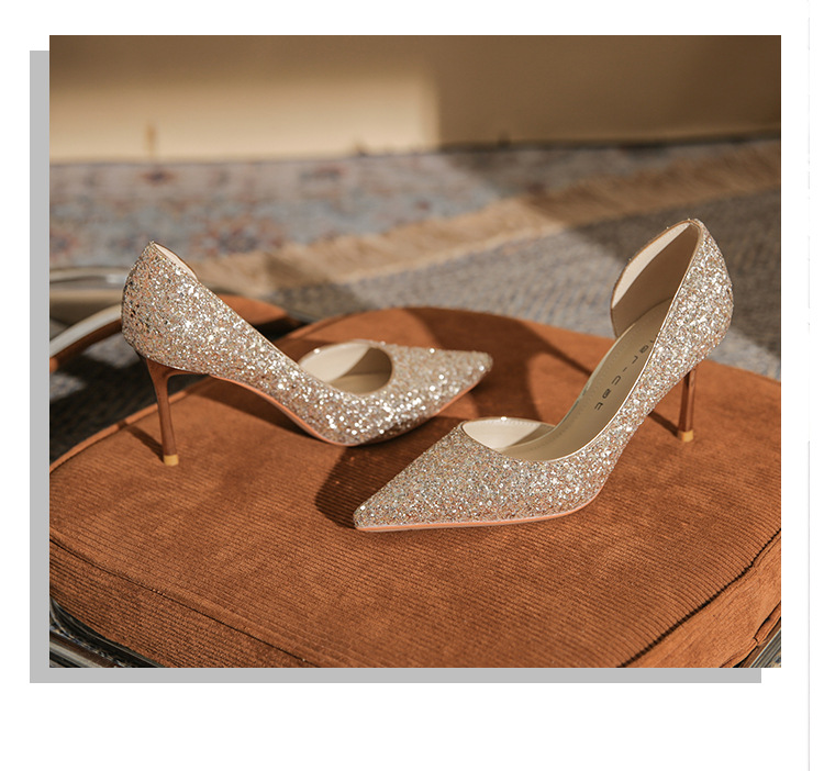 Đôi giày này có phần gót thon và mũi nhọn, tạo dáng thanh thoát. Chất liệu phủ ánh bạc lấp lánh như pha lê, phù hợp cho các dịp đặc biệt. Kiểu dáng được thiết kế mở nhẹ ở phần bên hông, giúp đôi chân thoải mái hơn. Bạn có thể dùng làm giày cho cô dâu hoặc bạn phụ dâu trong các buổi tiệc. Sử dụng bằng cách kết hợp cùng váy dài hoặc trang phục dự tiệc để tạo điểm nhấn. | Tên sản phẩm: Giày Cao Gót Nữ Mũi Nhọn Gót Nhọn Dùng Trong Lễ Cưới - Giày Dép Nữ | Mã sản phẩm: A1089 - Giá: 800.000đ | Mã nhà sản xuất: HUDS-G02Hình ảnh sản phẩm