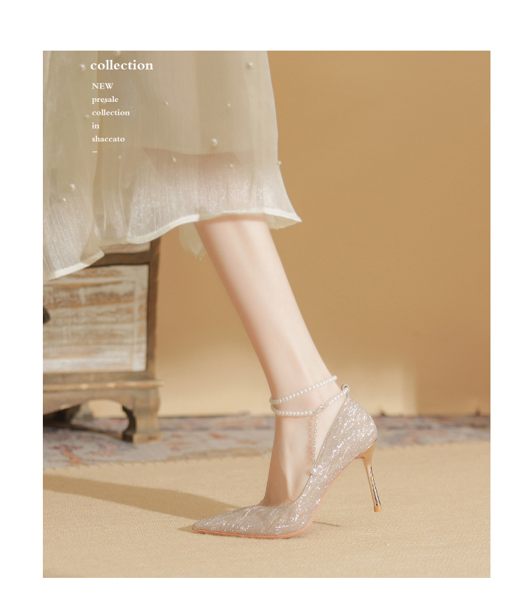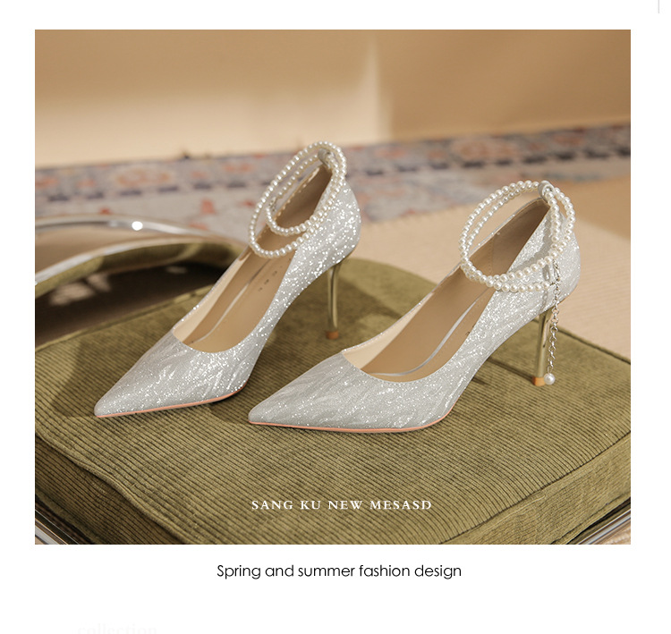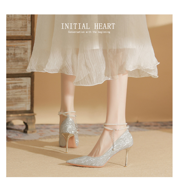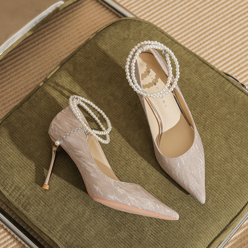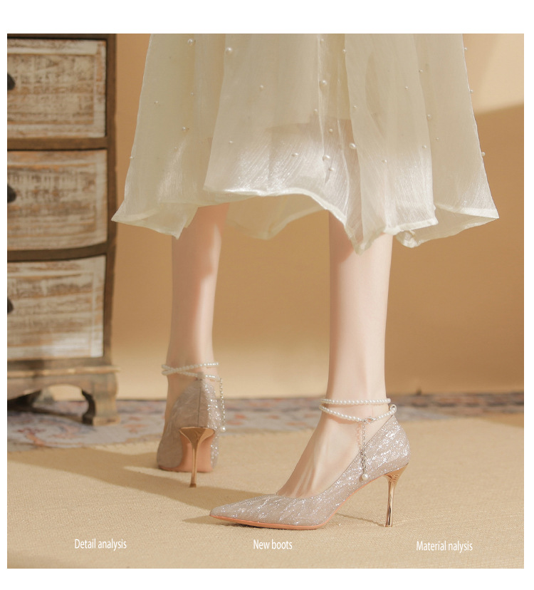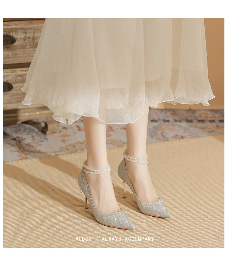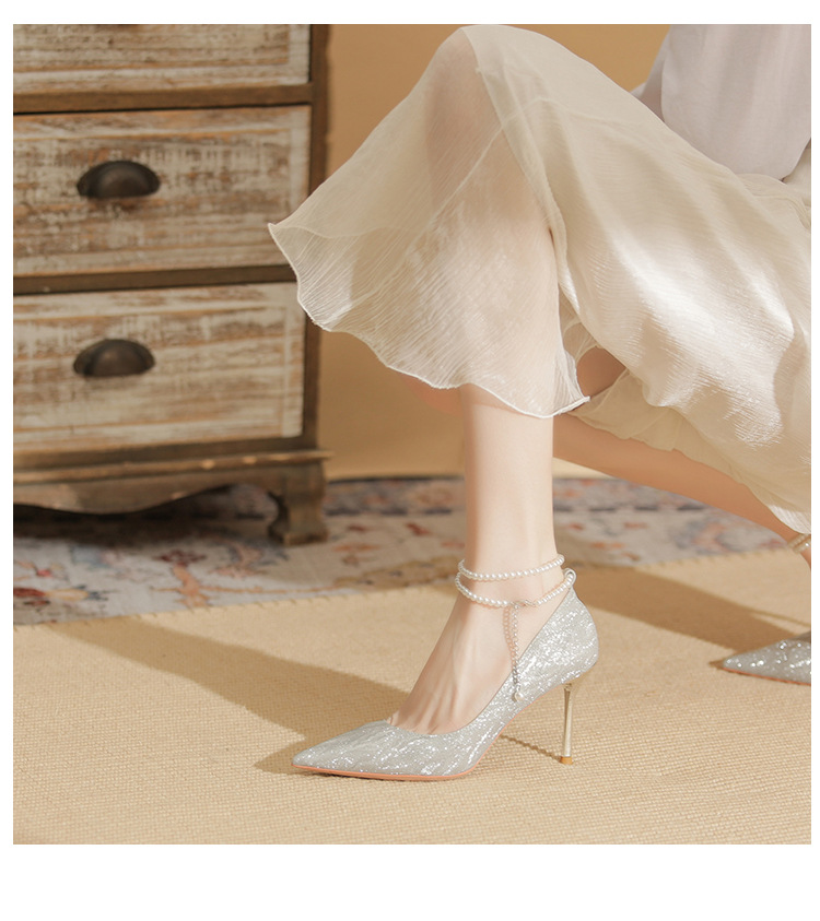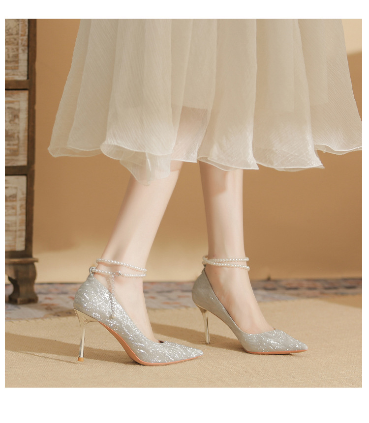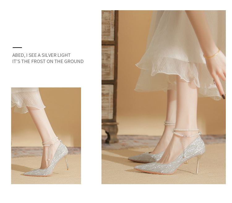 Đôi giày cao gót này có phần mũi nhọn thanh lịch, đi kèm gót nhọn vừa phải giúp tôn dáng. Chất liệu bóng nhẹ tạo điểm nhấn cùng những viên ngọc tr nhỏ xinh được đính tinh tế trên dây đeo có thể điều chỉnh. Sản phẩm thích hợp để mang trong các buổi tiệc hoặc sự kiện. Bạn chỉ cần quấn dây đeo quanh cổ chân và cố định lại là đã có một phong cách hoàn chỉnh. | Tên sản phẩm: Giày Cao Gót Nữ Mũi Nhọn Gót Nhọn Hàng Mùa Xuân Thu Đông Dùng Trong Lễ Cưới - Giày Dép Nữ | Mã sản phẩm: A1094 - Giá: 870.000đ | Mã nhà sản xuất: HUDS-G03Hình ảnh sản phẩm