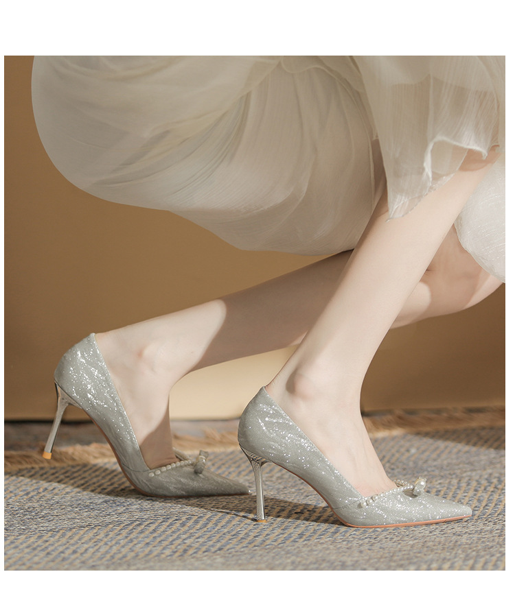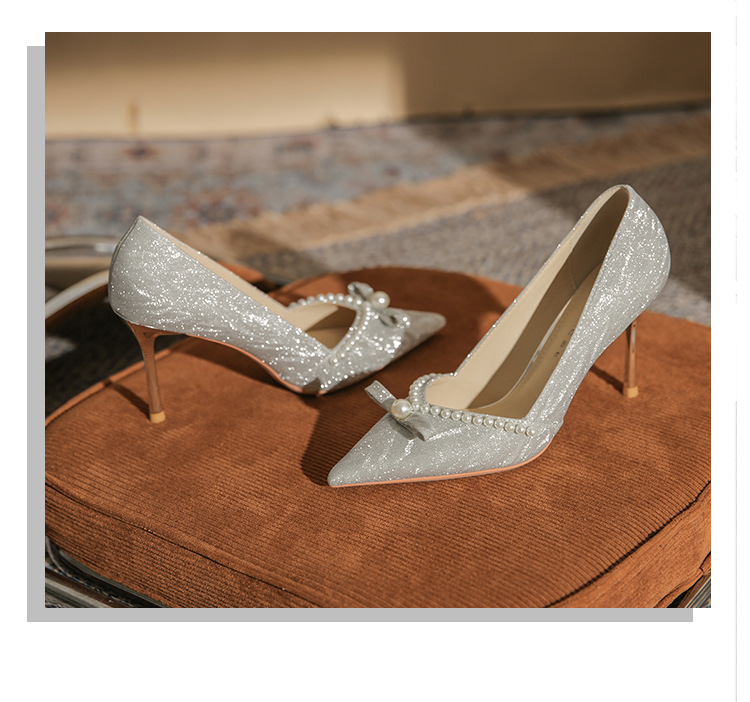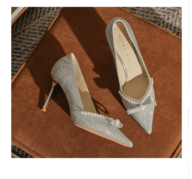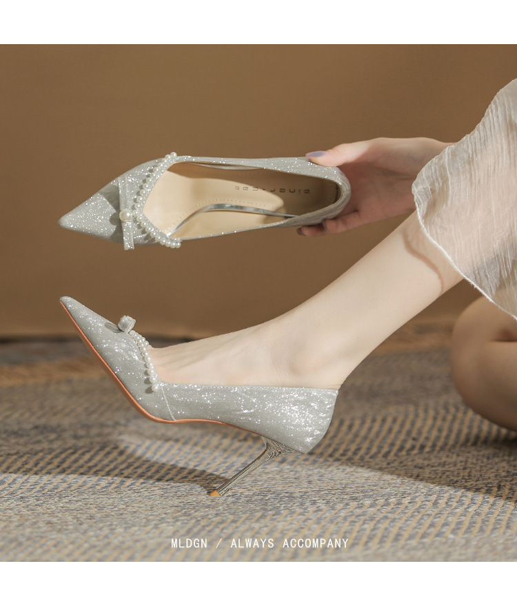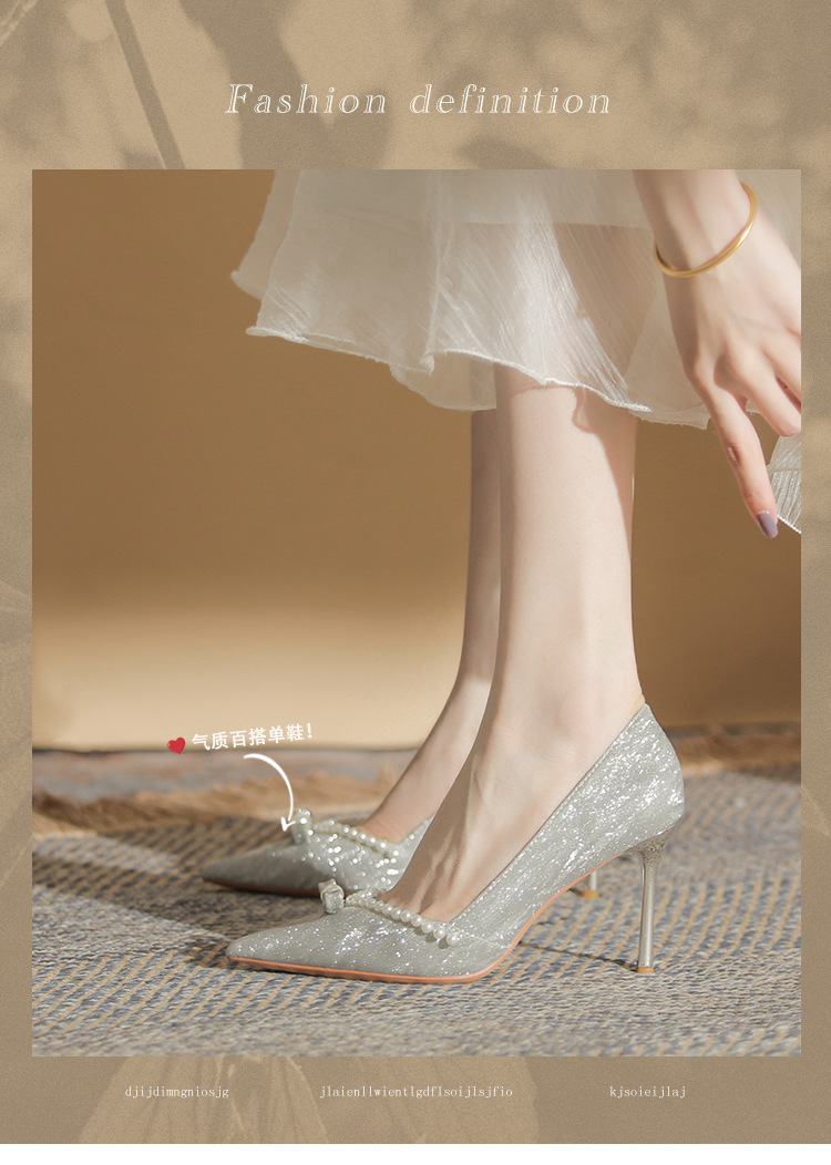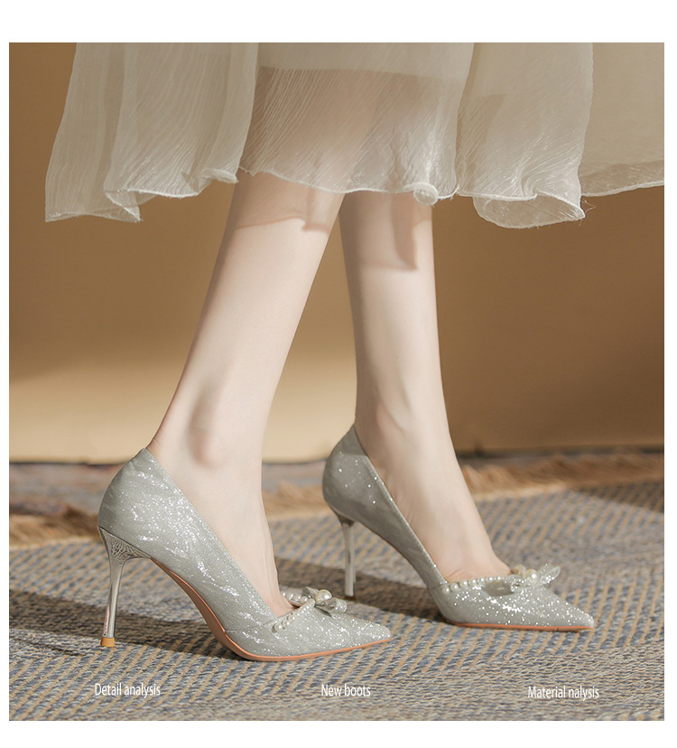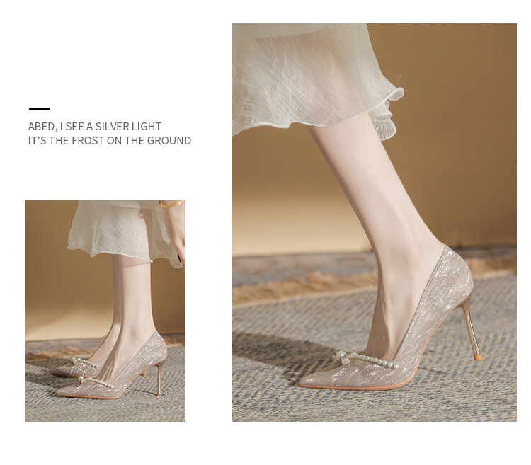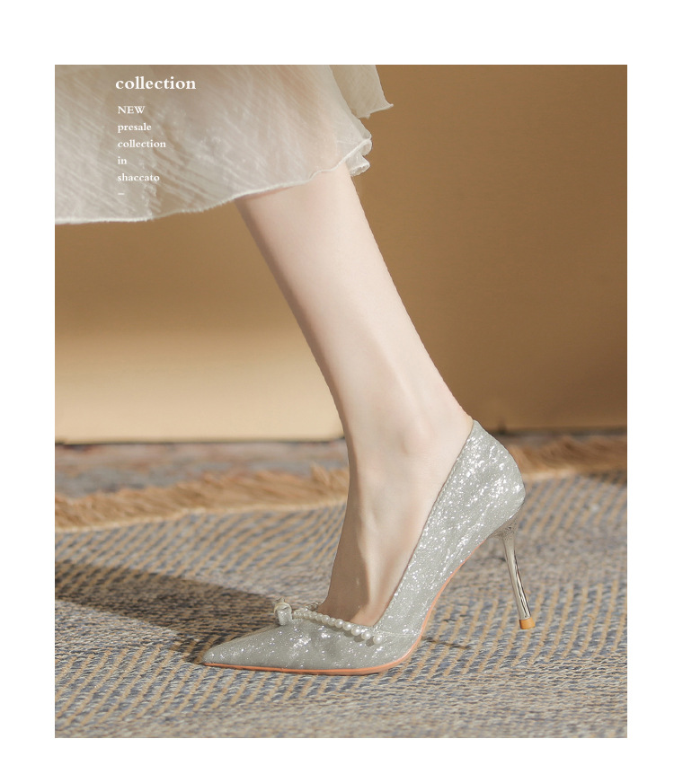 Đôi giày cao gót này có phần mũi nhọn và cổ giày thấp, tạo nên vẻ thanh thoát. Gót nhọn vừa phải giúp tôn dáng. Điểm nhấn là những hạt ngọc tr và pha lê lấp lánh được kết hợp tinh tế cùng lớp ánh kim từ chất liệu vải. Sản phẩm phù hợp cho các buổi tiệc hoặc ngày trọng đại. Bạn chỉ cần xỏ chân vào và cài qu gót là đã sẵn sàng để bước đi tự tin. | Tên sản phẩm: Giày Cao Gót Nữ Mũi Nhọn Gót Nhọn Dùng Trong Lễ Cưới - Giày Dép Nữ | Mã sản phẩm: A1115 - Giá: 870.000đ | Mã nhà sản xuất: HUDS-G03Hình ảnh sản phẩm