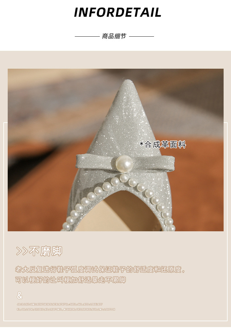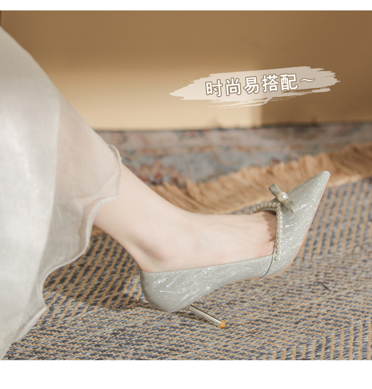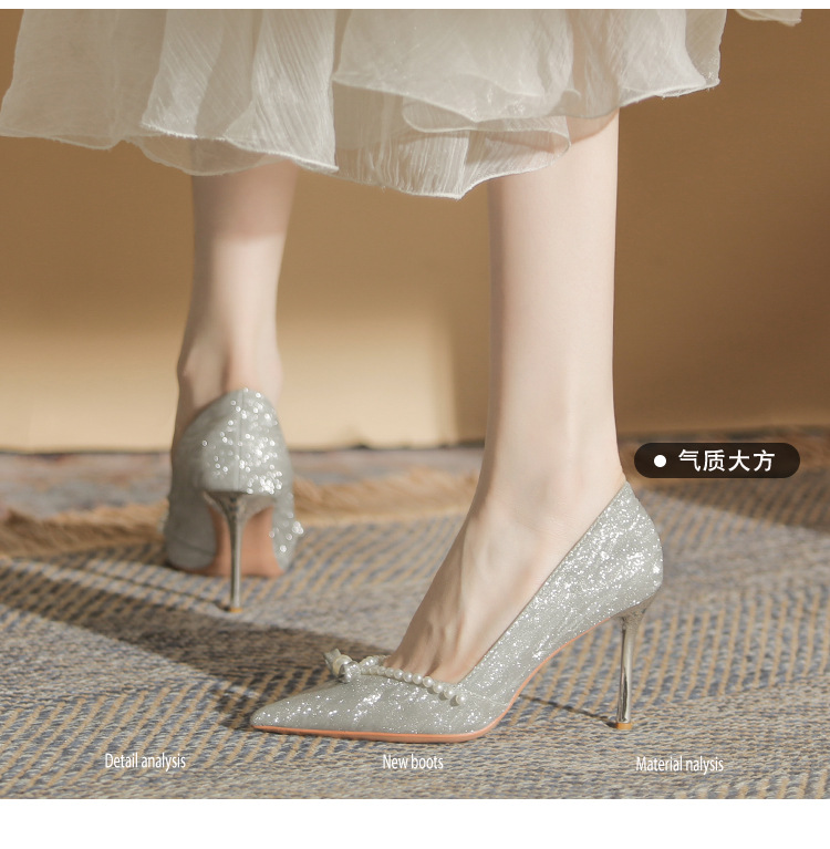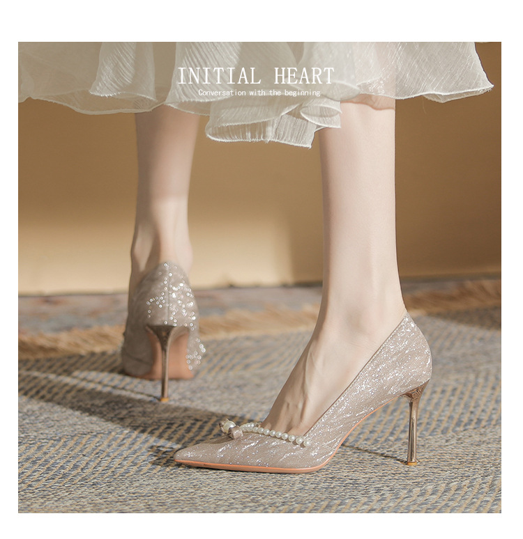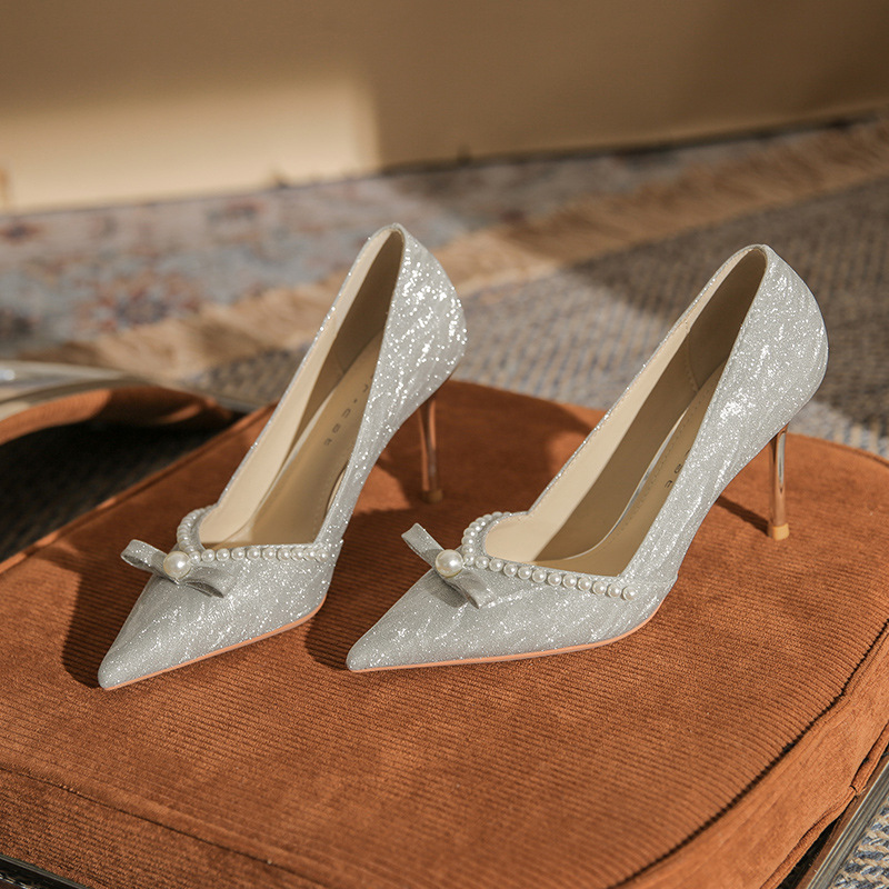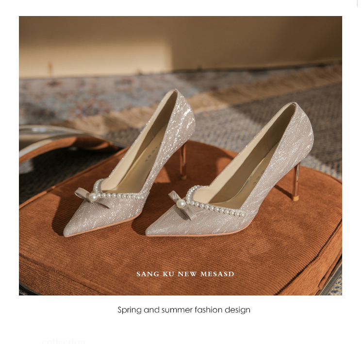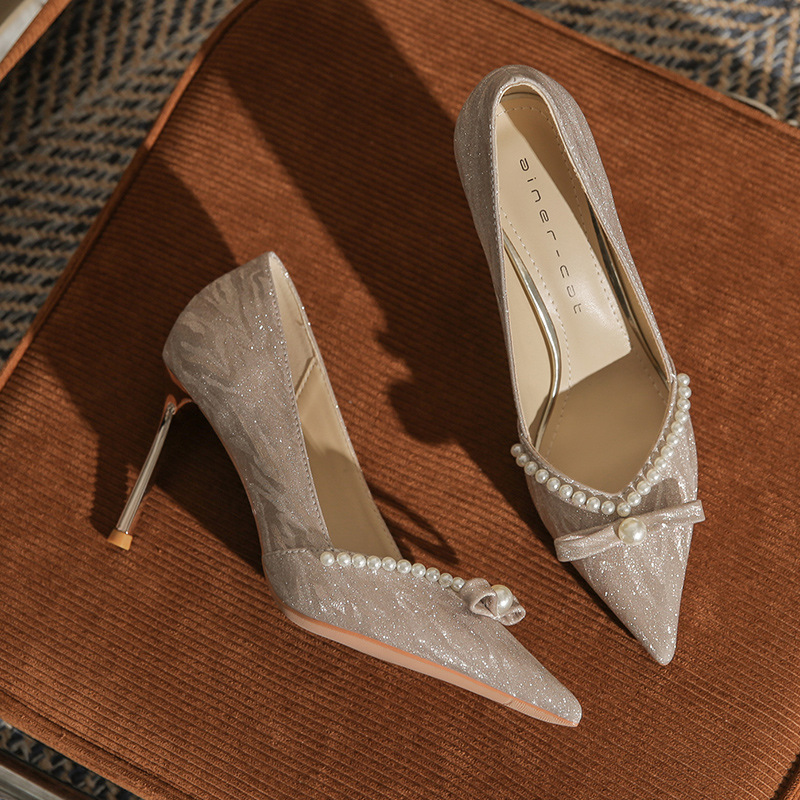 Đôi giày cao gót này có phần mũi nhọn và cổ giày thấp, tạo nên vẻ thanh thoát. Gót nhọn vừa phải giúp tôn dáng. Điểm nhấn là những hạt ngọc tr và pha lê lấp lánh được kết hợp tinh tế cùng lớp ánh kim từ chất liệu vải. Sản phẩm phù hợp cho các buổi tiệc hoặc ngày trọng đại. Bạn chỉ cần xỏ chân vào và cài qu gót là đã sẵn sàng để bước đi tự tin. | Tên sản phẩm: Giày Cao Gót Nữ Mũi Nhọn Gót Nhọn Dùng Trong Lễ Cưới - Giày Dép Nữ | Mã sản phẩm: A1115 - Giá: 870.000đ | Mã nhà sản xuất: HUDS-G03Hình ảnh sản phẩm