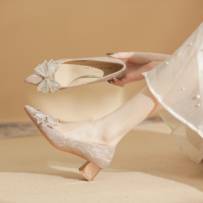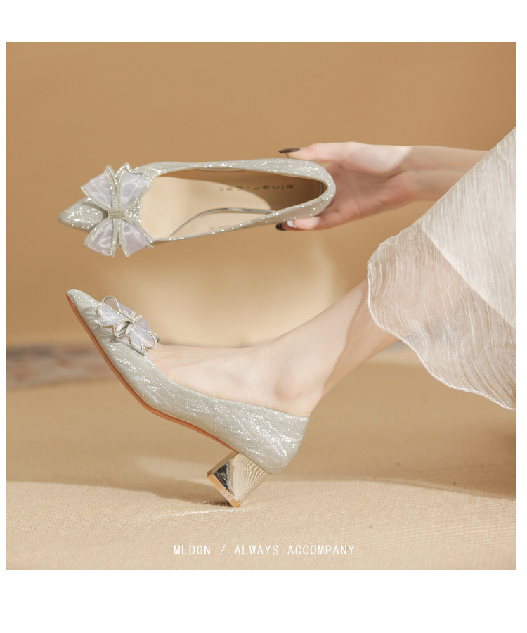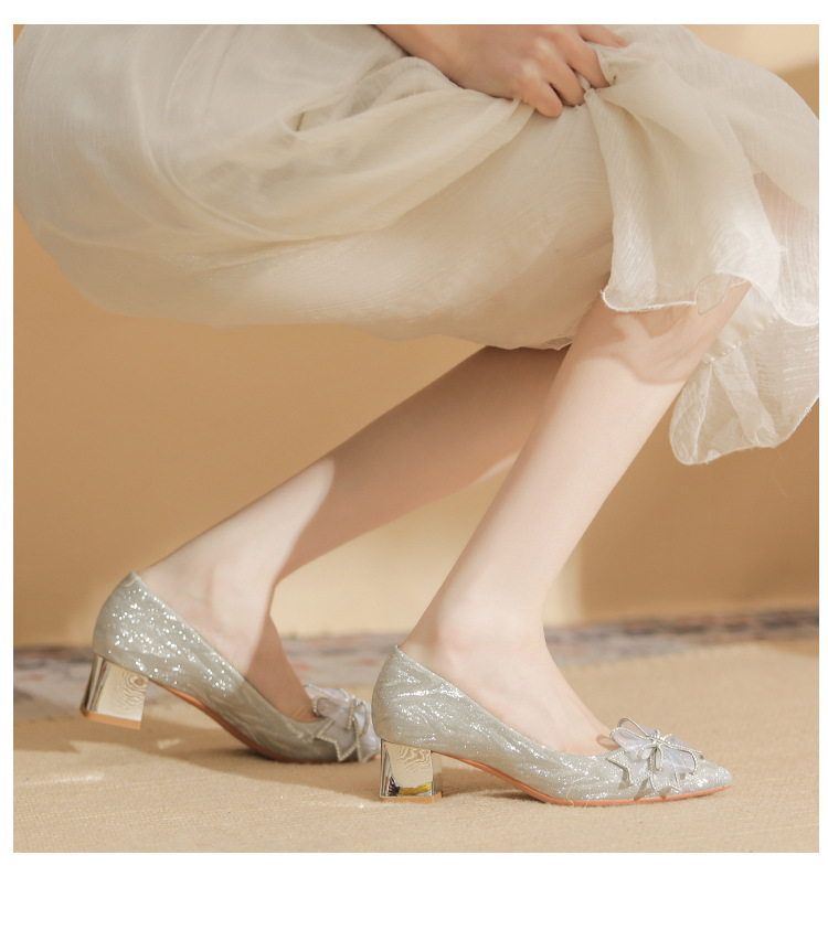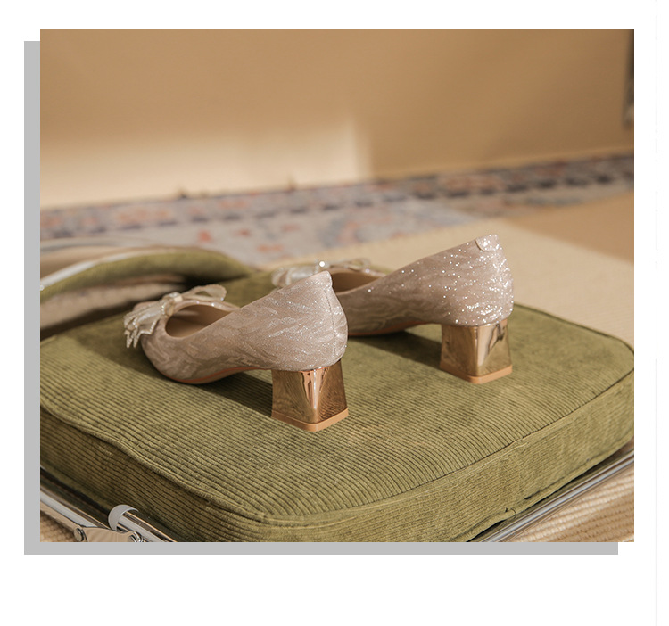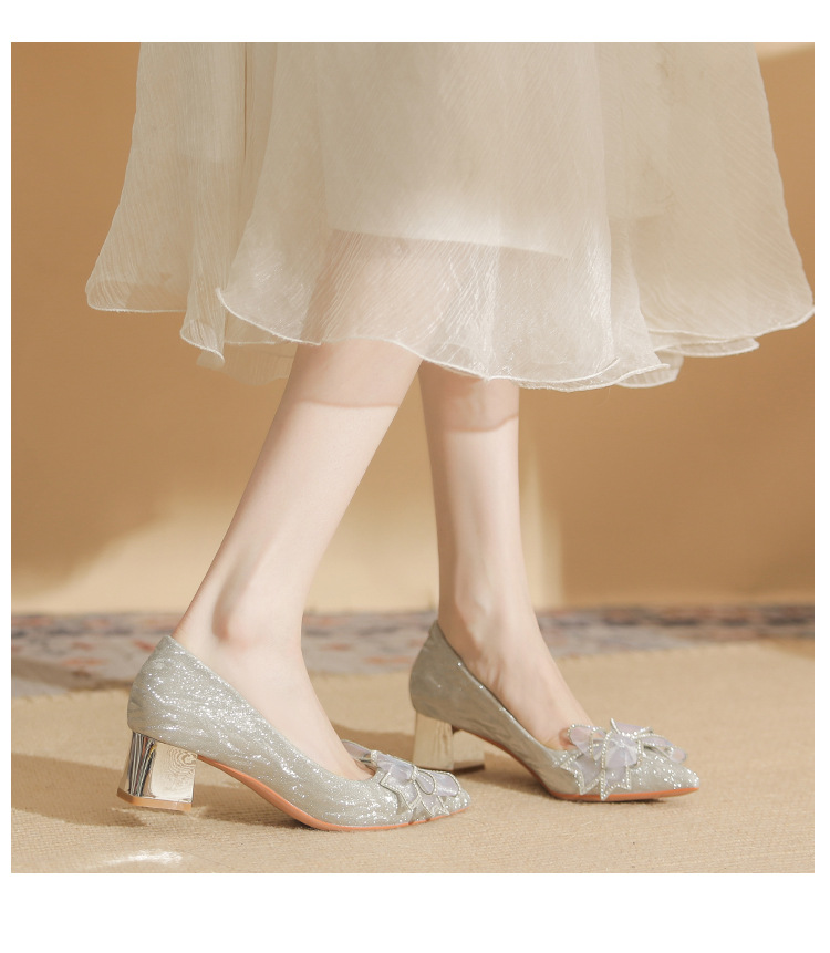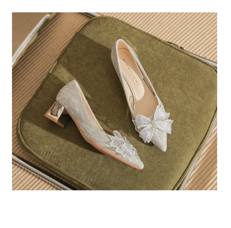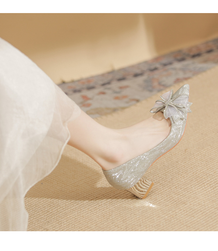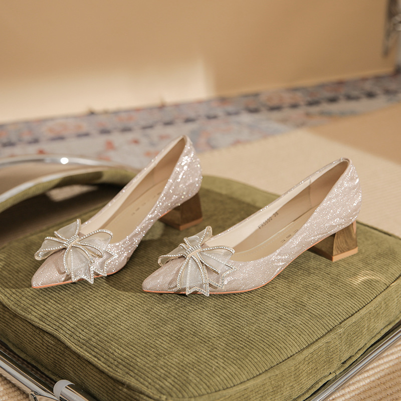 Giày cao gót dành cho nữ, kiểu mũi nhọn, sử dụng được nhiều dịp. Mẫu mã mới cho mùa xuân 2024. Gót thấp vững chãi, dễ dàng di chuyển. Điểm nhấn là nơ thắt trang nhã phía trước và chất liệu bạc lấp lánh như pha lê. Rất phù hợp cho các buổi tiệc hoặc sử dụng trong ngày cưới. Cách dùng đơn giản, chỉ cần xỏ chân vào và cột nơ cho gọn gàng. | Tên sản phẩm: Giày Cao Gót Nữ Thắt Nơ Bướm Mũi Nhọn Gót Vuông Hàng Mùa Xuân Thu Đông Dùng Trong Lễ Cưới - Giày Dép Nữ | Mã sản phẩm: A1174 - Giá: 870.000đ | Mã nhà sản xuất: HUDS-G03Hình ảnh sản phẩm