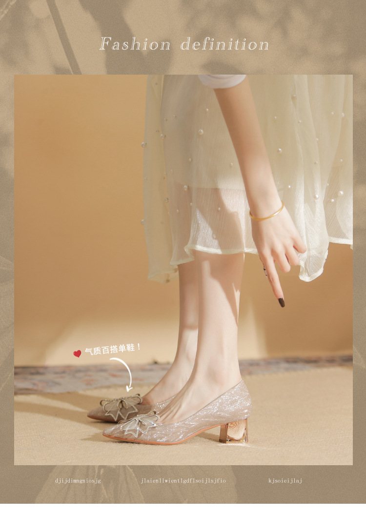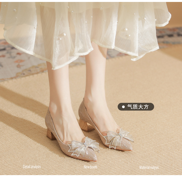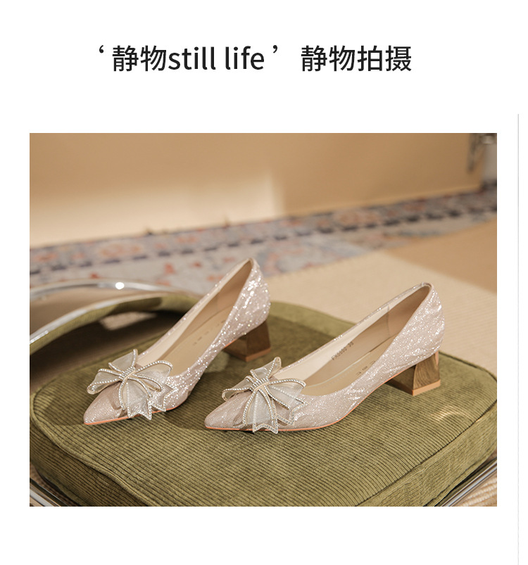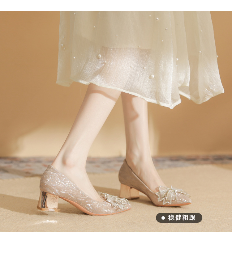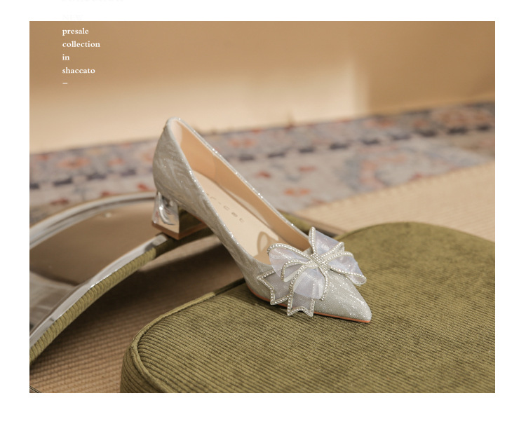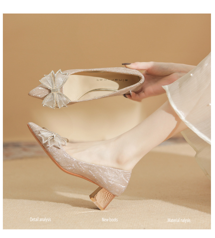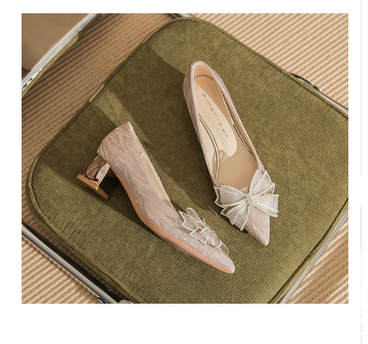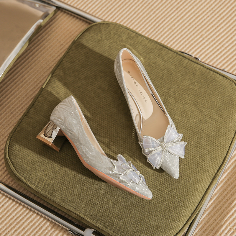 Giày cao gót dành cho nữ, kiểu mũi nhọn, sử dụng được nhiều dịp. Mẫu mã mới cho mùa xuân 2024. Gót thấp vững chãi, dễ dàng di chuyển. Điểm nhấn là nơ thắt trang nhã phía trước và chất liệu bạc lấp lánh như pha lê. Rất phù hợp cho các buổi tiệc hoặc sử dụng trong ngày cưới. Cách dùng đơn giản, chỉ cần xỏ chân vào và cột nơ cho gọn gàng. | Tên sản phẩm: Giày Cao Gót Nữ Thắt Nơ Bướm Mũi Nhọn Gót Vuông Hàng Mùa Xuân Thu Đông Dùng Trong Lễ Cưới - Giày Dép Nữ | Mã sản phẩm: A1174 - Giá: 870.000đ | Mã nhà sản xuất: HUDS-G03Hình ảnh sản phẩm