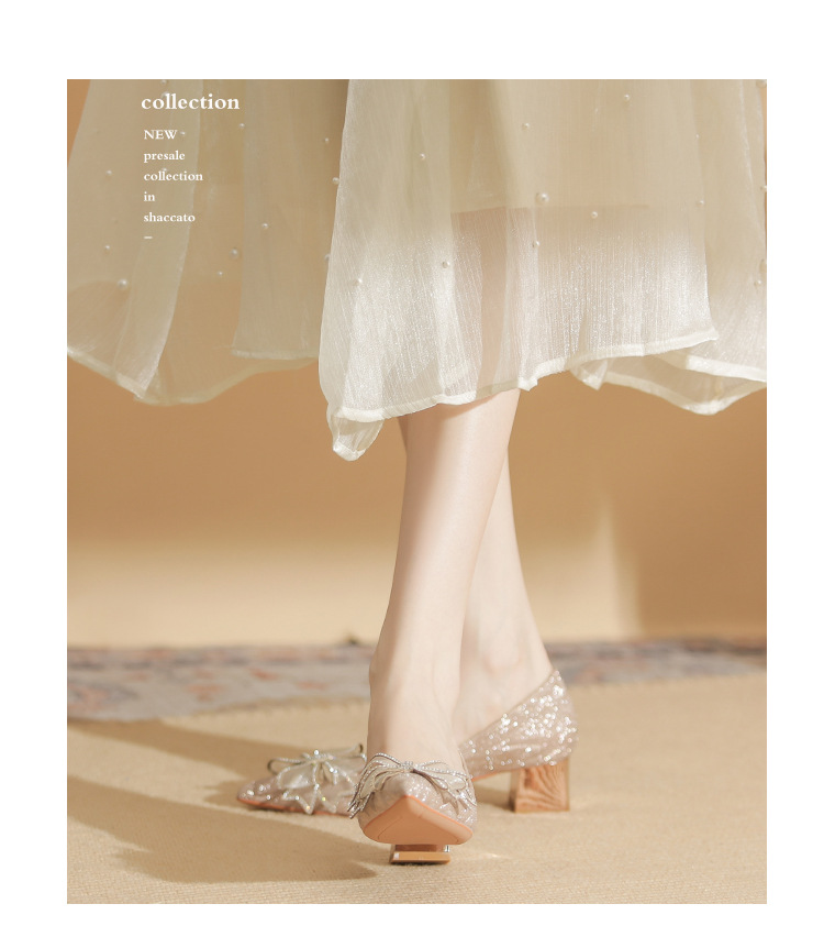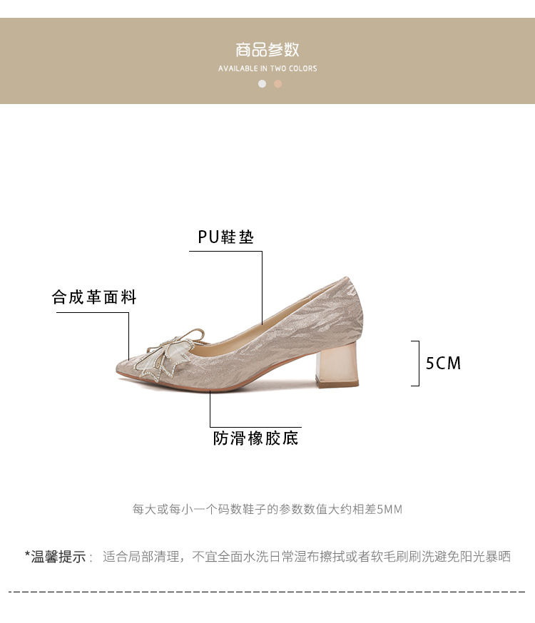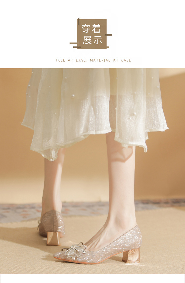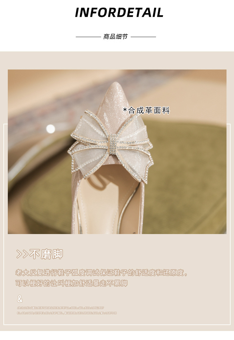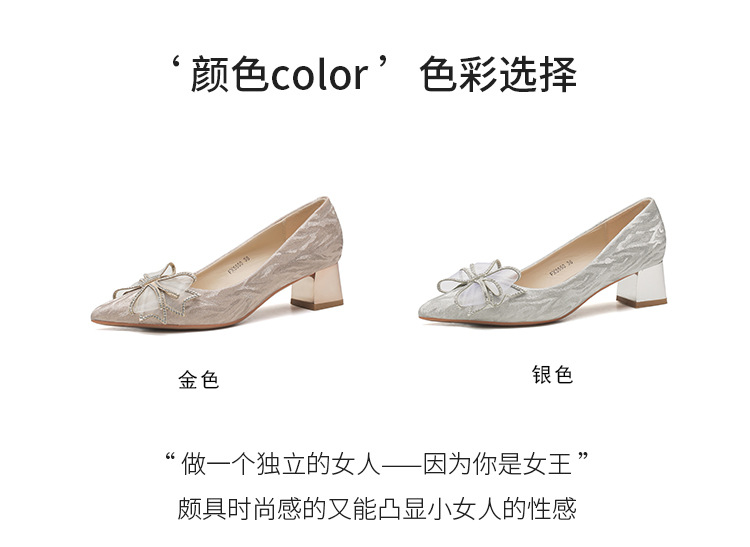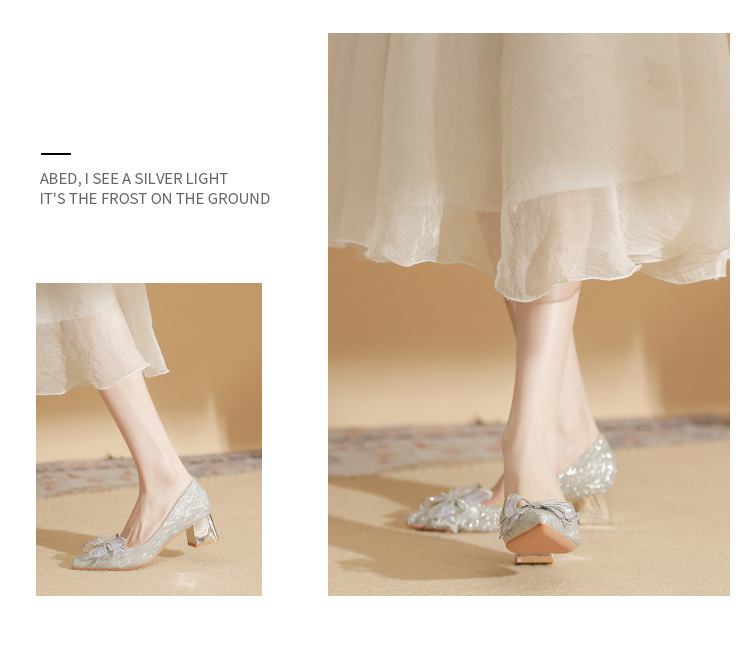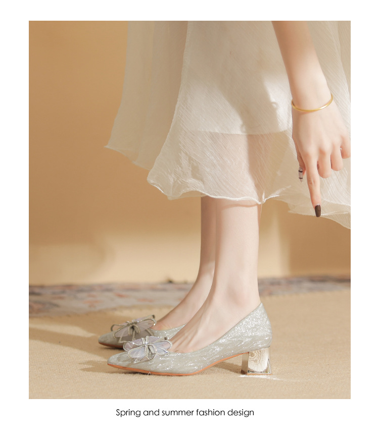 Giày cao gót dành cho nữ, kiểu mũi nhọn, sử dụng được nhiều dịp. Mẫu mã mới cho mùa xuân 2024. Gót thấp vững chãi, dễ dàng di chuyển. Điểm nhấn là nơ thắt trang nhã phía trước và chất liệu bạc lấp lánh như pha lê. Rất phù hợp cho các buổi tiệc hoặc sử dụng trong ngày cưới. Cách dùng đơn giản, chỉ cần xỏ chân vào và cột nơ cho gọn gàng. | Tên sản phẩm: Giày Cao Gót Nữ Thắt Nơ Bướm Mũi Nhọn Gót Vuông Hàng Mùa Xuân Thu Đông Dùng Trong Lễ Cưới - Giày Dép Nữ | Mã sản phẩm: A1174 - Giá: 870.000đ | Mã nhà sản xuất: HUDS-G03Hình ảnh sản phẩm