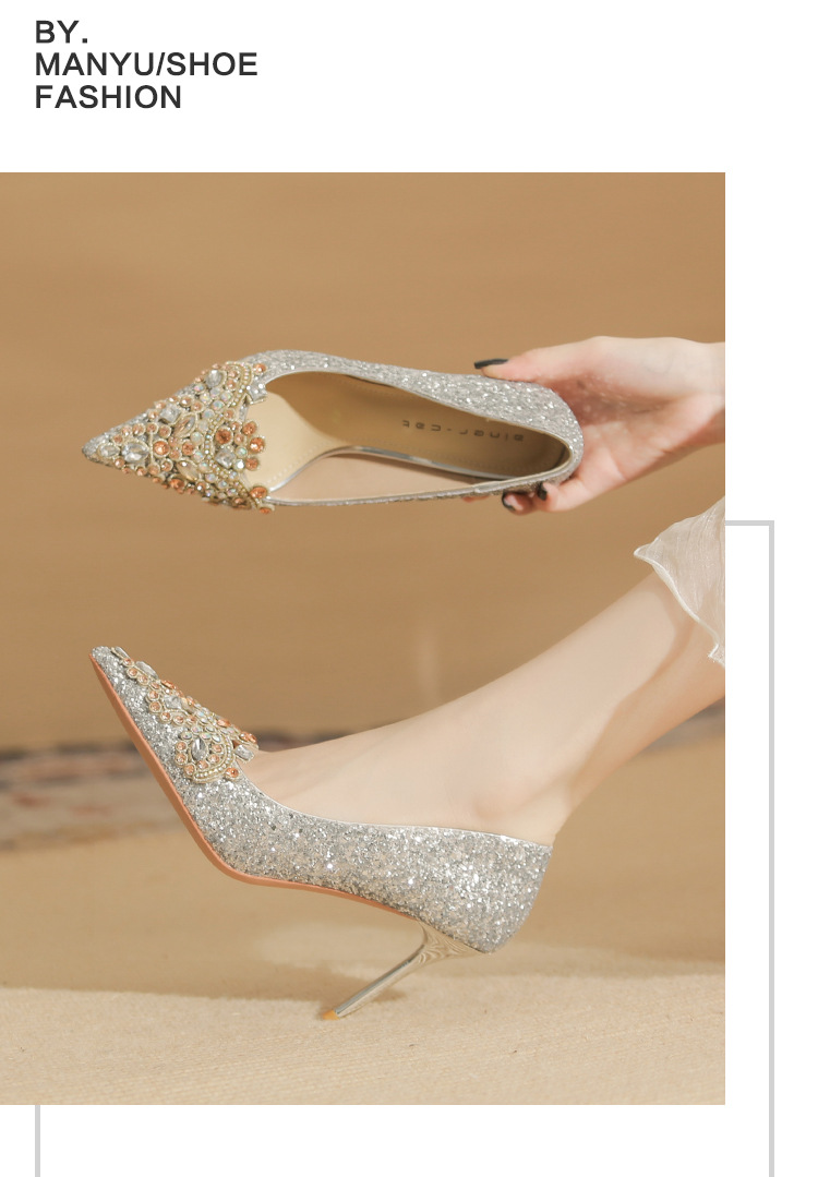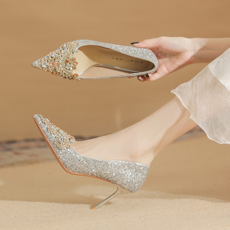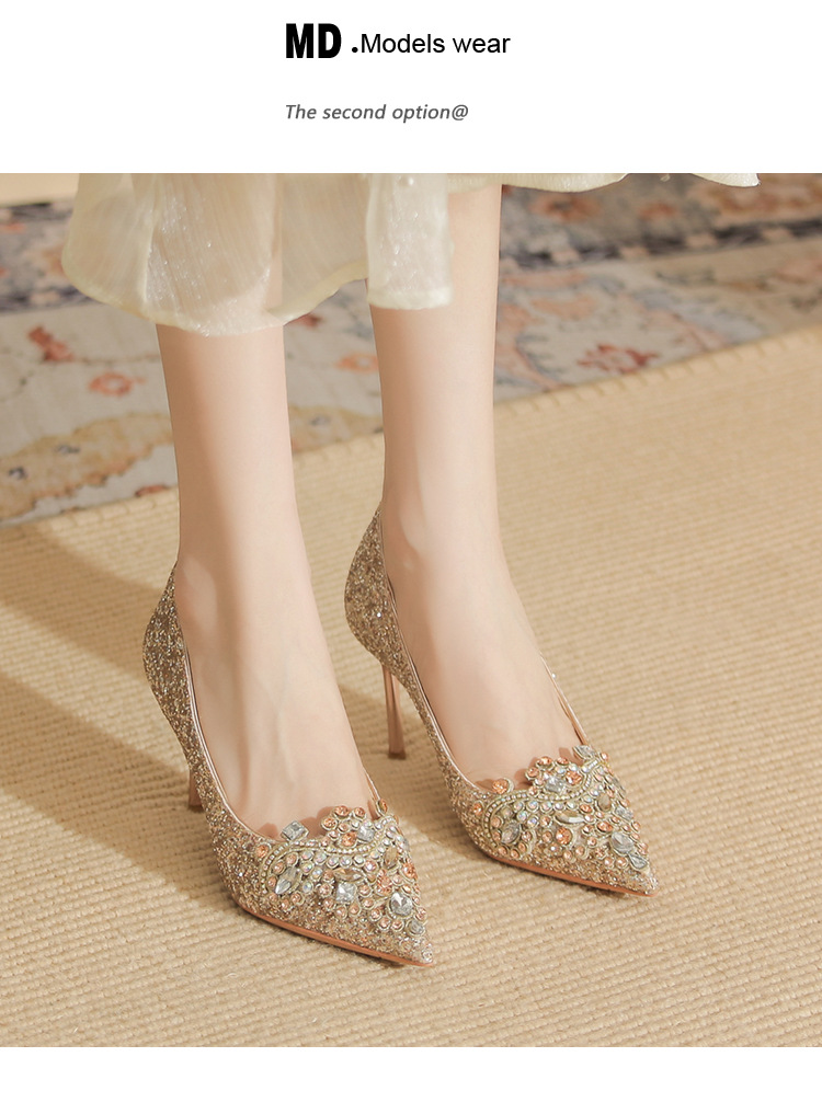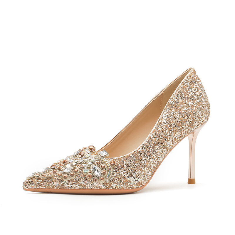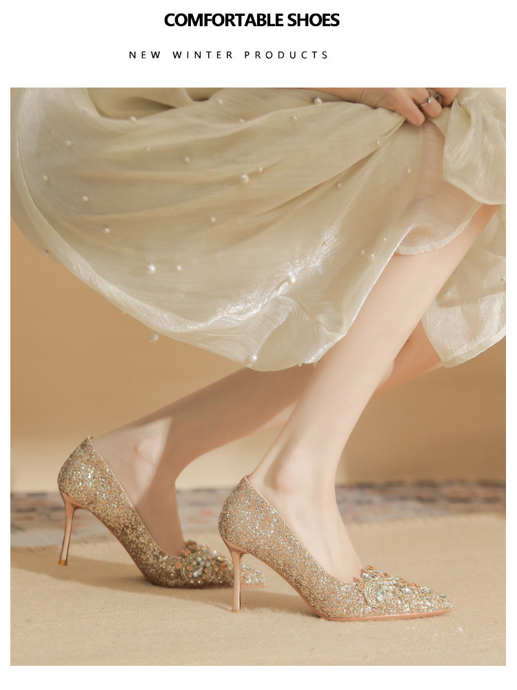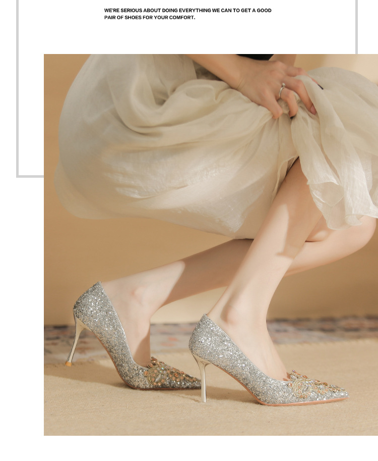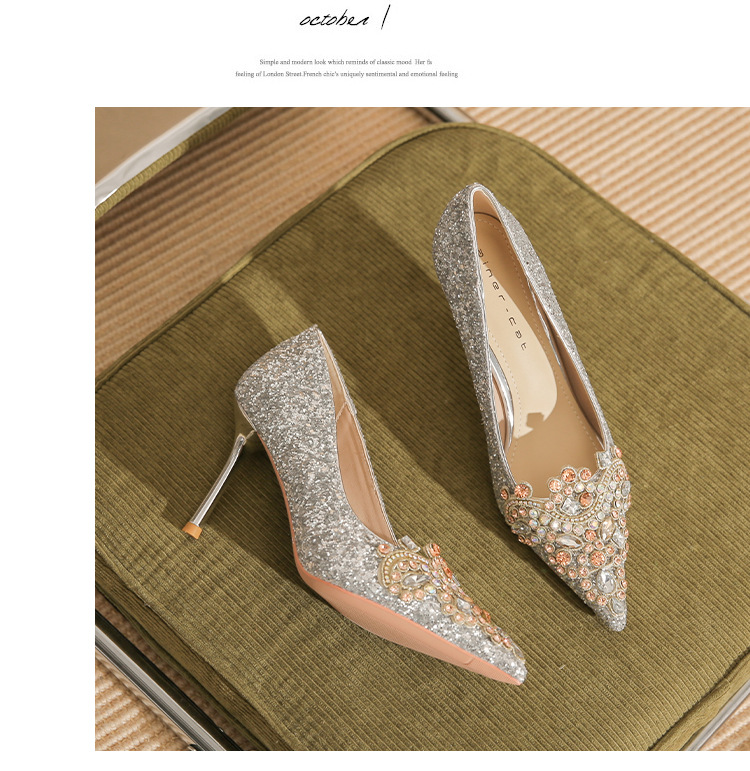Đôi giày này có phần gót thon, mũi nhọn và cổ thấp, rất phù hợp cho các dịp đặc biệt. Bề mặt giày được trang trí bằng những hạt pha lê lấp lánh và miếng ánh sáng nhỏ, tạo nên vẻ đẹp tinh tế. Kiểu dáng thanh lịch, dễ dàng kết hợp với nhiều loại trang phục khác nhau. Khi sử dụng, bạn nên chọn kích cỡ vừa vặn và hạn chế tiếp xúc với nước để giữ giày được bền đẹp. | Tên sản phẩm: Giày Cao Gót Nữ Gắn Đá Mũi Nhọn Gót Nhọn Hàng Mùa Xuân Thu Đông Dùng Trong Lễ Cưới - Giày Dép Nữ | Mã sản phẩm: A1226 - Giá: 890.000đ | Mã nhà sản xuất: HUDS-G03Hình ảnh sản phẩm