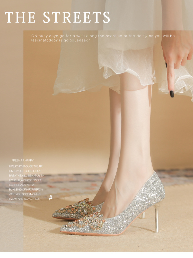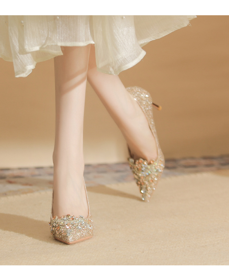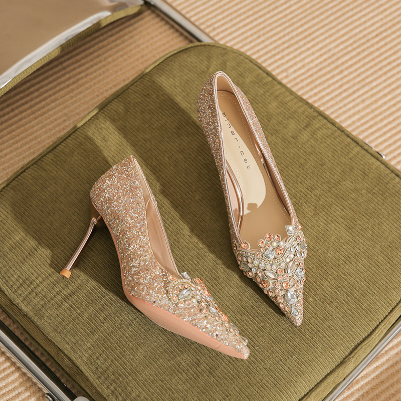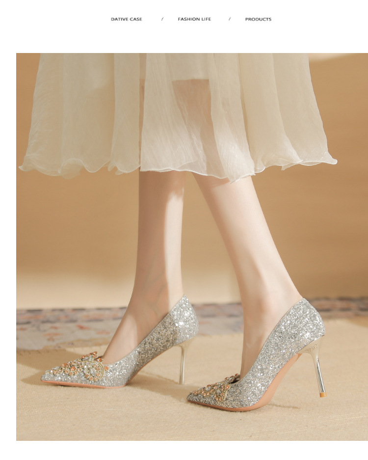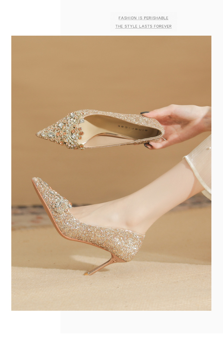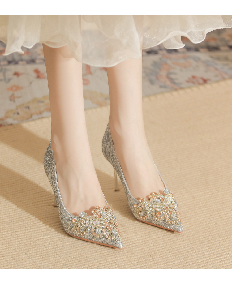 Đôi giày này có phần gót thon, mũi nhọn và cổ thấp, rất phù hợp cho các dịp đặc biệt. Bề mặt giày được trang trí bằng những hạt pha lê lấp lánh và miếng ánh sáng nhỏ, tạo nên vẻ đẹp tinh tế. Kiểu dáng thanh lịch, dễ dàng kết hợp với nhiều loại trang phục khác nhau. Khi sử dụng, bạn nên chọn kích cỡ vừa vặn và hạn chế tiếp xúc với nước để giữ giày được bền đẹp. | Tên sản phẩm: Giày Cao Gót Nữ Gắn Đá Mũi Nhọn Gót Nhọn Hàng Mùa Xuân Thu Đông Dùng Trong Lễ Cưới - Giày Dép Nữ | Mã sản phẩm: A1226 - Giá: 890.000đ | Mã nhà sản xuất: HUDS-G03Hình ảnh sản phẩm