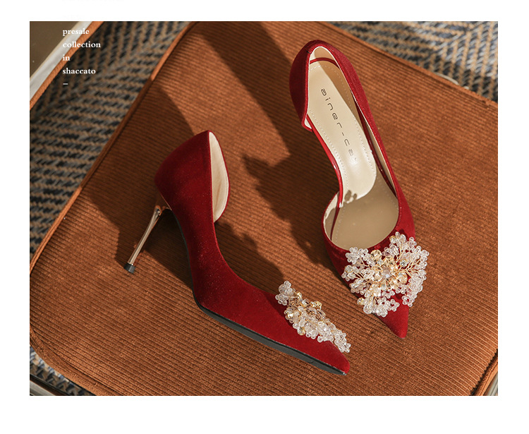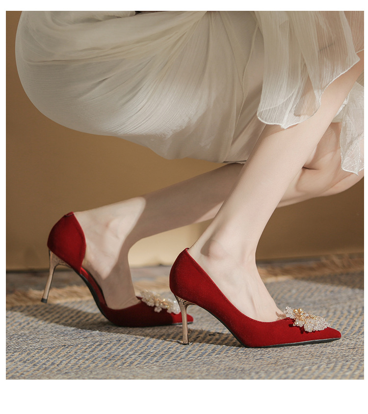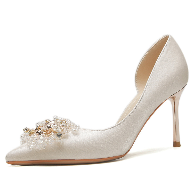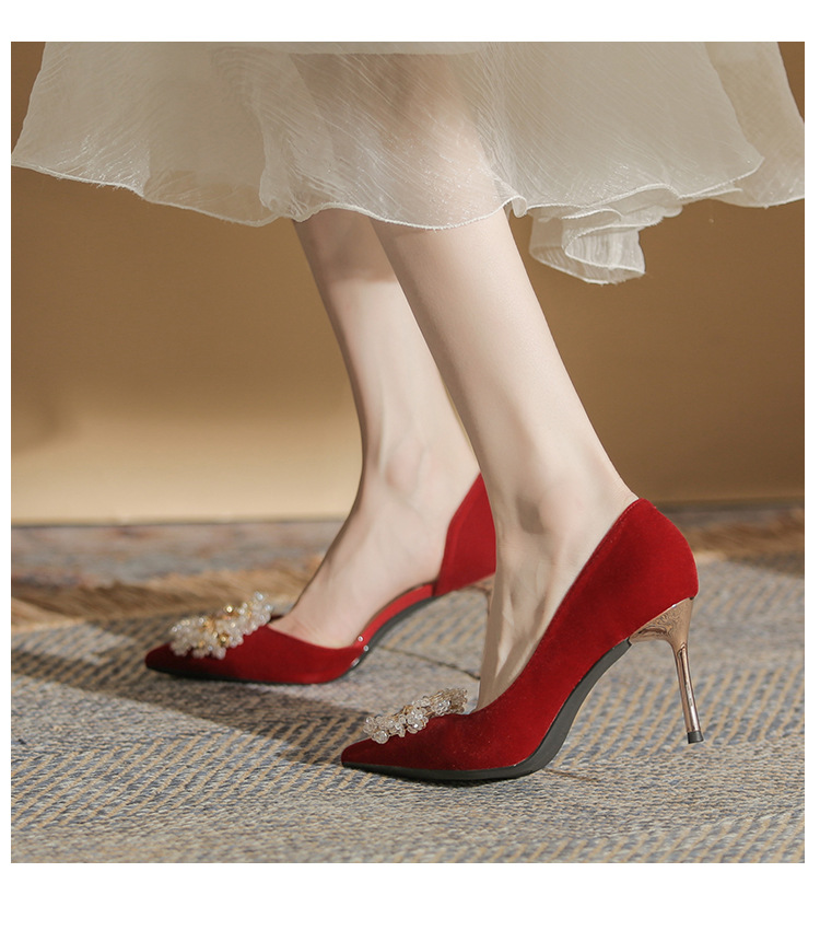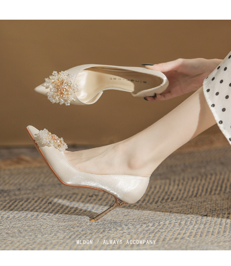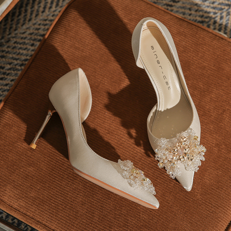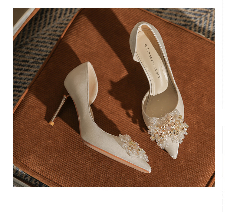 Đôi giày này có phần gót thanh mảnh và mũi nhọn, tạo dáng thanh thoát. Điểm đặc biệt là phần thiết kế hở hai bên, mang lại vẻ quyến rũ kín đáo. Sản phẩm rất linh hoạt, có thể sử dụng làm giày cưới trong ngày trọng đại hoặc phối cùng các trang phục dự tiệc khác. Bạn chỉ cần chọn cỡ vừa vặn với chân để di chuyển thoải mái và tự tin suốt cả ngày. | Tên sản phẩm: Giày Cao Gót Nữ Mũi Nhọn Gót Nhọn Dùng Trong Lễ Cưới - Giày Dép Nữ | Mã sản phẩm: A1314 - Giá: 1.000.000đ | Mã nhà sản xuất: HUDS-G03Hình ảnh sản phẩm