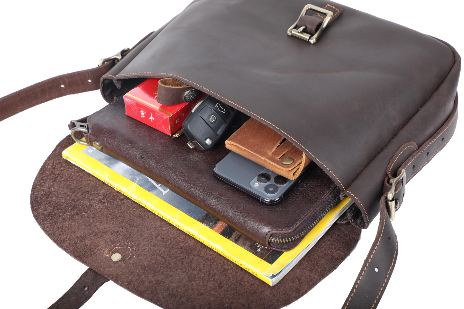Chiếc túi đeo chéo này được làm từ chất liệu da bò mềm mại và bền bỉ. Kiểu dáng đơn giản, dễ phối đồ với nhiều phong cách khác nhau. Bạn có thể đeo làm túi khoác chéo, túi đeo v hoặc xách tay một cách linh hoạt. Sản phẩm có qu đeo điều chỉnh được độ dài, bên trong đủ rộng để đựng ví, điện thoại và các vật dụng cá nhân cần thiết hàng ngày. | Tên sản phẩm: Túi Xách Nam Chất Liệu Da Bò - Túi Xách Ví Nam | Mã sản phẩm: A1824 - Giá: 1.350.000đ | Mã nhà sản xuất: SHDND-G04Hình ảnh sản phẩm