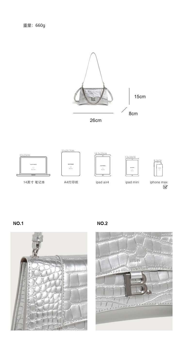 Túi thiết kế dáng cát với bề mặt vân da cá sấu tinh tế, mang đến vẻ ngoài thời thượng và cá tính. Đi kèm là qu xích chắc chắn, có thể điều chỉnh linh hoạt để đeo làm túi khoác tay, túi đeo v hoặc túi chéo tiện lợi. Kiểu dáng nhỏ gọn phù hợp cho những buổi tiệc hay dạo phố. Dễ dàng phối hợp cùng nhiều loại trang phục khác nhau, từ đầm văn phòng đến áo thun quần jeans. Chỉ cần khoác qu lên v và sắp xếp đồ dùng cá nhân gọn gàng là đã sẵn sàng ra ngoài. | Tên sản phẩm: Túi Xách Nữ Vân Da Cá Sấu Hàng Mùa Hè - Túi Ví Nữ | Mã sản phẩm: A2368 - Giá: 1.000.000đ | Mã nhà sản xuất: GUDAT-G03Hình ảnh sản phẩm