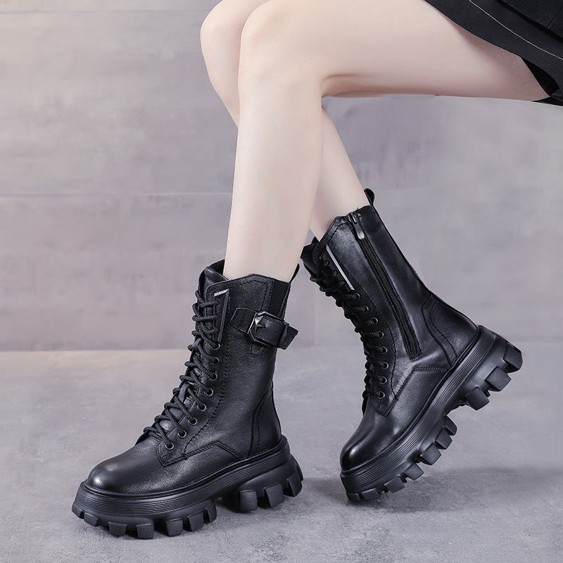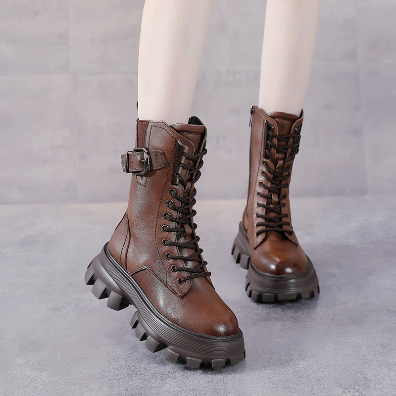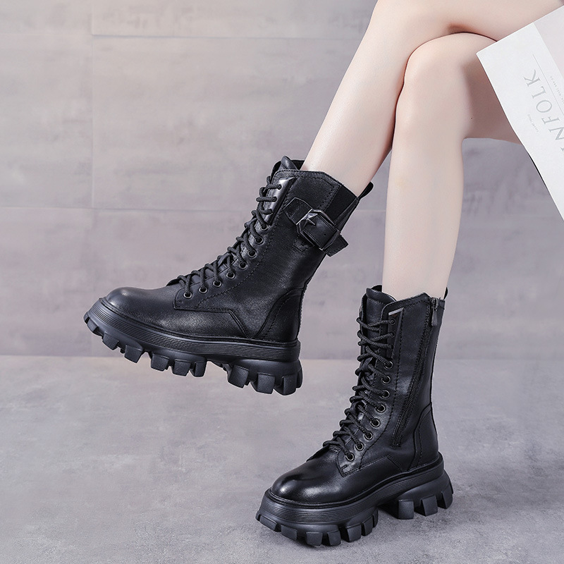 Đôi bốt cổ trung dành cho nữ, được làm từ chất liệu da thật tự nhiên, mang phong cách Anh cổ điển. Sản phẩm có đế dày cùng khóa móc bằng kim loại, tạo điểm nhấn mạnh mẽ. Kiểu dáng dễ dàng phối hợp với nhiều trang phục như quần jeans, váy hay quần tất để tạo nên vẻ ngoài cá tính. Bạn có thể sử dụng hằng ngày trong mùa thu đông, giúp giữ ấm đôi chân và bước đi thoải mái. | Tên sản phẩm: Boot Cổ Thấp Nữ Chất Liệu Da Bò Đế Cao Hàng Mùa Xuân Thu Đông - Giày Dép Nữ | Mã sản phẩm: a2845 - Giá: 1.880.000đ | Mã nhà sản xuất: WEDS-G05Hình ảnh sản phẩm