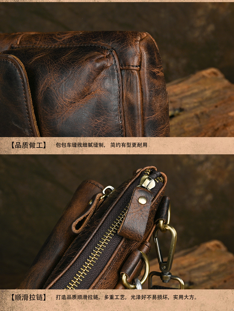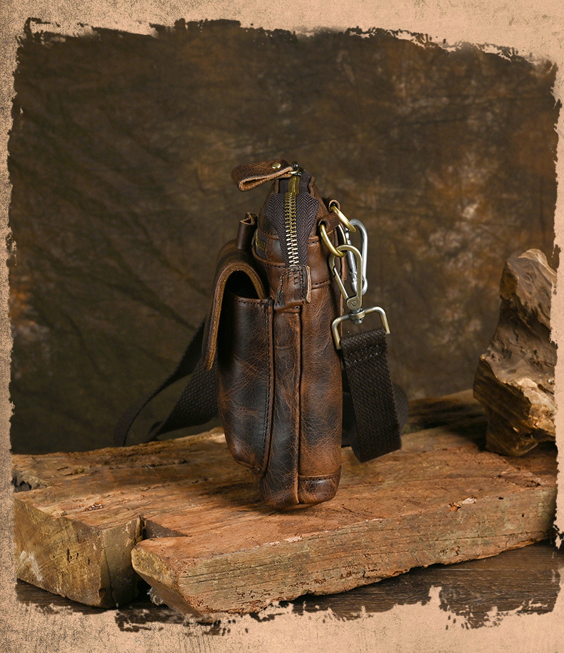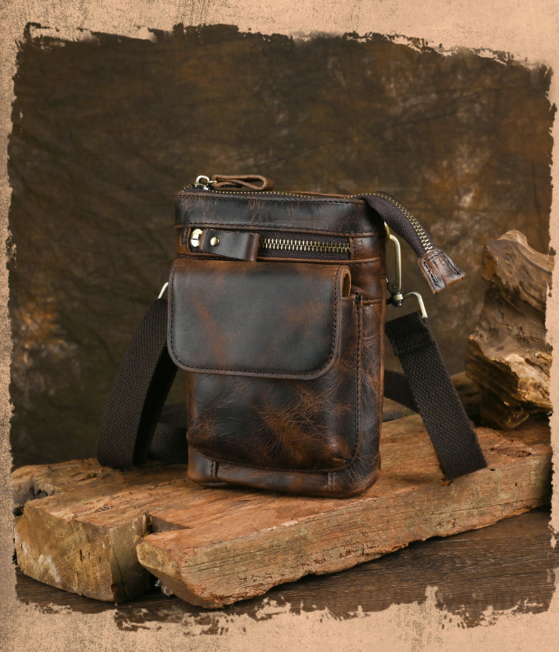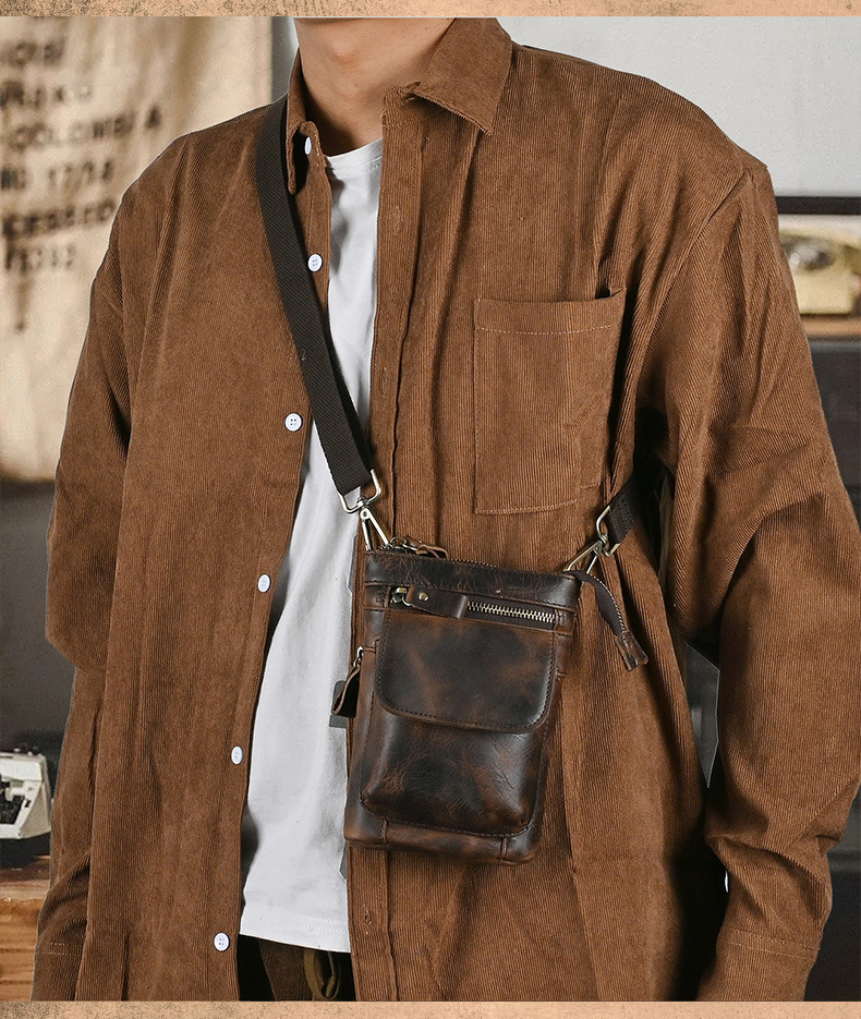 Túi đeo chéo này mang phong cách cổ điển, được làm từ chất da bò nguyên miếng có vân tự nhiên và độ bền cao. Thiết kế nhỏ gọn chứa vừa điện thoại bảy inch, có móc để gắn vào thắt lưng hoặc mang chéo tùy thích. Nhiều ngăn tiện lợi giúp bạn sắp xếp đồ dùng cá nhân gọn gàng khi ra ngoài hoặc tham gia hoạt động ngoài trời. Chỉ cần đeo túi qua v hoặc móc cố định vào dây lưng là có thể sử dụng ngay. | Tên sản phẩm: Túi Xách Nam Phục Cổ Cổ Điển - Túi Xách Ví Nam | Mã sản phẩm: A4373 - Giá: 610.000đ | Mã nhà sản xuất: GUDEA-G02Hình ảnh sản phẩm