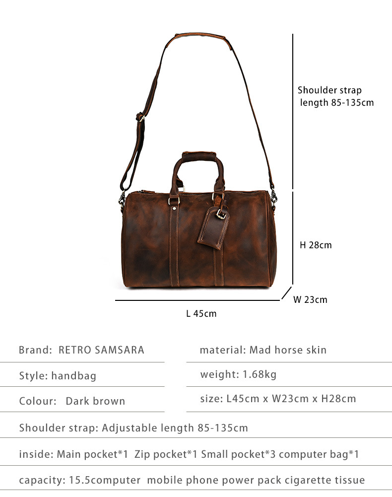 Túi xách du lịch này được làm hoàn toàn từ chất liệu da bò mềm mại, có vân tự nhiên độc đáo tạo nên vẻ đẹp cổ điển. Sản phẩm được làm thủ công tỉ mỉ, kết cấu chắc chắn với không gian rộng rãi bên trong, phù hợp để đựng đồ dùng cá nhân khi đi du lịch hoặc công tác. Kiểu dáng nam tính nhưng vẫn phù hợp cho cả nữ giới khi cần mang theo nhiều vật dụng. Bạn có thể dùng làm túi đựng tài liệu hoặc túi du lịch ngắn ngày, sử dụng hàng ngày rất tiện lợi và bền đẹp theo thời gian. | Tên sản phẩm: Túi Xách Nữ Chất Liệu Da Bò - Túi Ví Nữ | Mã sản phẩm: A4421 - Giá: 2.450.000đ | Mã nhà sản xuất: GUDEA-G05Hình ảnh sản phẩm
