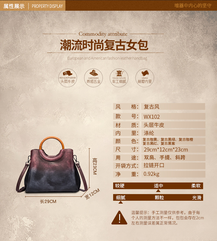 Túi xách dành cho nữ được làm hoàn toàn từ da thật, thuộc theo phương pháp thảo mộc tự nhiên. Điểm nổi bật là kỹ thuật đánh màu thủ công tạo hiệu ứng phối màu cổ điển độc đáo. Kiểu dáng phóng khoáng, kết hợp dây đeo tay và dây đeo chéo linh hoạt. Sản phẩm mang phong cách hoài cổ nhưng vẫn rất hợp thời. Khi sử dụng, tránh để túi tiếp xúc trực tiếp với nước mưa hoặc ánh nắng lâu để giữ vẻ đẹp tự nhiên của chất da. | Tên sản phẩm: Túi Xách Nữ Chất Liệu Da Bò Phong Cách Âu Mỹ - Túi Ví Nữ | Mã sản phẩm: A4980 - Giá: 1.730.000đ | Mã nhà sản xuất: GUDI-G05Hình ảnh sản phẩm