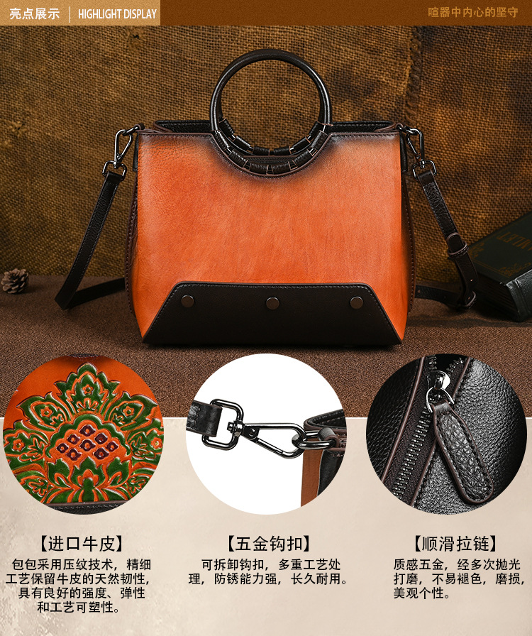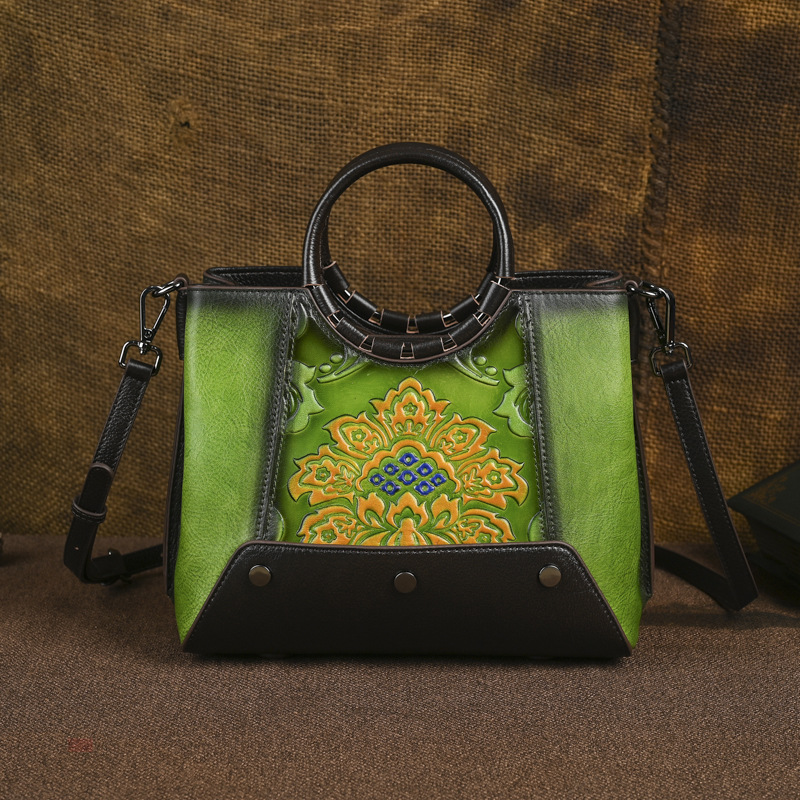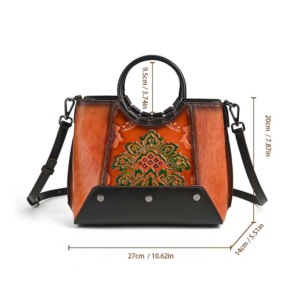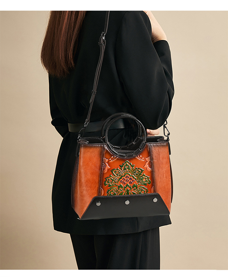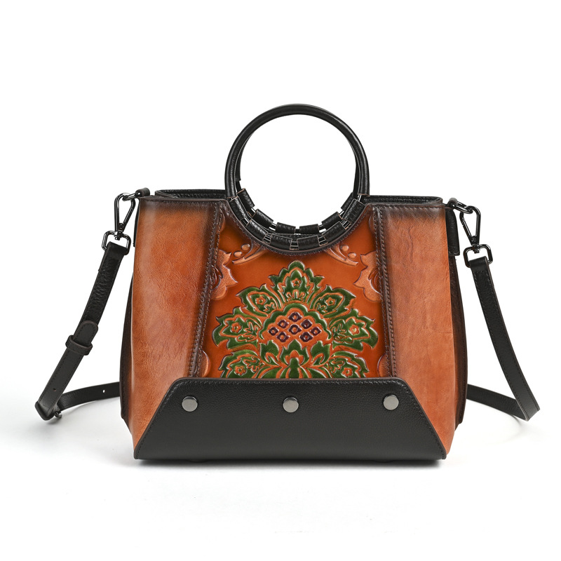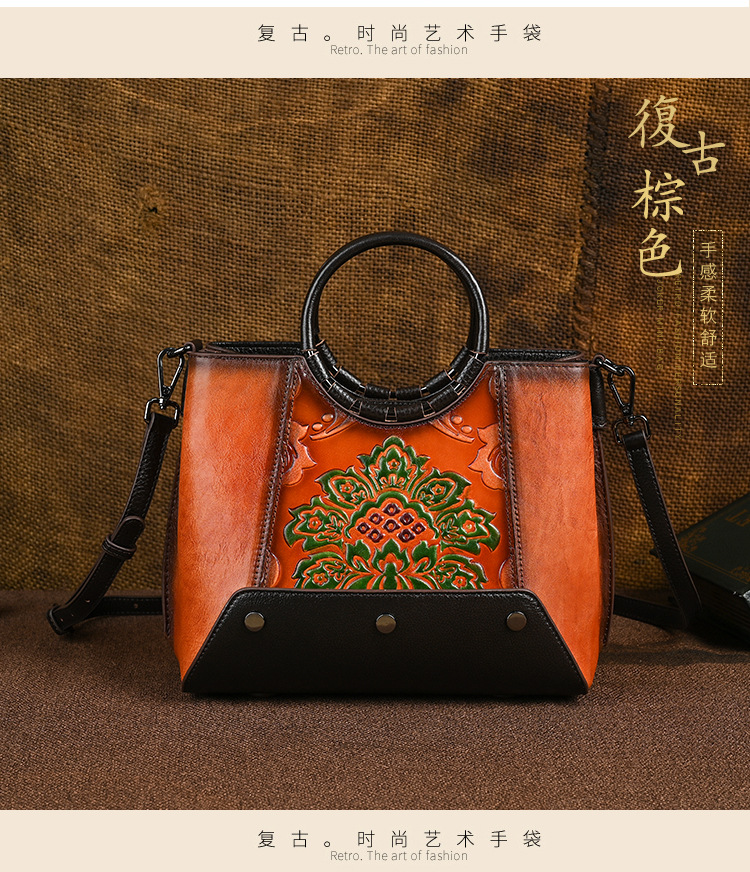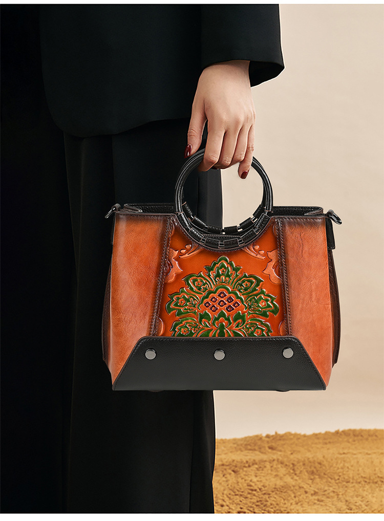 Túi xách dành cho nữ với dây đeo chéo và qu cầm tay tiện lợi. Chất liệu làm từ da thật, bề mặt được dập nổi hoa văn tinh tế kết hợp kỹ thuật tạo màu vân cổ, mang đến vẻ đẹp hoài niệm. Bên trong túi rộng rãi, đựng vừa ví, điện thoại và các vật dụng cá nhân cần thiết. Khi sử dụng, có thể đeo chéo người hoặc xách tay tùy thích. Phù hợp cho nhiều dịp sử dụng hằng ngày. | Tên sản phẩm: Túi Xách Nữ Chất Liệu Da Bò Họa Tiết Hoa Phục Cổ Cổ Điển - Túi Ví Nữ | Mã sản phẩm: A5050 - Giá: 1.640.000đ | Mã nhà sản xuất: GUDI-G05Hình ảnh sản phẩm