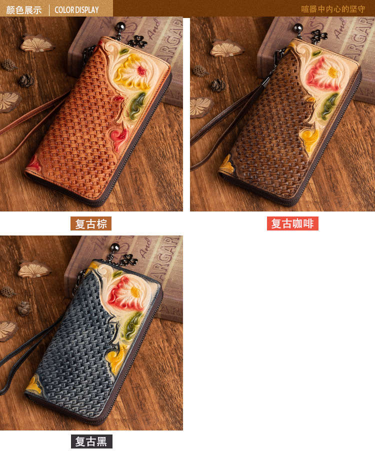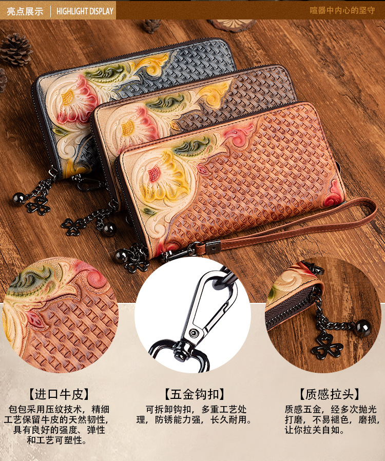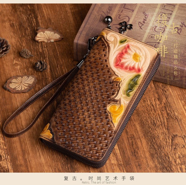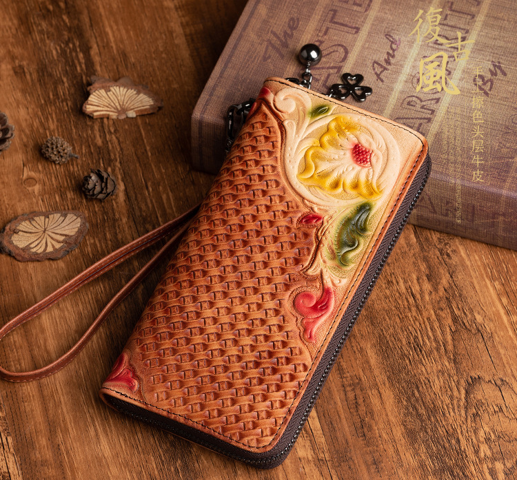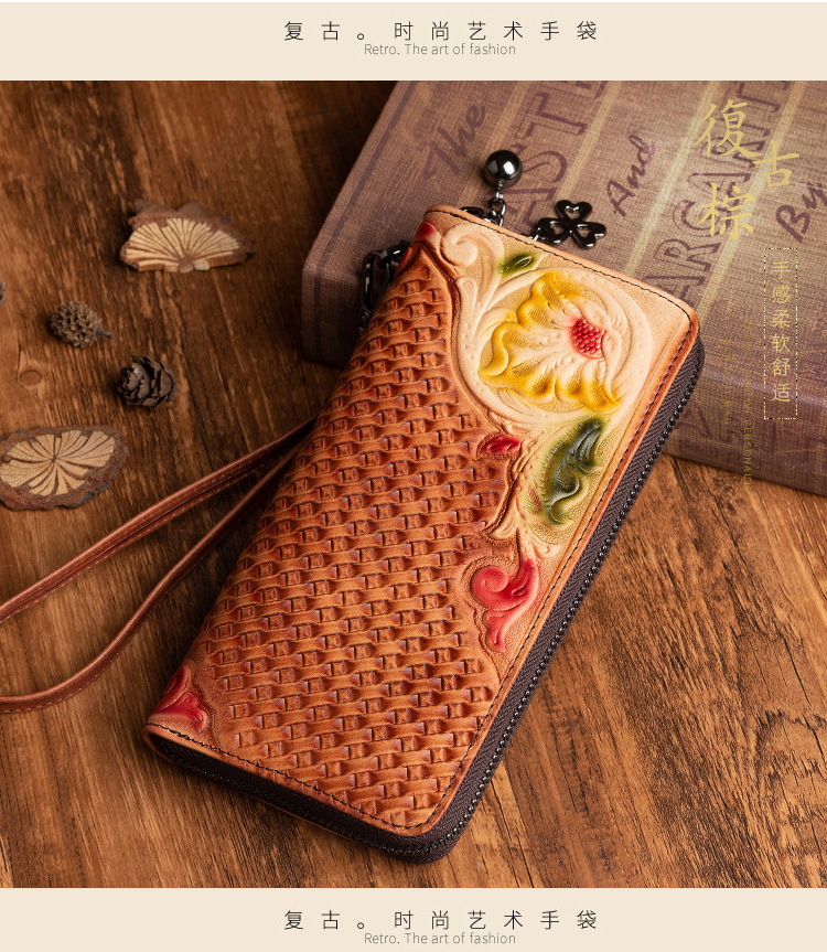 Ví tiền dành cho nữ, kiểu dáng dài vừa tay cầm, mang phong cách hoài cổ đẹp mắt. Sản phẩm được làm từ chất liệu da thật, bền đẹp theo thời gian. Điểm nhấn đặc biệt là phần tô màu được làm thủ công tinh xảo, tạo nên những họa tiết độc đáo trên bề mặt. Bên trong có nhiều ngăn rộng rãi, giúp bạn dễ dàng sắp xếp tiền mặt, thẻ và các vật dụng cá nhân. Rất tiện lợi để mang theo khi đi làm hoặc dự tiệc. | Tên sản phẩm: Ví Bóp Nữ Chất Liệu Da Bò Phục Cổ Cổ Điển - Túi Ví Nữ | Mã sản phẩm: A5076 - Giá: 720.000đ | Mã nhà sản xuất: GUDI-G02Hình ảnh sản phẩm