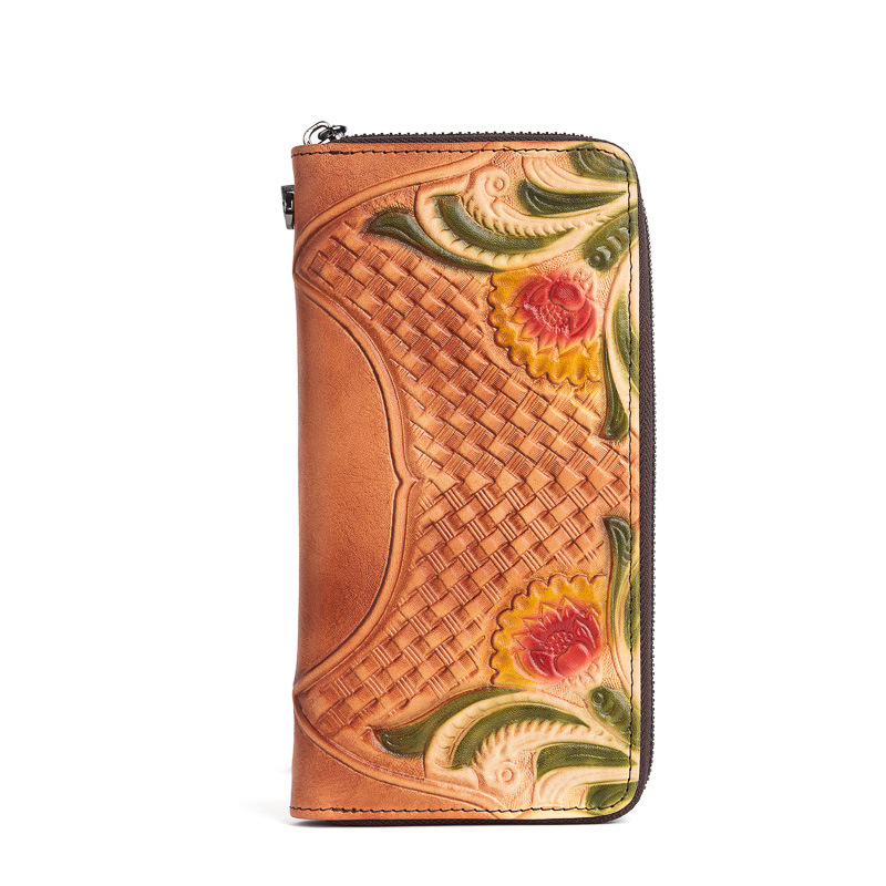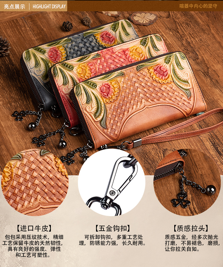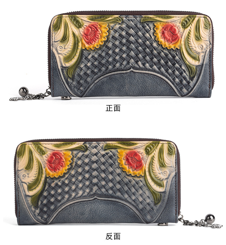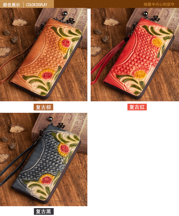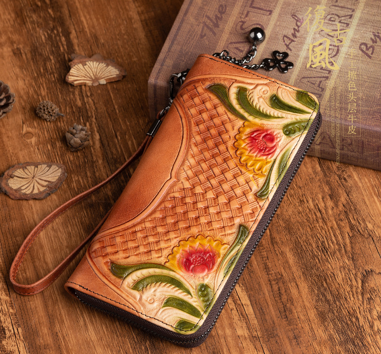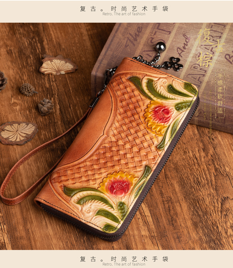 Chiếc ví nữ mẫu mới này được làm từ chất liệu da thật, mang phong cách cổ điển. Điểm nhấn đặc biệt là những họa tiết được thợ thủ công ép nổi và tô màu tinh tế. Thiết kế dáng dài vừa phải, dễ dàng cầm tay hoặc mang theo. Ví có nhiều ngăn đựng thẻ, giúp bạn sắp xếp các loại thẻ và tiền mặt một cách gọn gàng, ngăn nắp. Rất tiện lợi để sử dụng hàng ngày. | Tên sản phẩm: Ví Bóp Nữ Chất Liệu Da Bò Họa Tiết Hoa Phong Cách Âu Mỹ - Túi Ví Nữ | Mã sản phẩm: A5077 - Giá: 720.000đ | Mã nhà sản xuất: GUDI-G02Hình ảnh sản phẩm