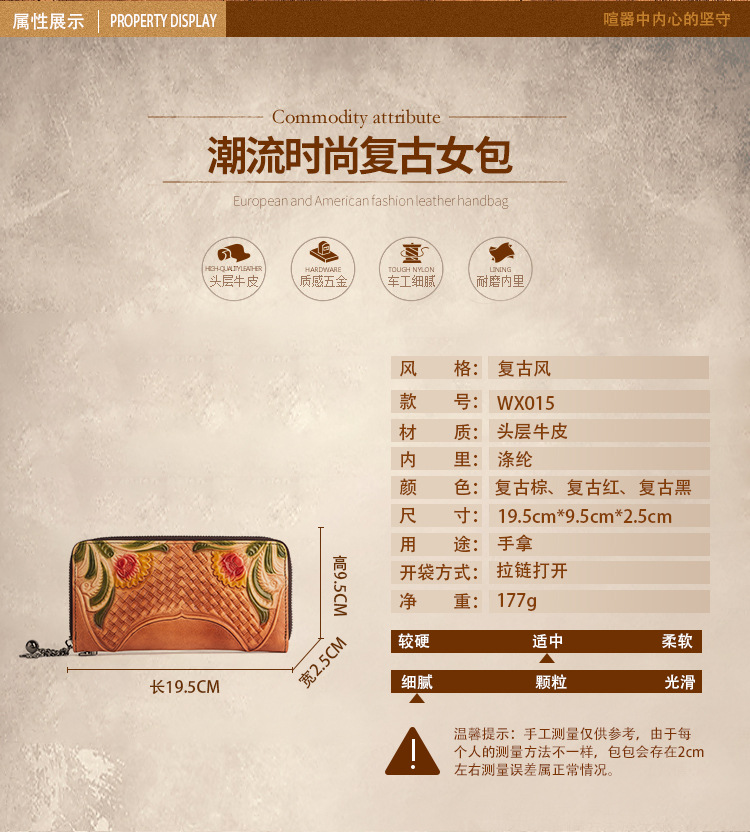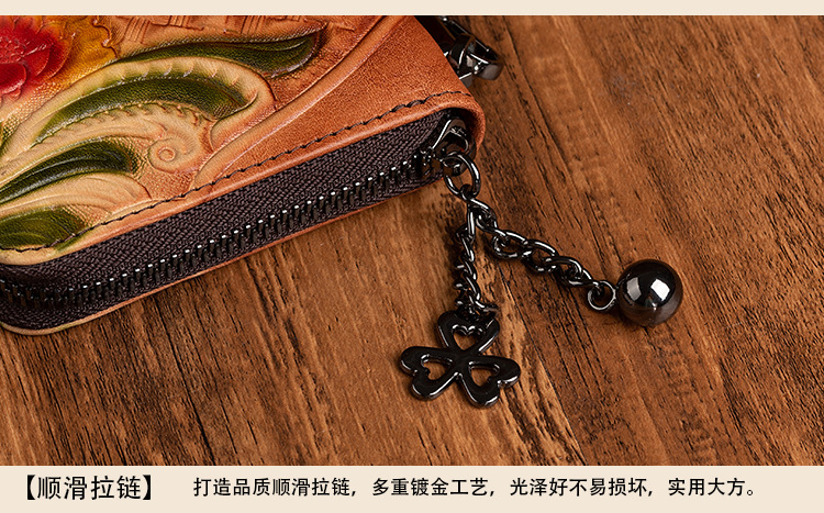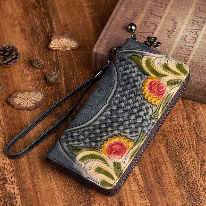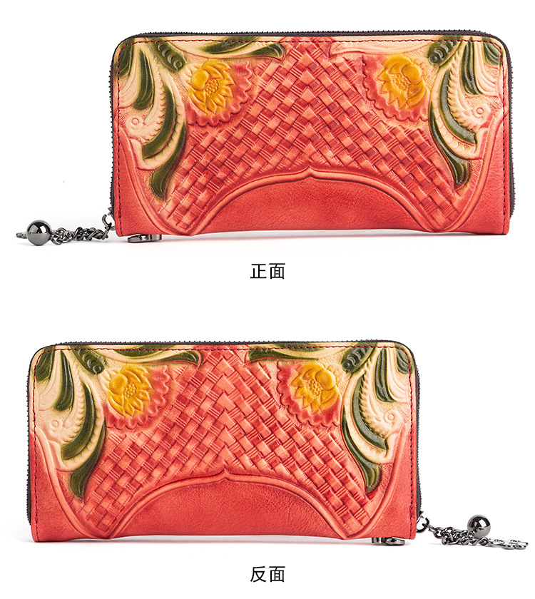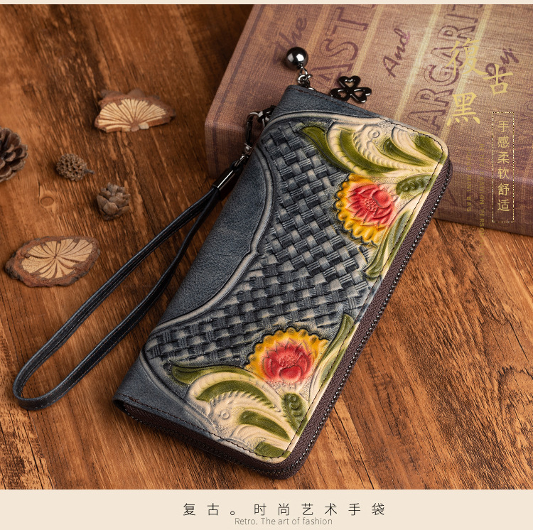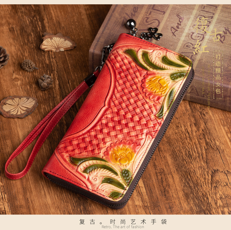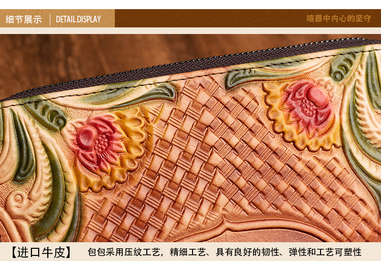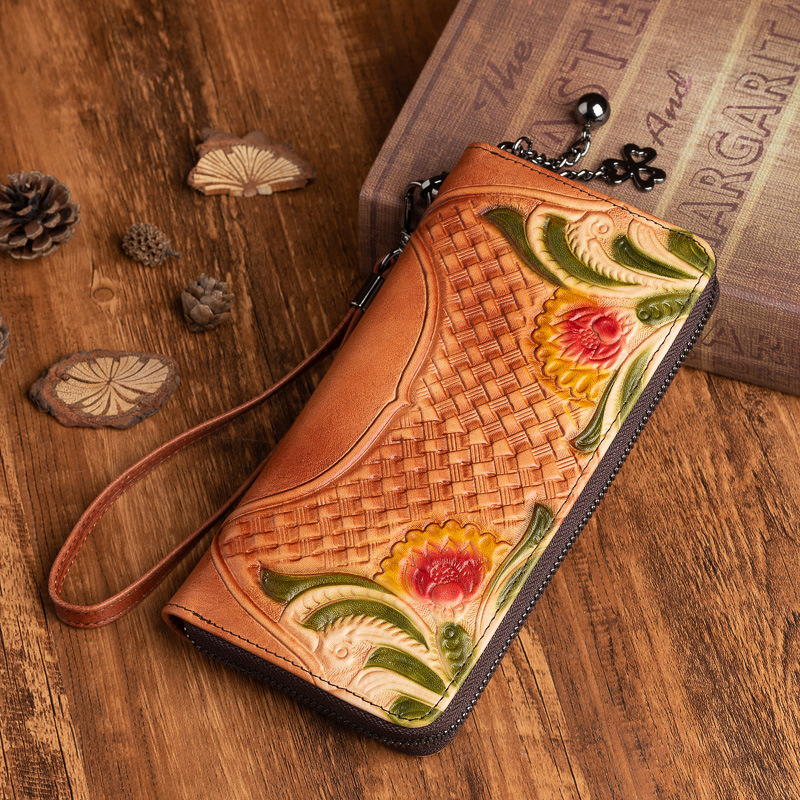Chiếc ví nữ mẫu mới này được làm từ chất liệu da thật, mang phong cách cổ điển. Điểm nhấn đặc biệt là những họa tiết được thợ thủ công ép nổi và tô màu tinh tế. Thiết kế dáng dài vừa phải, dễ dàng cầm tay hoặc mang theo. Ví có nhiều ngăn đựng thẻ, giúp bạn sắp xếp các loại thẻ và tiền mặt một cách gọn gàng, ngăn nắp. Rất tiện lợi để sử dụng hàng ngày. | Tên sản phẩm: Ví Bóp Nữ Chất Liệu Da Bò Họa Tiết Hoa Phong Cách Âu Mỹ - Túi Ví Nữ | Mã sản phẩm: A5077 - Giá: 720.000đ | Mã nhà sản xuất: GUDI-G02Hình ảnh sản phẩm