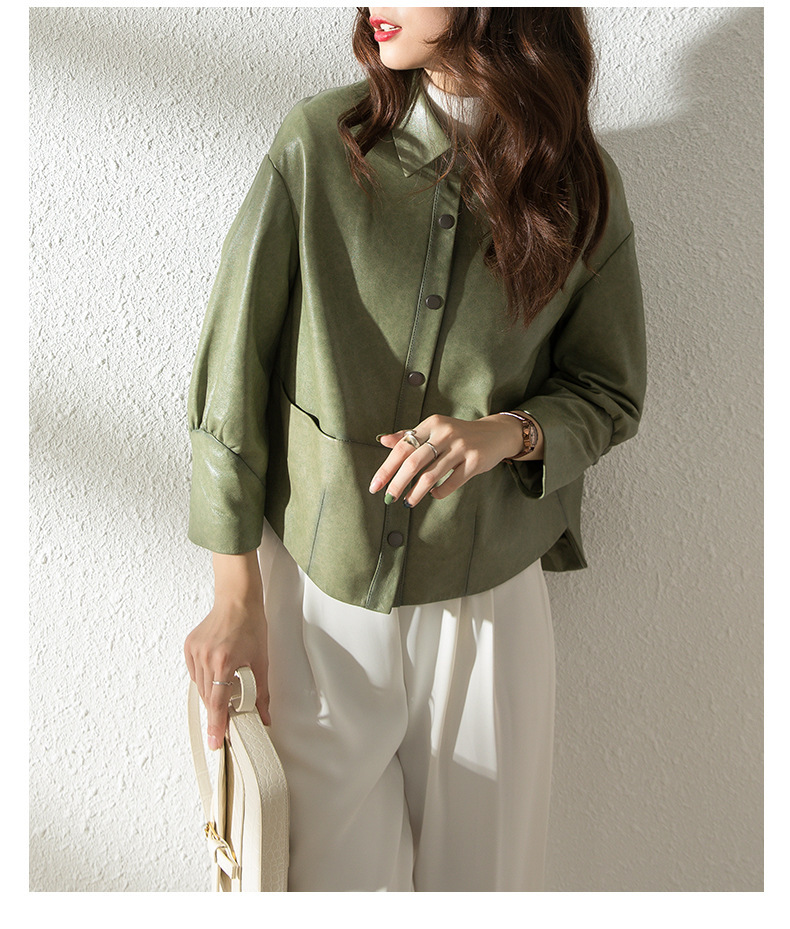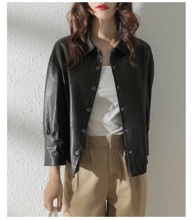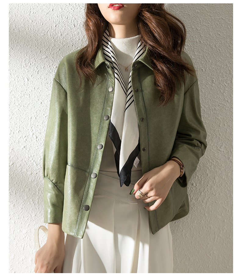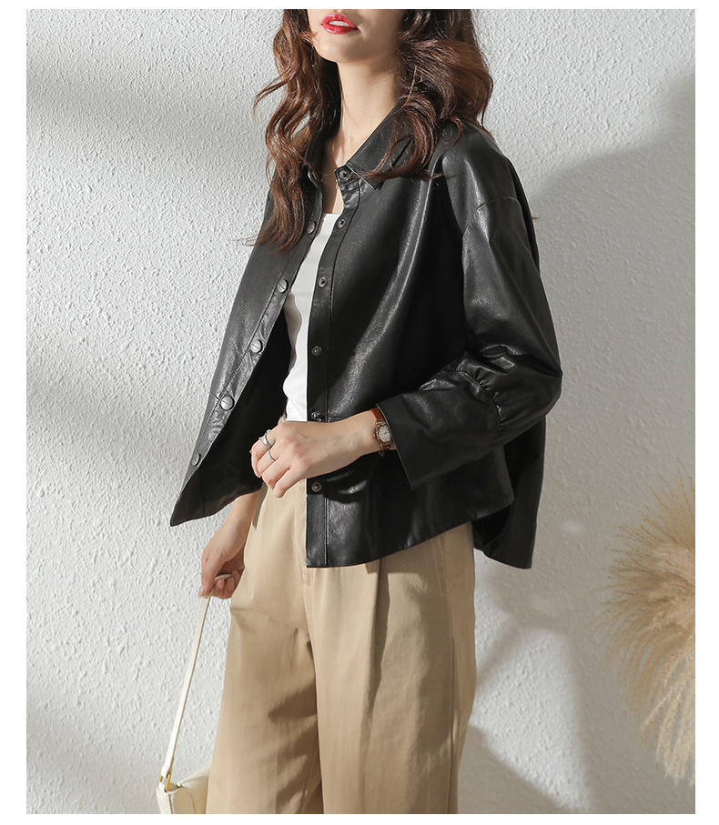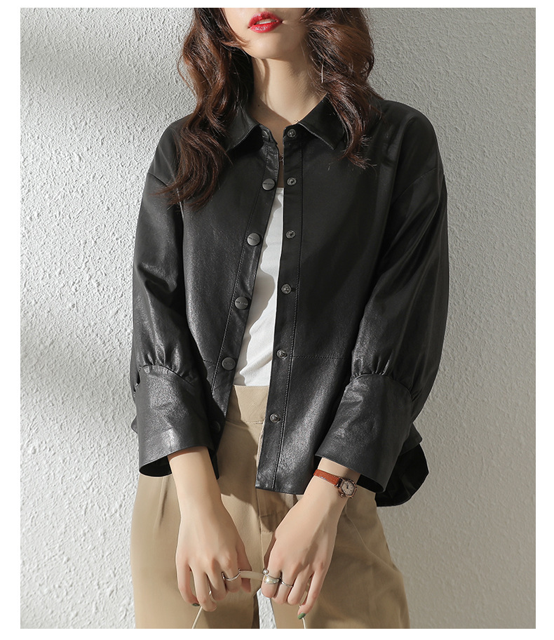 Áo khoác da thật dáng ngắn dành cho nữ, kiểu dáng phong cách mạnh mẽ phù hợp tiết trời mát mẻ. Chất liệu da mềm mại, thiết kế form rộng thoải mái tạo cảm giác dễ chịu khi mặc. Sản phẩm có thể kết hợp cùng quần jeans hoặc chân váy để tạo điểm nhấn. Mặc kèm áo thun hoặc áo len bên trong để giữ ấm nhẹ. Dùng khăn mềm ẩm lau nhẹ bề mặt sau khi sử dụng. | Tên sản phẩm: Áo Da Nữ Chất Liệu Da Bò Hàng Mùa Xuân Thu Đông - Thời Trang Nữ | Mã sản phẩm: a5197 - Giá: 5.370.000đ | Mã nhà sản xuất: HADG-G06Hình ảnh sản phẩm