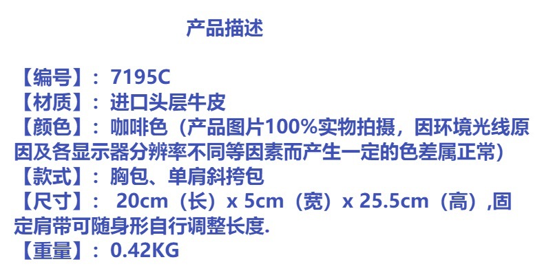 Chiếc túi đeo chéo này có kiểu dáng trẻ trung và năng động. Sản phẩm được làm từ chất liệu da thật, mang lại cảm giác mềm mại và bền bỉ. Túi có thiết kế đeo chéo trước ngực tiện lợi, giúp bảo quản các vật dụng cá nhân như điện thoại, ví một cách an toàn và dễ dàng lấy ra. Bạn có thể điều chỉnh dây đeo để phù hợp với vóc dáng. Rất thích hợp để sử dụng hàng ngày, khi đi làm hoặc trong những chuyến du lịch ngắn ngày. | Tên sản phẩm: Túi Đeo Vai Nam Chất Liệu Da Bò Phong Cách Hàn Quốc - Túi Xách Ví Nam | Mã sản phẩm: A6314 - Giá: 1.000.000đ | Mã nhà sản xuất: SHDER-G03Hình ảnh sản phẩm