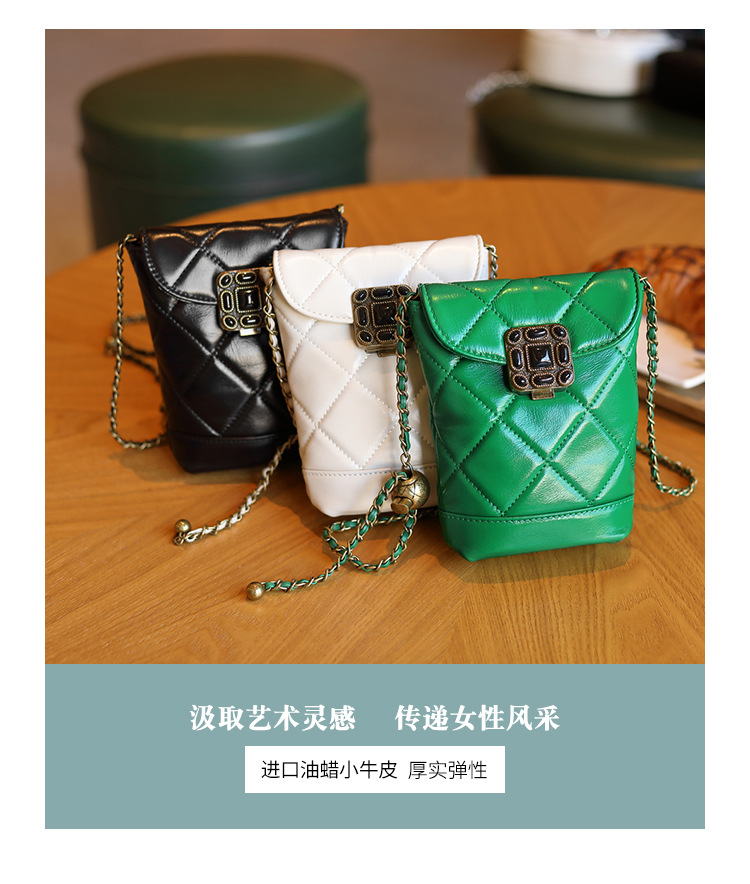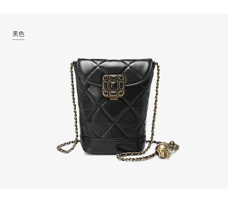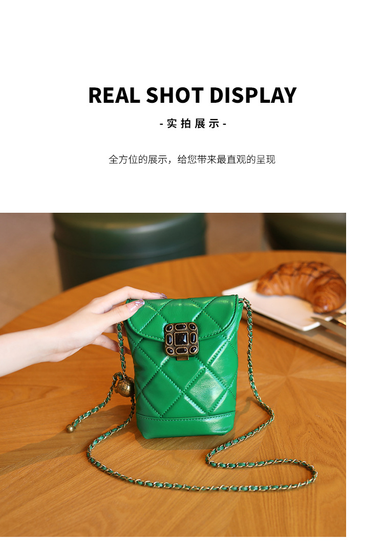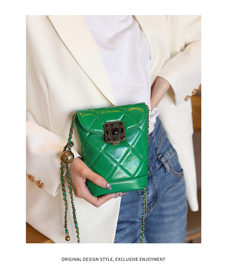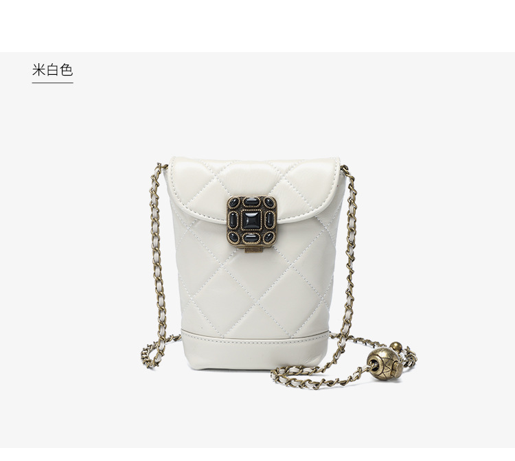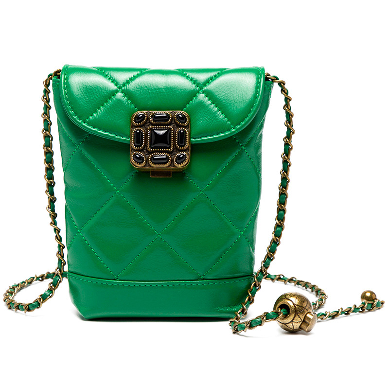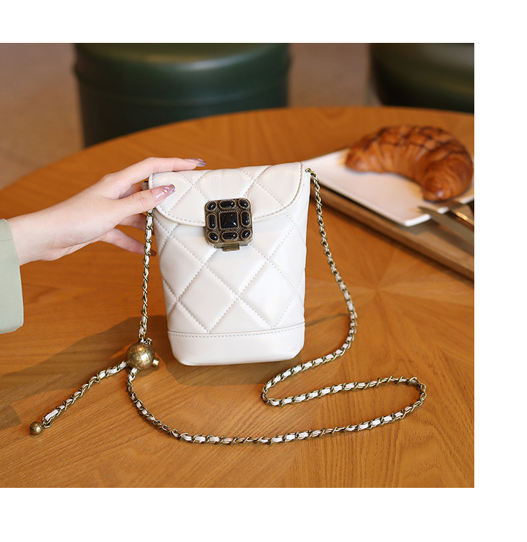 Túi đeo chéo dành cho nữ với dây xích và khóa cài hình viên ngọc tr nhỏ xinh. Mặt túi được điểm xuyết bằng đường may hình viên ngọc cùng họa tiết vân kim cương tinh tế. Chất liệu da mềm mịn, bền đẹp theo thời gian. Thiết kế nhỏ gọn, vừa vặn cho điện thoại và một số vật dụng cá nhân. Chỉ cần đeo dây túi lên v hoặc khoác chéo người là đã sẵn sàng để sử dụng. | Tên sản phẩm: Túi Xách Nữ Chất Liệu Da Bò Kẻ Caro Kẻ Caro - Túi Ví Nữ | Mã sản phẩm: A6715 - Giá: 870.000đ | Mã nhà sản xuất: GUDEA-G03Hình ảnh sản phẩm