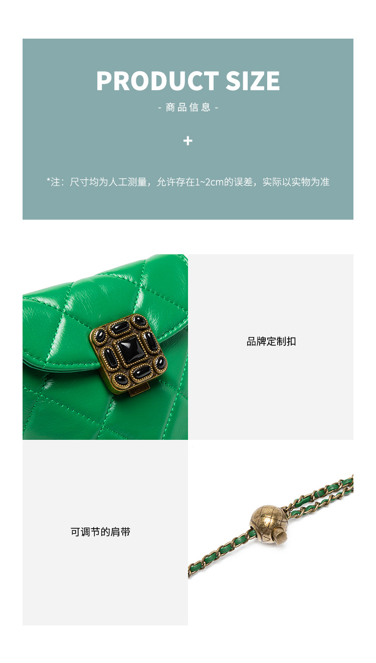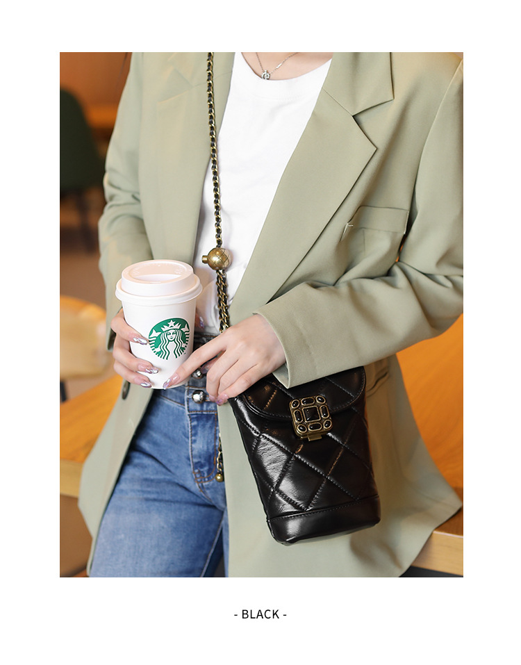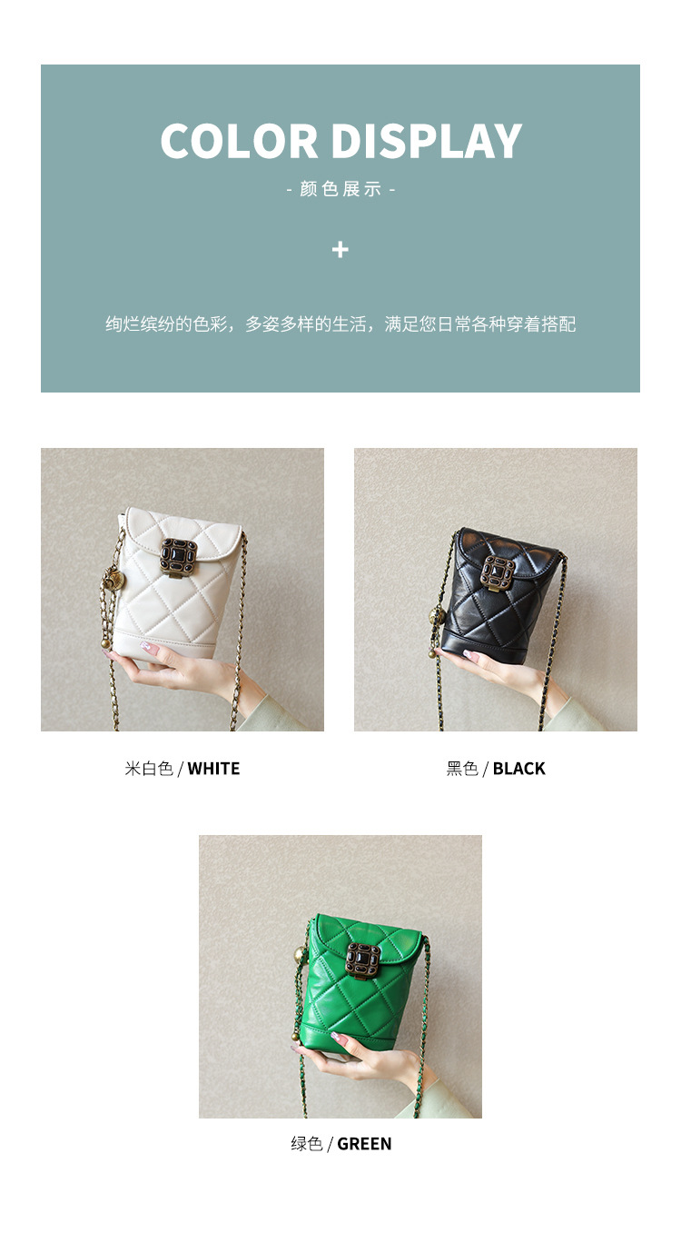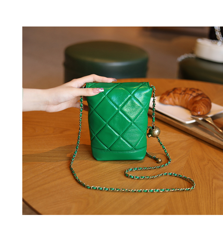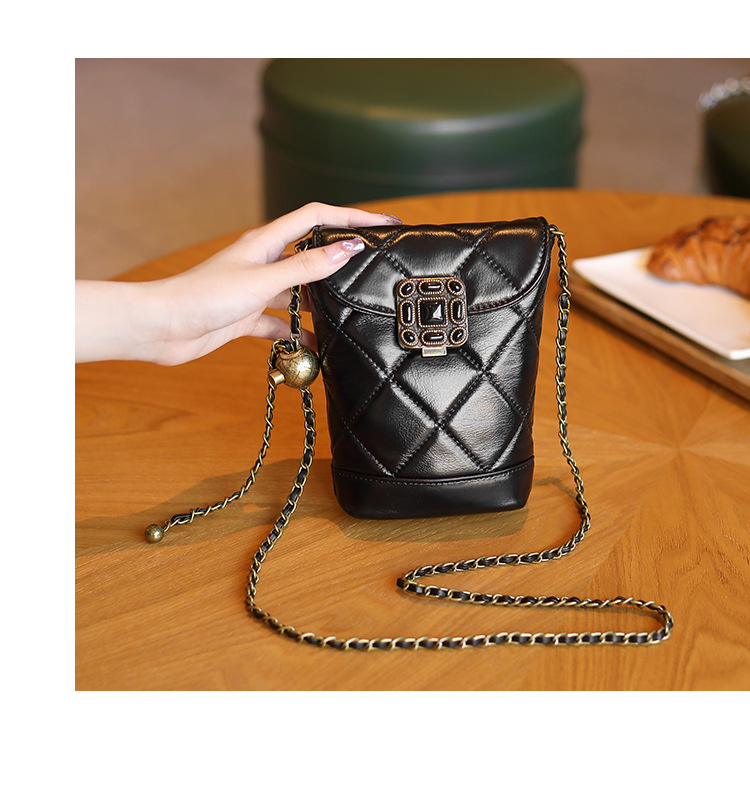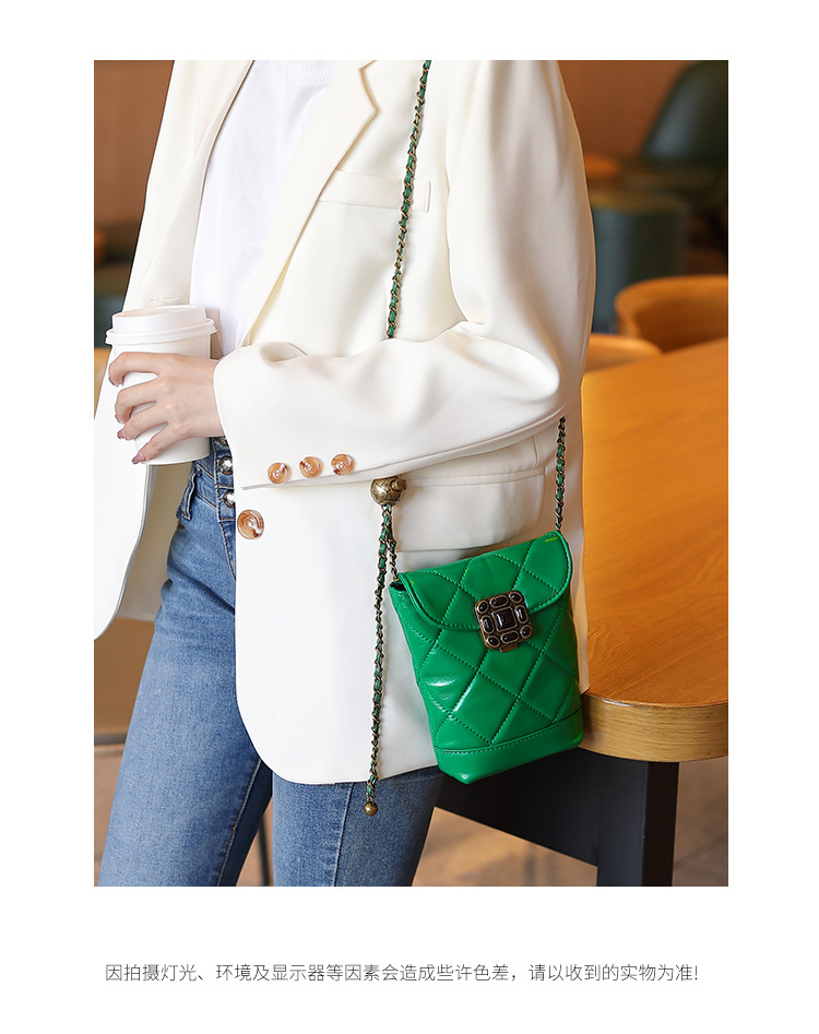 Túi đeo chéo dành cho nữ với dây xích và khóa cài hình viên ngọc tr nhỏ xinh. Mặt túi được điểm xuyết bằng đường may hình viên ngọc cùng họa tiết vân kim cương tinh tế. Chất liệu da mềm mịn, bền đẹp theo thời gian. Thiết kế nhỏ gọn, vừa vặn cho điện thoại và một số vật dụng cá nhân. Chỉ cần đeo dây túi lên v hoặc khoác chéo người là đã sẵn sàng để sử dụng. | Tên sản phẩm: Túi Xách Nữ Chất Liệu Da Bò Kẻ Caro Kẻ Caro - Túi Ví Nữ | Mã sản phẩm: A6715 - Giá: 870.000đ | Mã nhà sản xuất: GUDEA-G03Hình ảnh sản phẩm