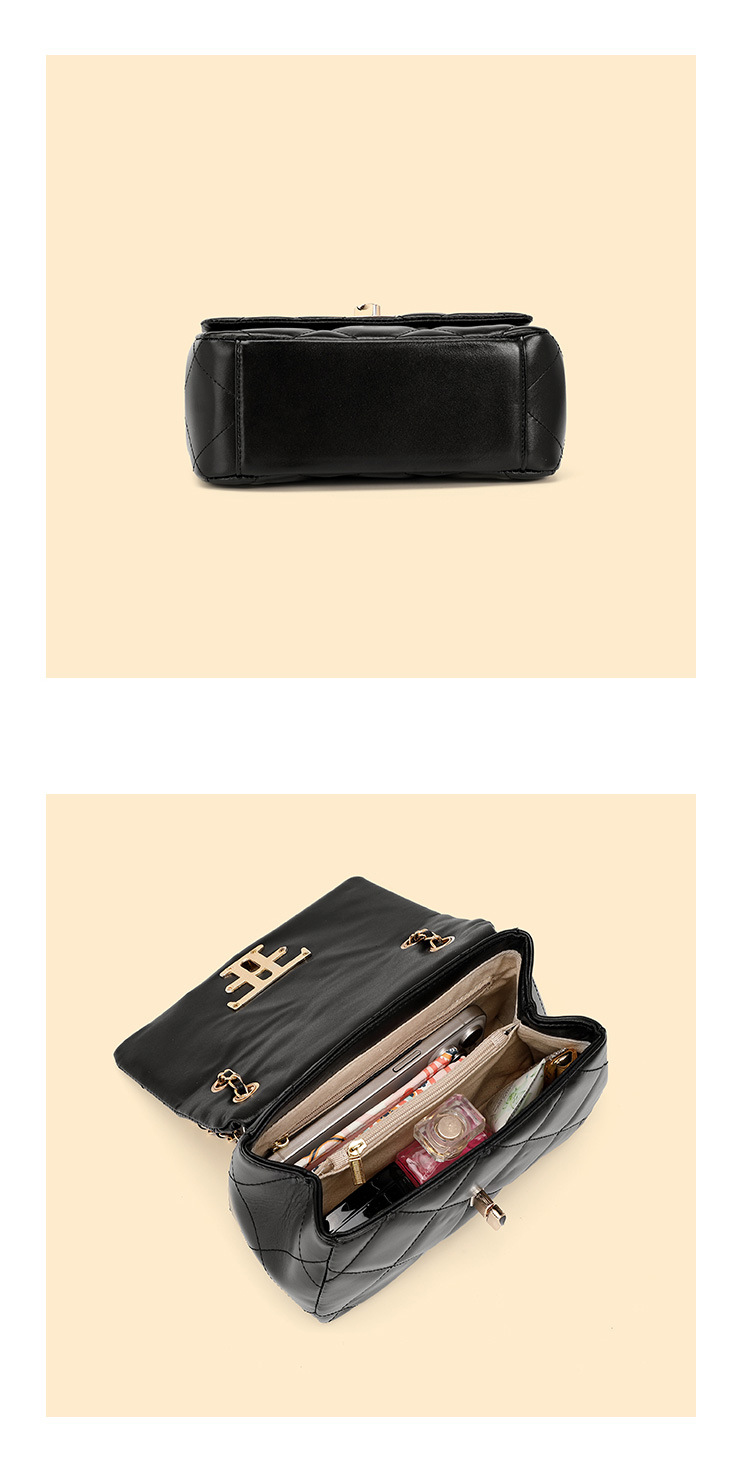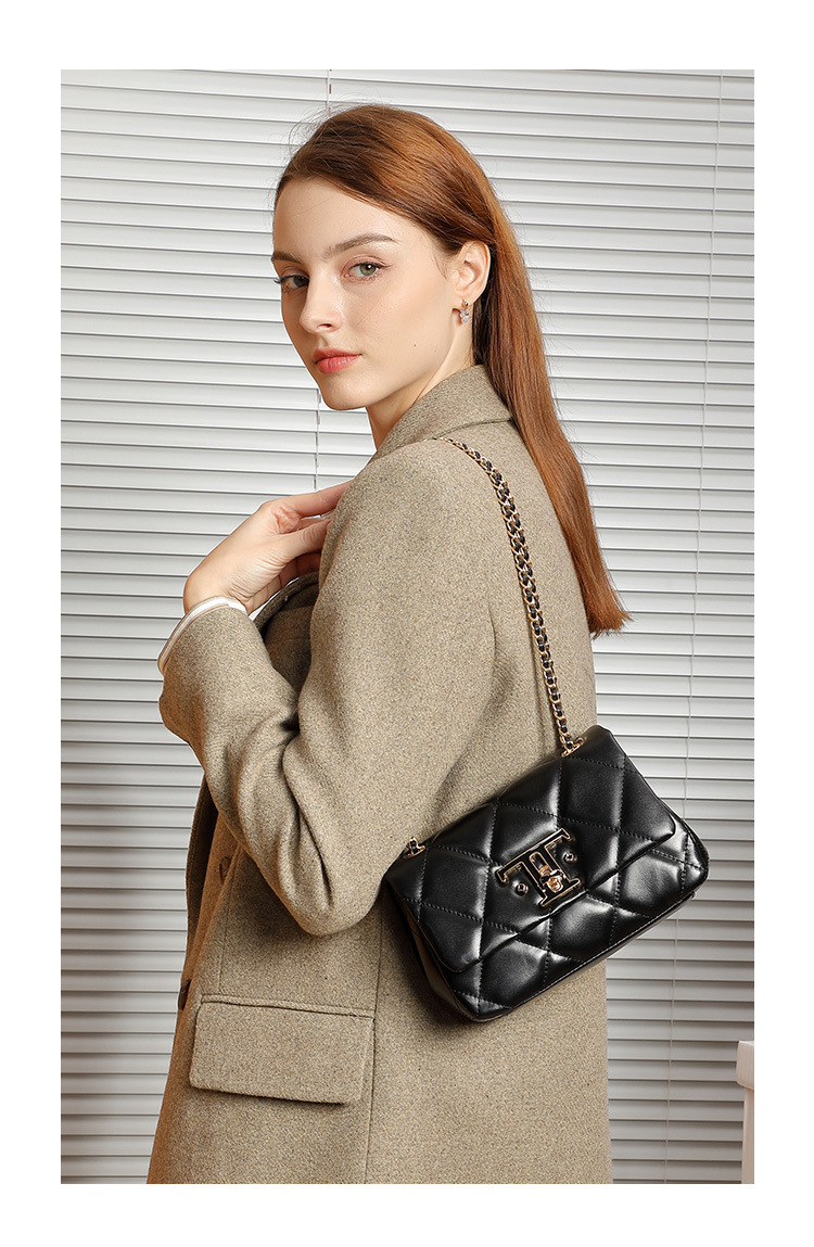 Túi xách mới với khóa cài kim loại, được làm từ chất da mềm mịn. Kiểu dáng vuông nhỏ phối họa tiết hình thoi nổi bật cùng dây đeo chuỗi vắt v. Thiết kế thanh lịch, dễ dàng phối đồ. Có thể mang làm túi đeo chéo hoặc xách tay linh hoạt. Ngăn rộng rãi đựng vừa ví, điện thoại và các vật dụng cá nhân cần thiết. Phù hợp cho nhiều dịp sử dụng hằng ngày. | Tên sản phẩm: Túi Xách Nữ Chất Liệu Da Bò Kẻ Caro Kẻ Caro - Túi Ví Nữ | Mã sản phẩm: A6912 - Giá: 1.120.000đ | Mã nhà sản xuất: GUDEA-G04Hình ảnh sản phẩm