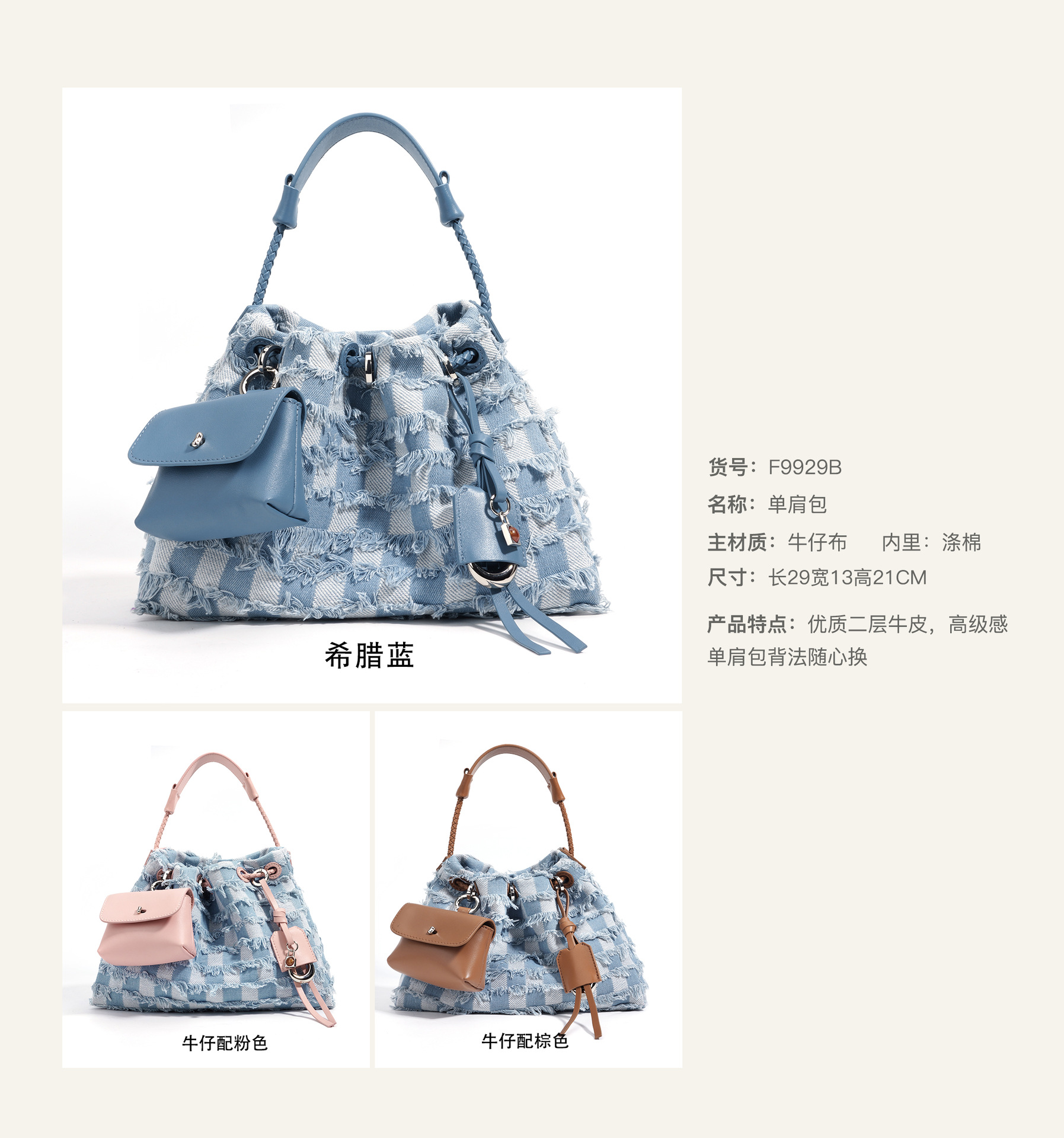 Túi xách một v mới ra mắt, kết hợp chất liệu vải bò bền bỉ với điểm nhấn từ da thật. Thiết kế kiểu dáng trẻ trung, năng động, phù hợp cho nhiều dịp sử dụng. Túi có nhiều ngăn nhỏ tiện lợi, giúp bạn sắp xếp đồ dùng cá nhân một cách gọn gàng. Có thể đeo chéo người hoặc khoác v một cách linh hoạt. Màu sắc tươi tắn, dễ dàng phối hợp cùng nhiều loại trang phục khác nhau. | Tên sản phẩm: Túi Đeo Vai Nữ Chất Liệu Da Bò Hàng Mùa Hè - Túi Ví Nữ | Mã sản phẩm: A7297 - Giá: 1.390.000đ | Mã nhà sản xuất: GUDEA-G04Hình ảnh sản phẩm