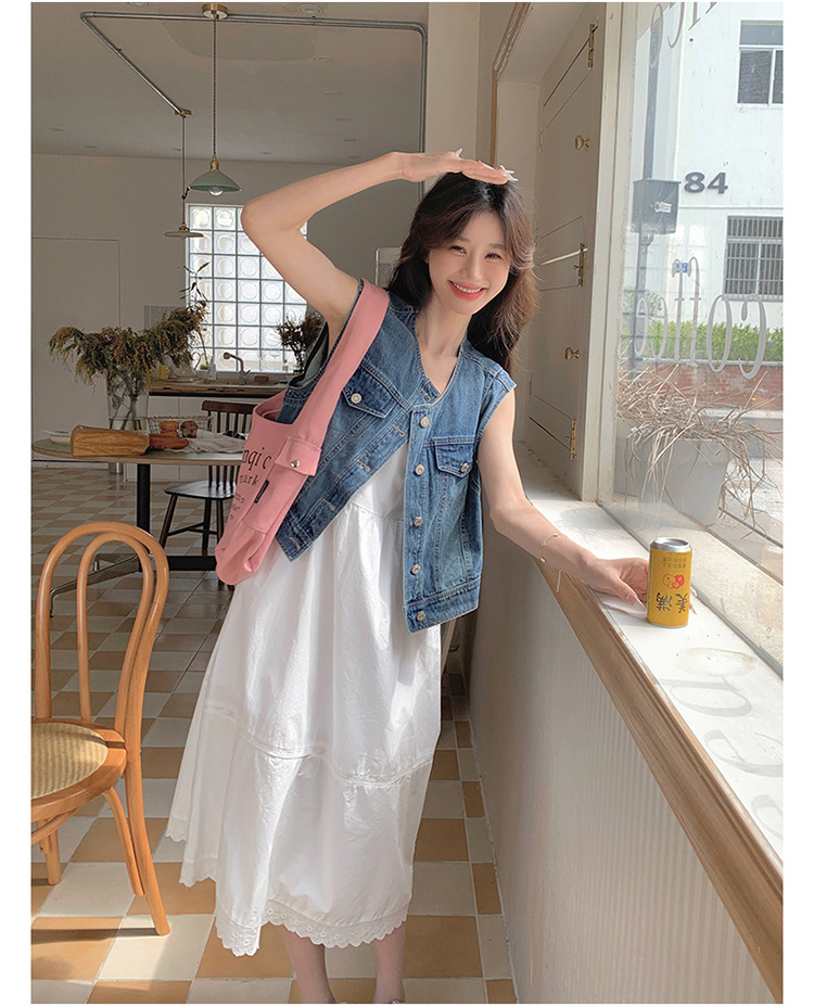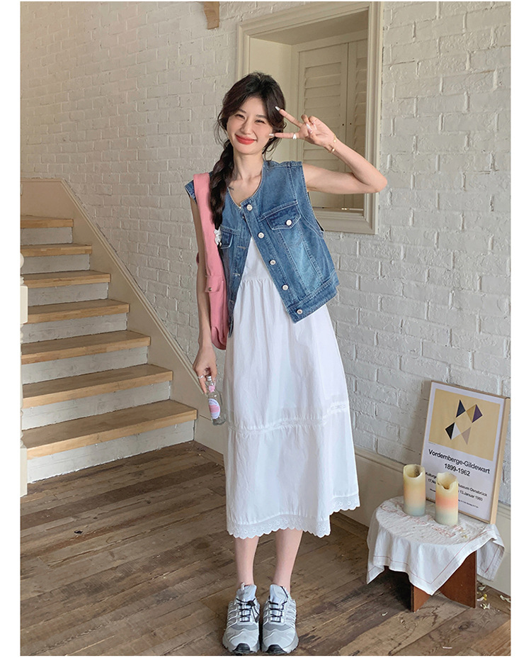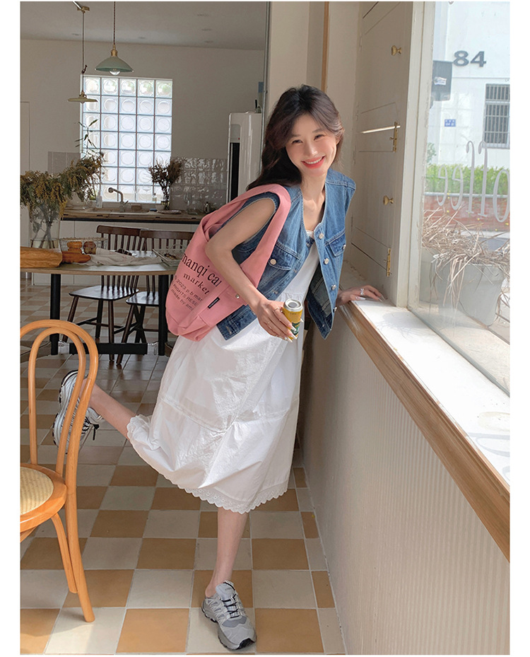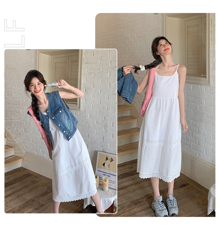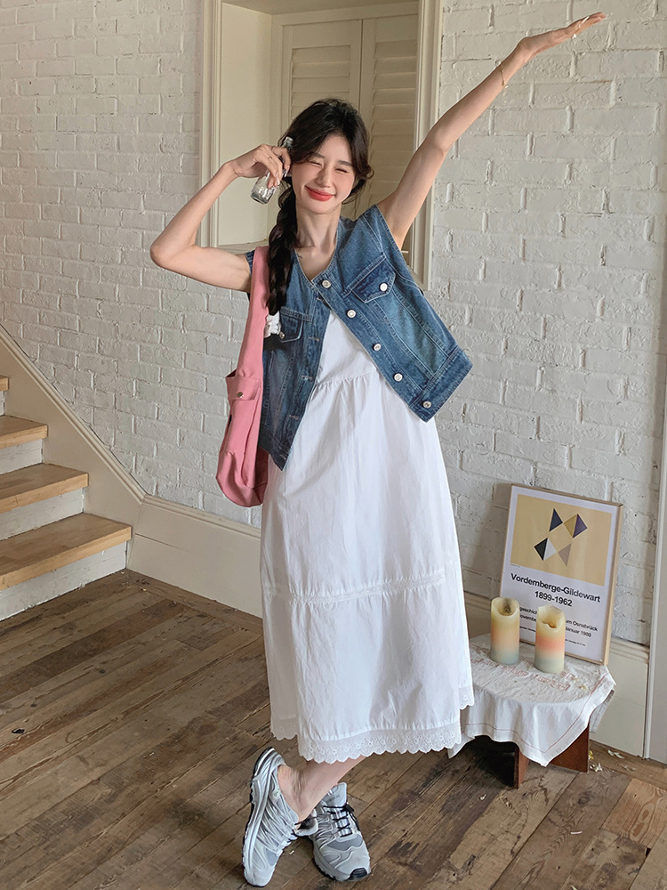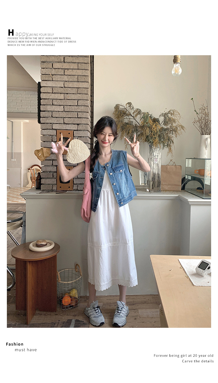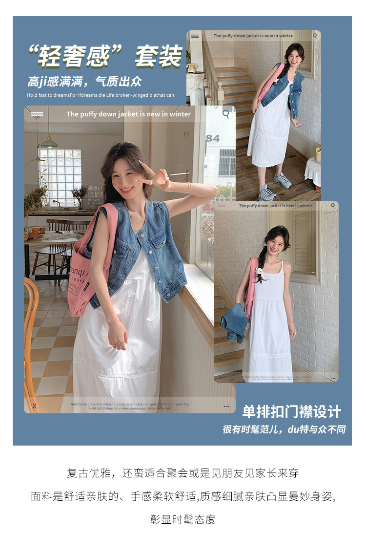 Bộ trang phục gồm áo khoác dáng veste và đầm hai dây, phù hợp cho mùa hè. Chất liệu vải dệt denim cho phần áo, tạo cảm giác thoải mái và dễ vận động. Đầm có thiết kế ôm nhẹ, giúp tôn dáng một cách tự nhiên. Có thể mặc riêng lẻ từng món hoặc kết hợp cùng nhau cho nhiều phong cách khác nhau. Màu sắc chủ đạo là trắng, dễ dàng phối đồ. | Tên sản phẩm: Áo Hai Dây Nữ Chất Liệu Jean Bò Hai Dây Hở Vai Trông Trẻ Hơn Tuổi Hàng Mùa Hè - Thời Trang Nữ | Mã sản phẩm: A7894 - Giá: 1.490.000đ | Mã nhà sản xuất: HADT-G04Hình ảnh sản phẩm