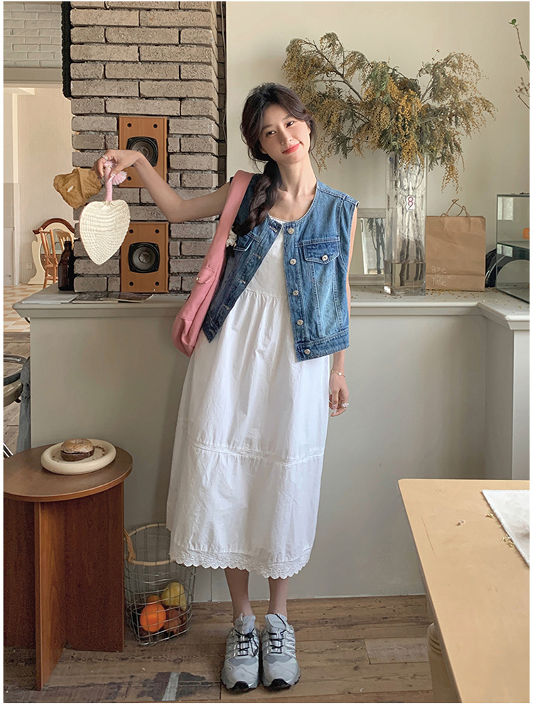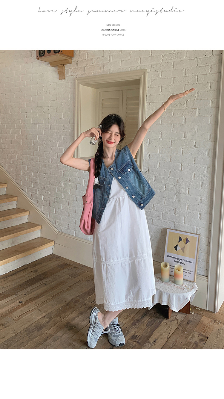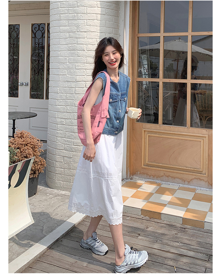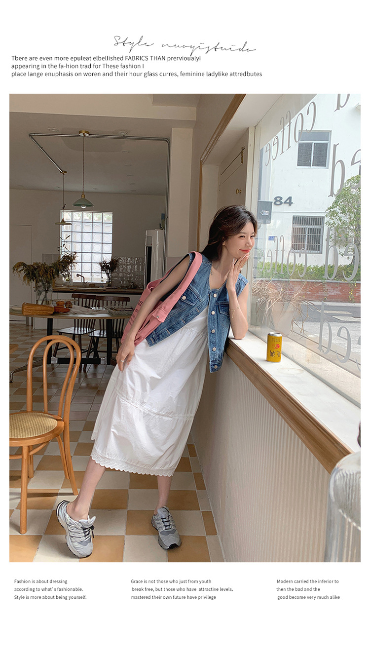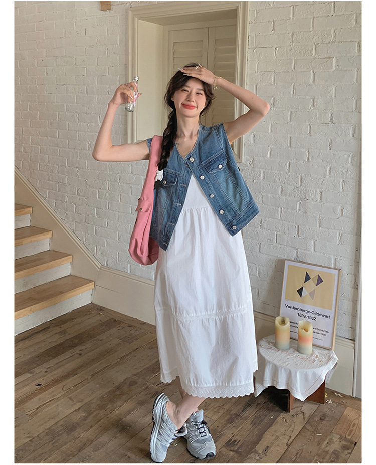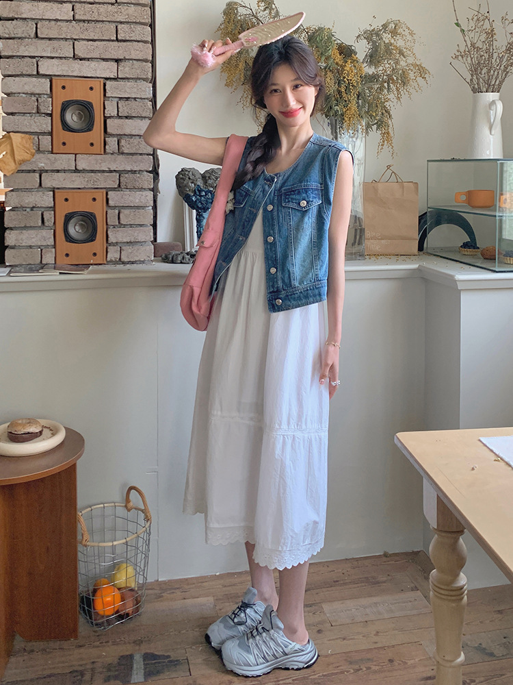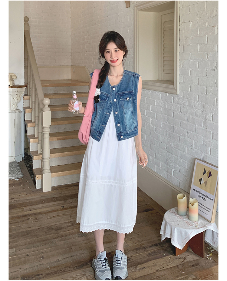 Bộ trang phục gồm áo khoác dáng veste và đầm hai dây, phù hợp cho mùa hè. Chất liệu vải dệt denim cho phần áo, tạo cảm giác thoải mái và dễ vận động. Đầm có thiết kế ôm nhẹ, giúp tôn dáng một cách tự nhiên. Có thể mặc riêng lẻ từng món hoặc kết hợp cùng nhau cho nhiều phong cách khác nhau. Màu sắc chủ đạo là trắng, dễ dàng phối đồ. | Tên sản phẩm: Áo Hai Dây Nữ Chất Liệu Jean Bò Hai Dây Hở Vai Trông Trẻ Hơn Tuổi Hàng Mùa Hè - Thời Trang Nữ | Mã sản phẩm: A7894 - Giá: 1.490.000đ | Mã nhà sản xuất: HADT-G04Hình ảnh sản phẩm