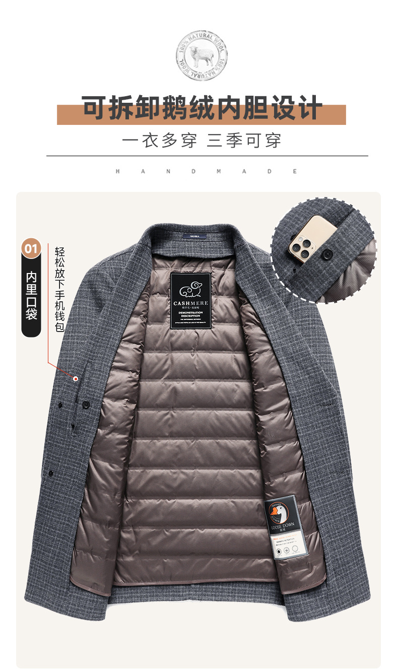 Áo khoác dành cho nam, thiết kế dáng dài phù hợp cho mùa thu đông. Điểm nổi bật là lớp lót bên trong làm từ lông vũ có thể tháo rời, giúp giữ ấm tốt. Bên ngoài là chất liệu dệt hai mặt ấm áp, tạo cảm giác mềm mại. Kiểu dáng kết hợp giữa công sức và thoải mái, dễ dàng phối đồ. Có thể mặc nguyên chiếc hoặc chỉ dùng phần áo ngoài khi thời tiết dịu mát. | Tên sản phẩm: Áo Khoác Nam Hàng Mùa Xuân Thu Đông - Thời Trang Nam | Mã sản phẩm: A8496 - Giá: 3.220.000đ | Mã nhà sản xuất: SUDIN-G06Hình ảnh sản phẩm
