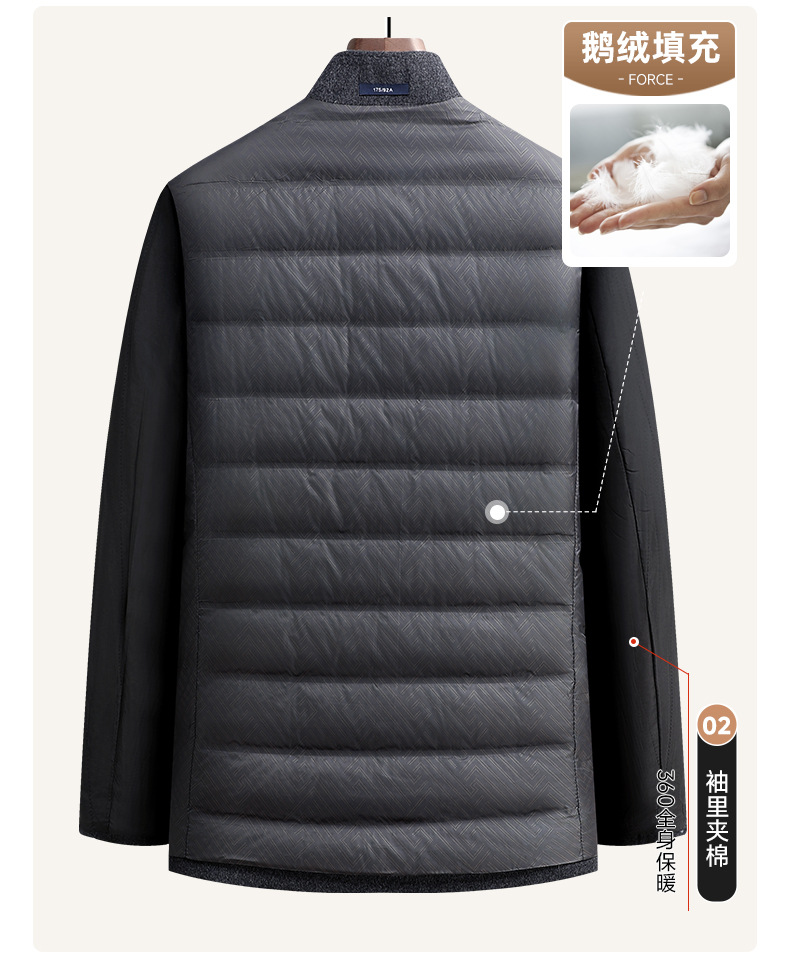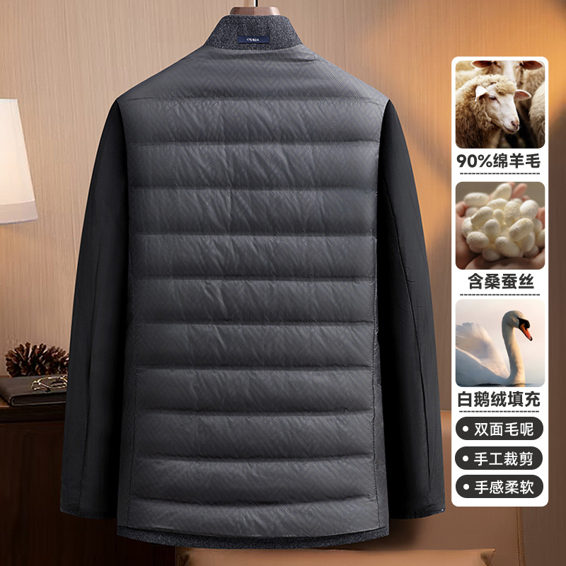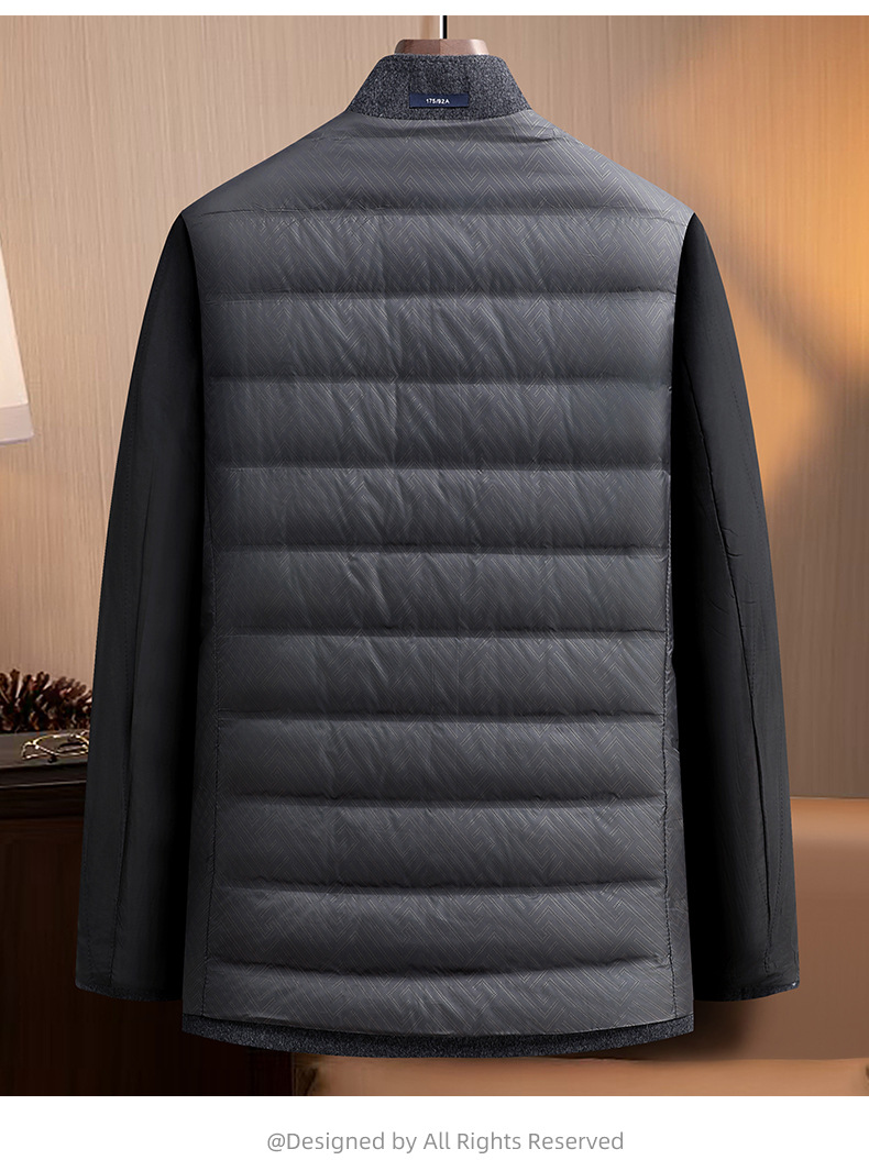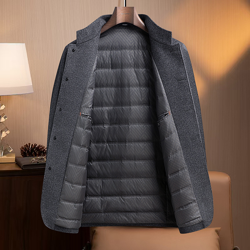 Áo khoác mùa lạnh dành cho nam, có cấu trúc hai lớp rất tiện lợi. Bên ngoài là chất liệu dạ dày dày dặn, cổ áo đứng giữ ấm tốt. Bên trong là lớp áo lót có thể tháo rời, được lót bằng lông vũ và pha thêm tơ tằm cùng len, giúp giữ nhiệt hiệu quả. Kiểu dáng ngắn gọn, phù hợp mặc trong tiết trời se lạnh. Có thể mặc riêng lớp ngoài, mặc riêng áo lót hoặc kết hợp cả hai tùy theo thời tiết. | Tên sản phẩm: Áo Khoác Nam Chất Liệu Lụa Tơ Tằm Hàng Mùa Xuân Thu Đông Trung Niên - Thời Trang Nam | Mã sản phẩm: A8570 - Giá: 3.240.000đ | Mã nhà sản xuất: SUDIN-G06Hình ảnh sản phẩm