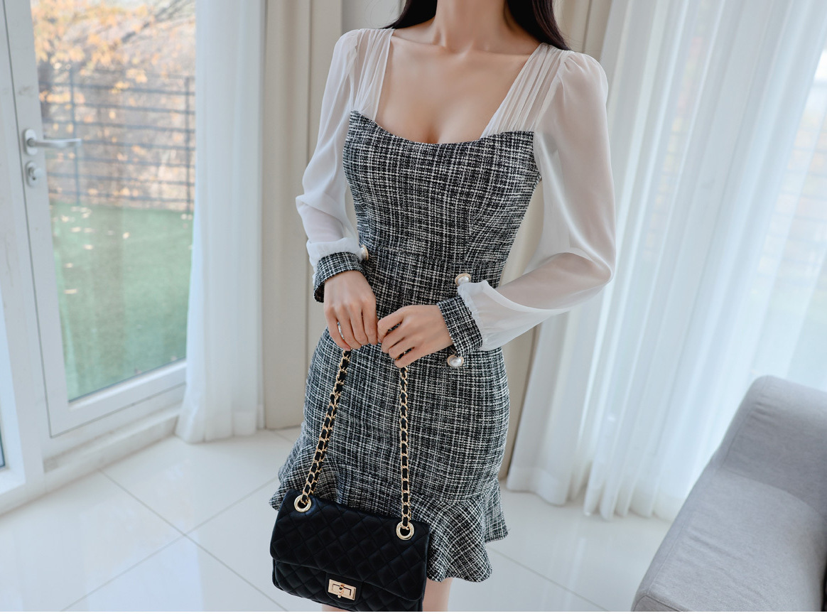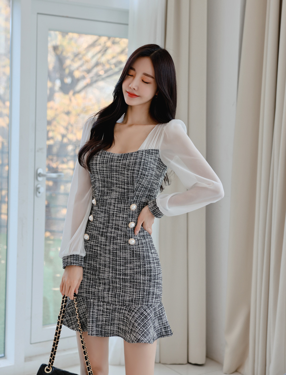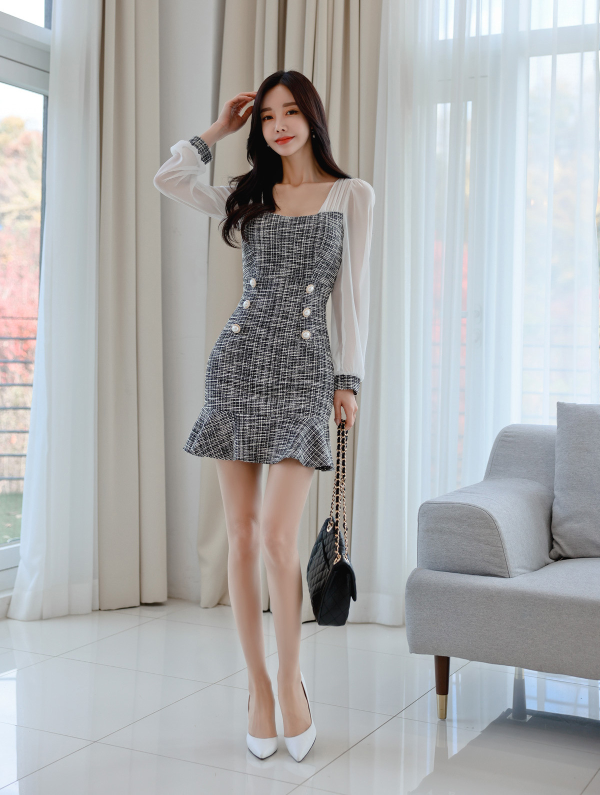 Chiếc đầm ngắn tay dài này có điểm nhấn từ phần cổ áo vuông độc đáo. Thiết kế kết hợp nhiều mảng màu tương phản tạo nên vẻ năng động, trẻ trung. Form dáng ôm gọn cơ thể, phần chân váy xòe nhẹ như đuôi cá duyên dáng. Sản phẩm phù hợp cho nhiều dịp đi chơi, dạo phố hay gặp gỡ bạn bè. Bạn có thể phối cùng giày thể thao hoặc giày bệt để tạo phong cách riêng. | Tên sản phẩm: Váy Đầm Liền Thân Nữ Dài Tay Kiểu Đuôi Cá Hàng Mùa Xuân Thu Đông Phong Cách Hàn Quốc - Thời Trang Nữ | Mã sản phẩm: A9074 - Giá: 790.000đ | Mã nhà sản xuất: JUOUTO-G02Hình ảnh sản phẩm