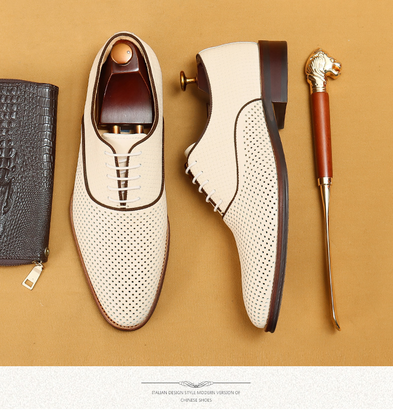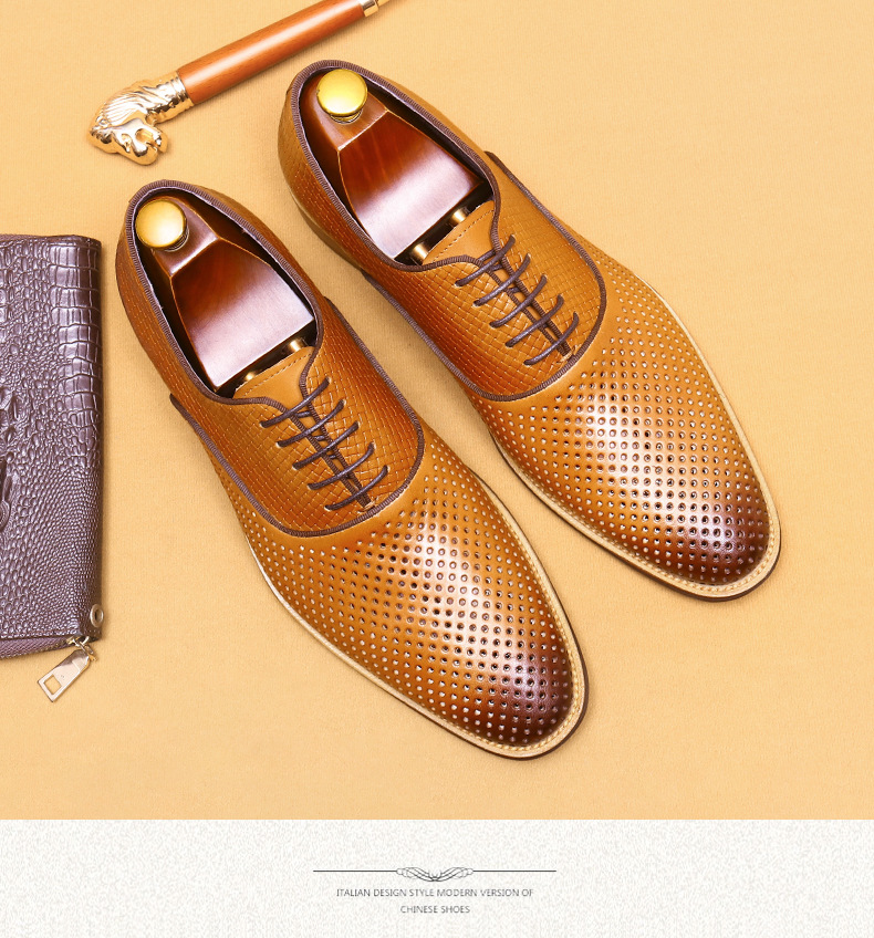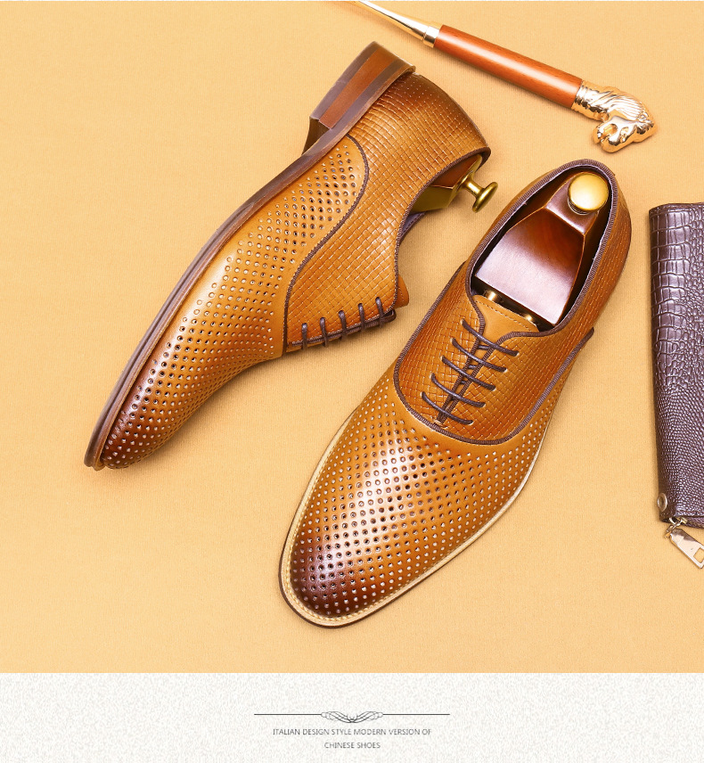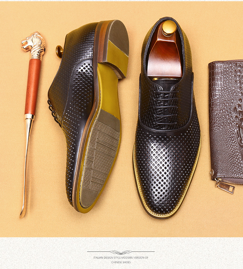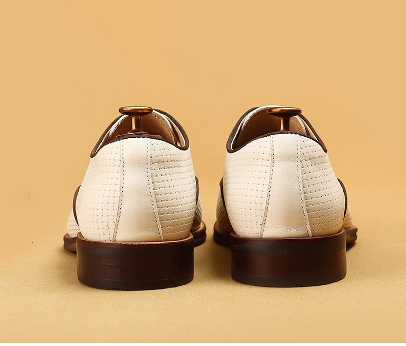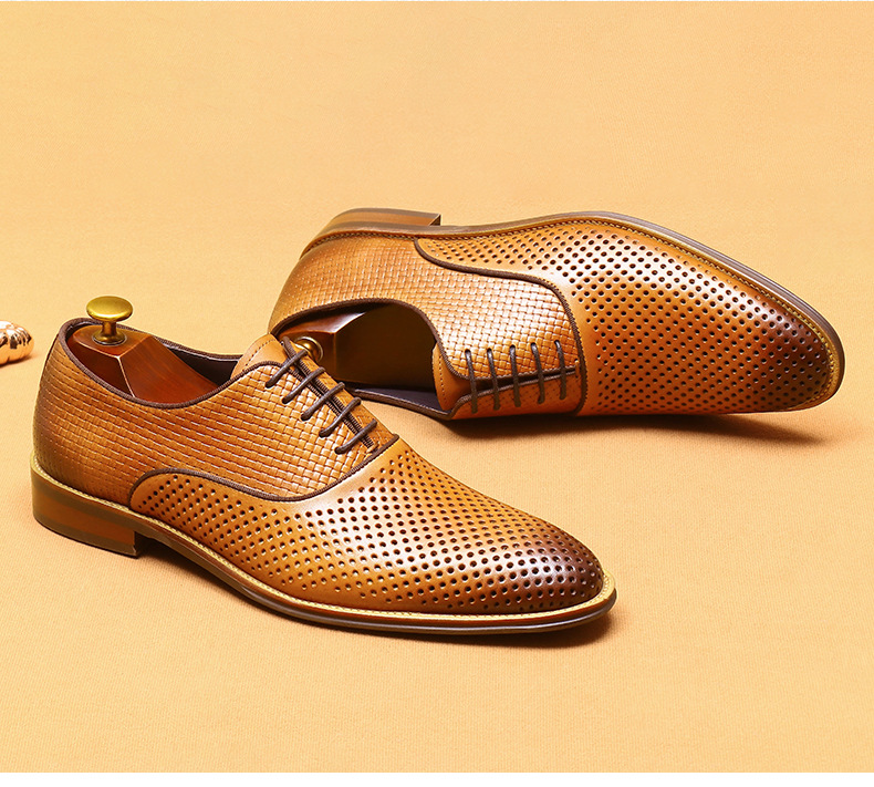 Giày da thật dành cho nam, thiết kế kiểu Oxford với mũi nhọn thanh lịch, phù hợp cho văn phòng hoặc dùng hằng ngày. Điểm nổi bật là phần trên làm từ da bò tự nhiên, kết hợp các chi tiết khoét lỗ tinh tế giúp không khí lưu thông tốt, mang lại cảm giác thoáng mát, dễ chịu cho đôi chân trong những ngày hè. Có thể phối hợp với nhiều loại trang phục khác nhau, từ quần âu cho đến quần vải thông thường. | Tên sản phẩm: Giày Da Nam Chất Liệu Da Bò Mũi Nhọn Thoáng Khí Hàng Mùa Hè - Giày Dép Nam | Mã sản phẩm: A9277 - Giá: 2.600.000đ | Mã nhà sản xuất: SHERAW-G06Hình ảnh sản phẩm