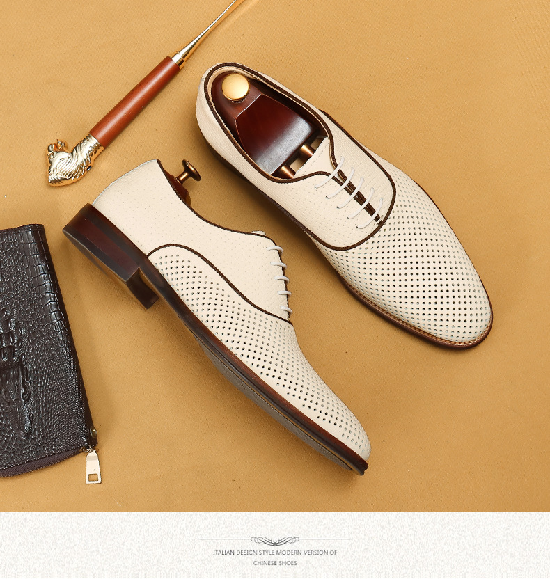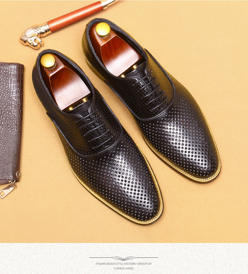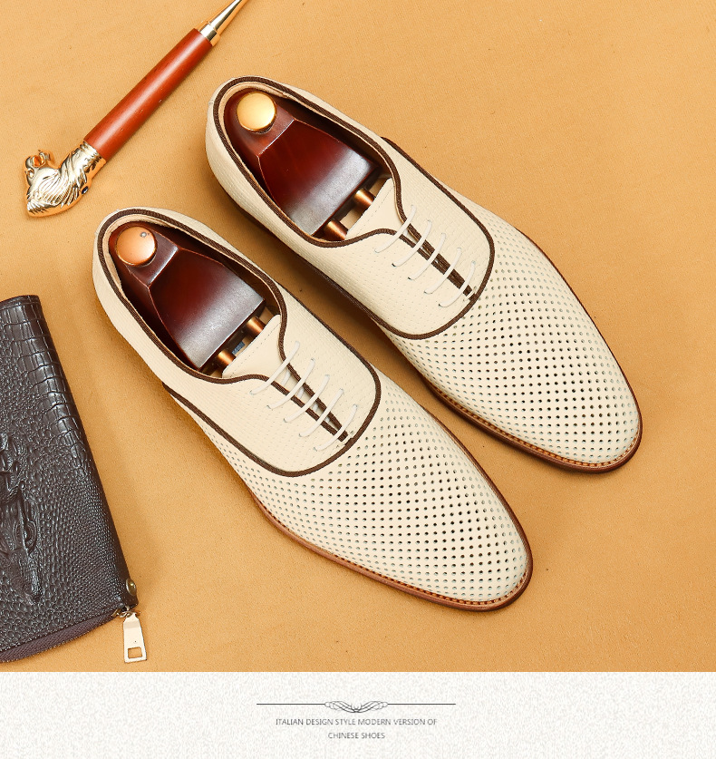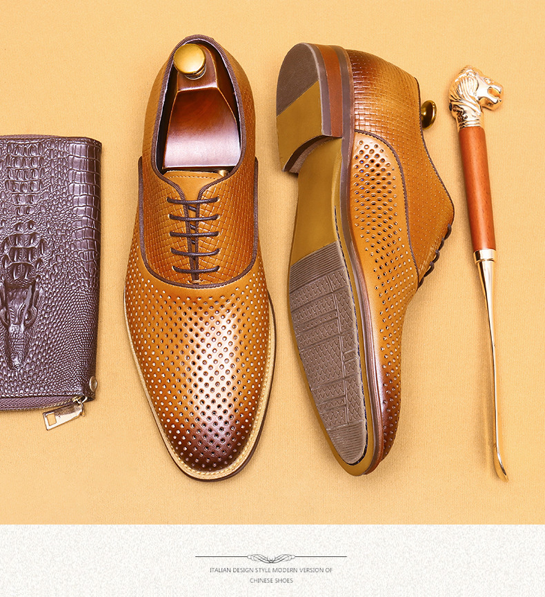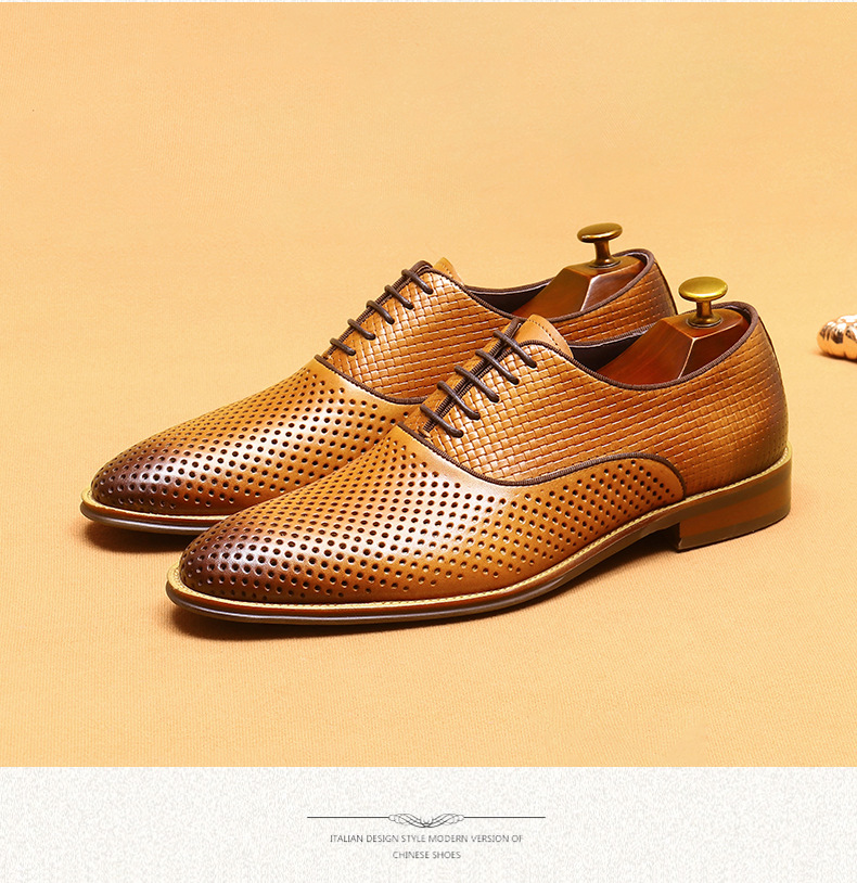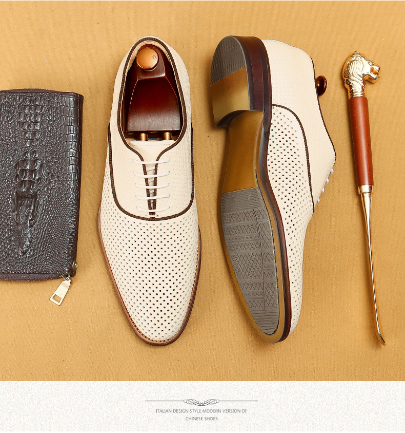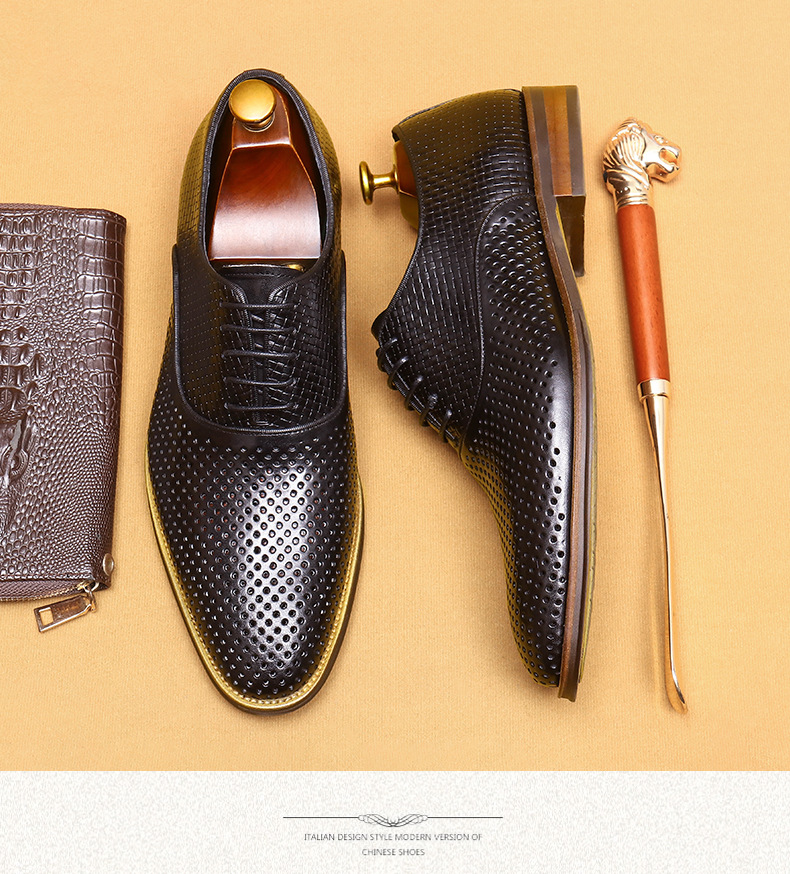 Giày da thật dành cho nam, thiết kế kiểu Oxford với mũi nhọn thanh lịch, phù hợp cho văn phòng hoặc dùng hằng ngày. Điểm nổi bật là phần trên làm từ da bò tự nhiên, kết hợp các chi tiết khoét lỗ tinh tế giúp không khí lưu thông tốt, mang lại cảm giác thoáng mát, dễ chịu cho đôi chân trong những ngày hè. Có thể phối hợp với nhiều loại trang phục khác nhau, từ quần âu cho đến quần vải thông thường. | Tên sản phẩm: Giày Da Nam Chất Liệu Da Bò Mũi Nhọn Thoáng Khí Hàng Mùa Hè - Giày Dép Nam | Mã sản phẩm: A9277 - Giá: 2.600.000đ | Mã nhà sản xuất: SHERAW-G06Hình ảnh sản phẩm