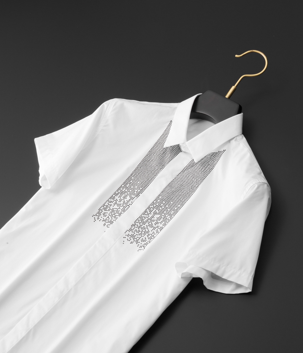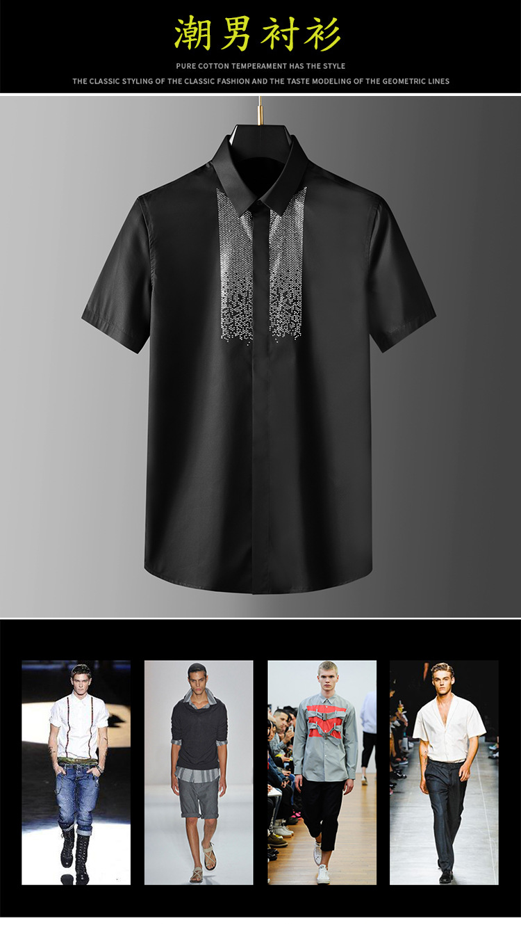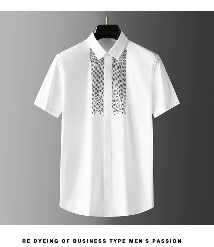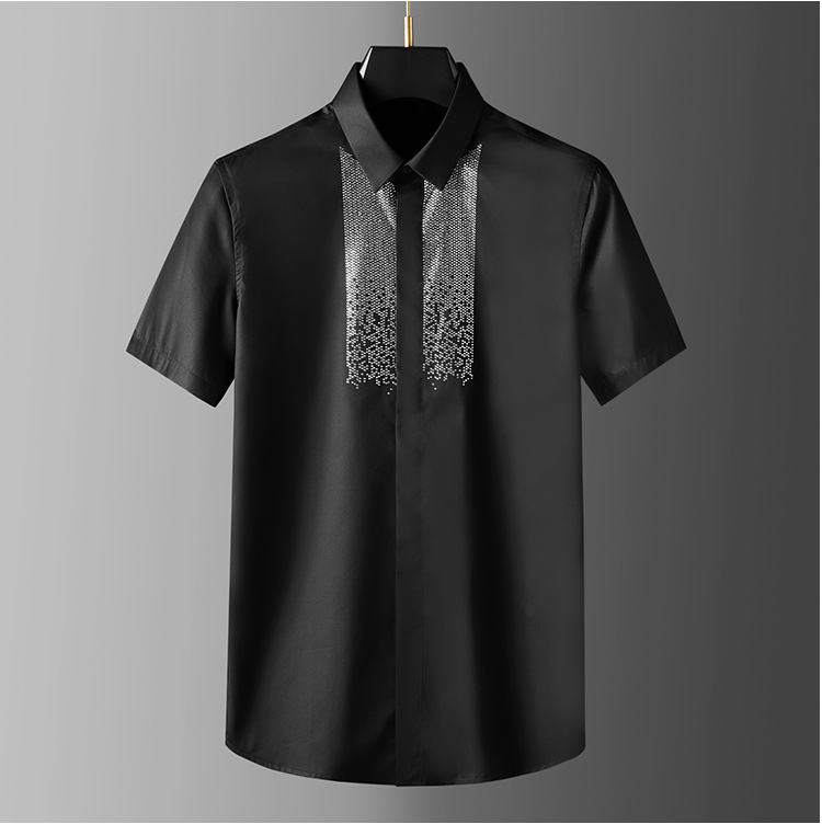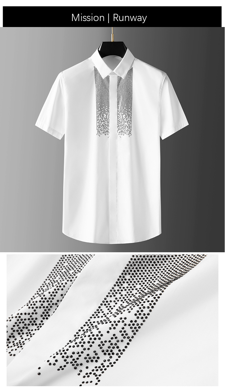 Áo thun ngắn tay mang phong cách trẻ trung, nổi bật với hình in đính hạt lấp lánh tạo điểm nhấn. Chất liệu vải mềm mại, thoáng mát, thích hợp mặc trong mùa hè. Kiểu dáng ôm vừa vặn, dễ dàng phối hợp cùng quần short hay quần jeans. Sản phẩm phù hợp cho các hoạt động hằng ngày, đi chơi hay dự tiệc nhẹ. Có thể giặt máy nhẹ nhàng và phơi khô trong bóng mát để bảo quản hình in. | Tên sản phẩm: Áo Sơ Mi Nam Gắn Đá Ngắn Tay Hàng Mùa Hè - Thời Trang Nam | Mã sản phẩm: A9428 - Giá: 1.280.000đ | Mã nhà sản xuất: FODAR-G04Hình ảnh sản phẩm