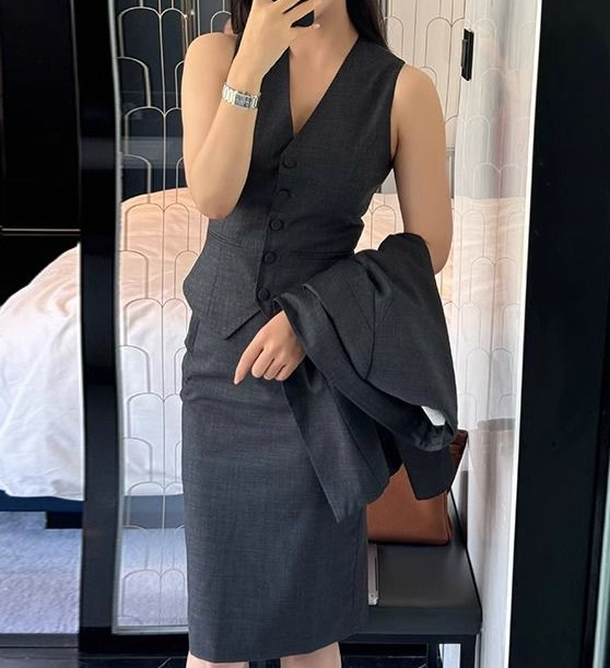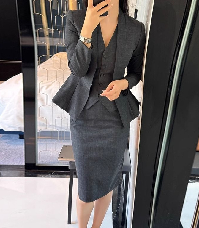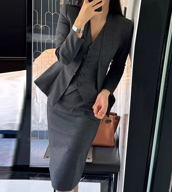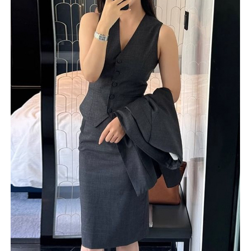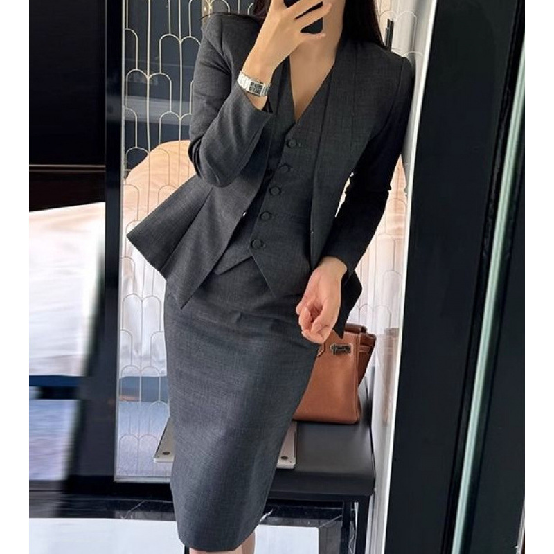 Bộ trang phục ba mảnh dành cho nữ, gồm áo vét, áo gilê và chân váy, được thiết kế dành cho thời tiết mùa thu. Kiểu dáng lịch sự, phù hợp cho môi trường công sở và các dịp đi làm. Tông màu xám đậm mang đến vẻ ngoại hình chỉn chu, dễ dàng phối đồ. Bạn có thể mặc nguyên bộ hoặc tách rời từng món để phối với các trang phục khác, tạo nên nhiều phong cách đa dạng. | Tên sản phẩm: Áo Vest Nữ Vest Cả Bộ 3 Món Hàng Mùa Xuân Thu Đông - Thời Trang Nữ | Mã sản phẩm: A9516 - Giá: 3.380.000đ | Mã nhà sản xuất: CHTYAI-G06Hình ảnh sản phẩm