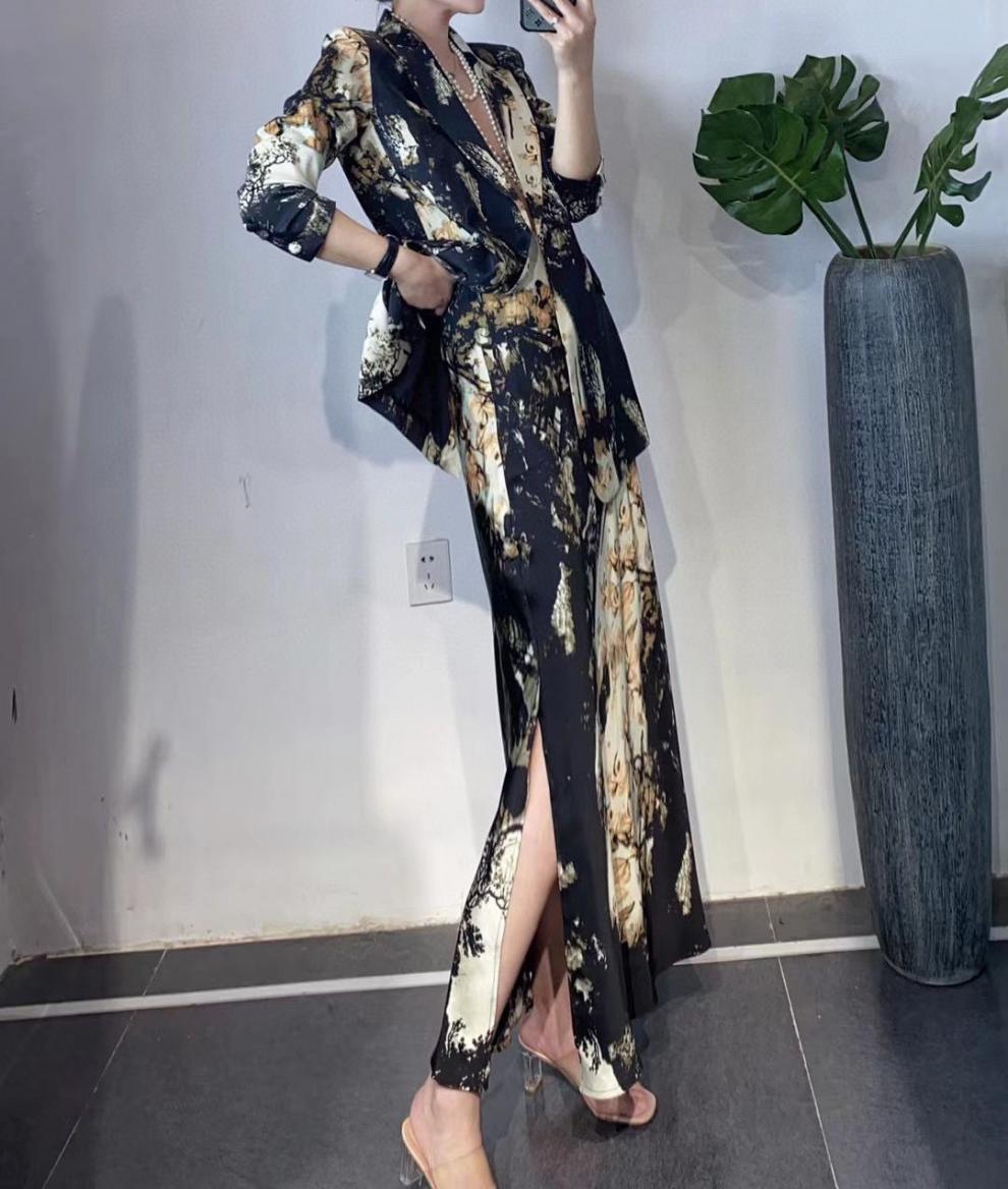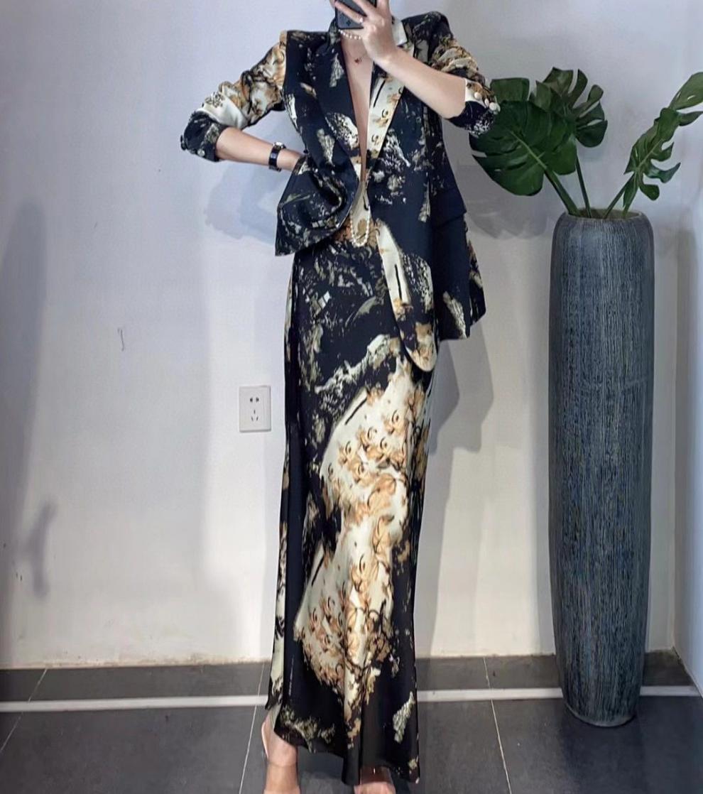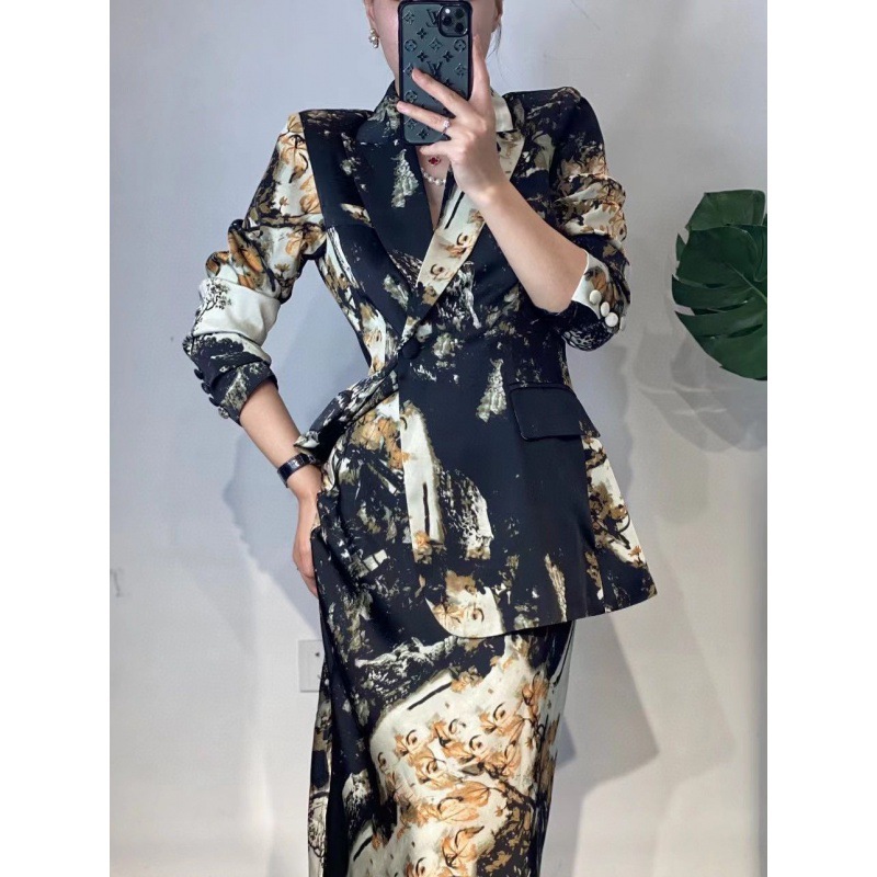 Bộ trang phục hai mảnh này gồm áo khoác kiểu và chân váy dáng dài, được làm từ chất liệu vải mềm mại. Áo khoác có họa tiết in nổi bật, phối cùng chân váy dáng thẳng có điểm xẻ nhẹ ở phần gấu. Kiểu dáng phù hợp cho những dịp đi làm hoặc gặp mặt. Có thể mặc nguyên bộ để tạo vẻ chỉn chu, hoặc phối riêng từng món với các trang phục khác nhau trong tủ đồ. | Tên sản phẩm: Áo Vest Nữ Vest Cả Bộ 2 Món Họa Tiết Hoa Hàng Mùa Xuân Thu Đông - Thời Trang Nữ | Mã sản phẩm: A9528 - Giá: 2.730.000đ | Mã nhà sản xuất: CHTYAI-G06Hình ảnh sản phẩm