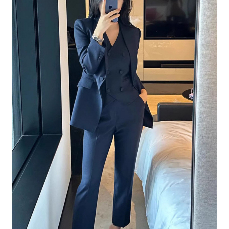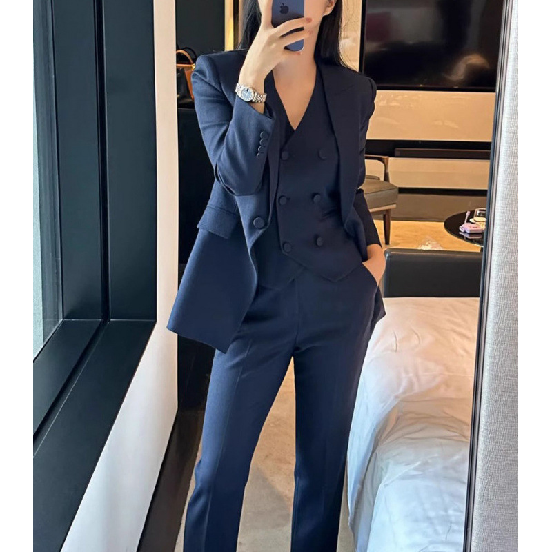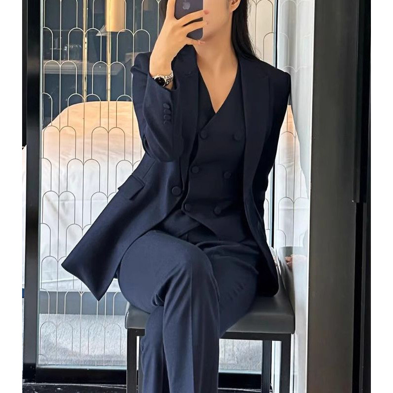 Áo vest màu xanh đậm dáng ôm tôn dáng, phù hợp tiết trời thu đông. Thiết kế tạo cảm giác thon gọn, phối cùng áo gilê thanh lịch bên trong. Chất liệu vải mềm mại, tạo sự thoải mái khi mặc suốt ngày dài. Dễ dàng kết hợp với quần âu hoặc chân váy để hoàn thiện bộ trang phục công sở. Mặc bên ngoài áo sơ mi hoặc áo phông cơ bản đều phù hợp. | Tên sản phẩm: Áo Vest Nữ Vest Hàng Mùa Xuân Thu Đông Đồ Công Sở - Thời Trang Nữ | Mã sản phẩm: A9553 - Giá: 3.650.000đ | Mã nhà sản xuất: CHTYAI-G06Hình ảnh sản phẩm