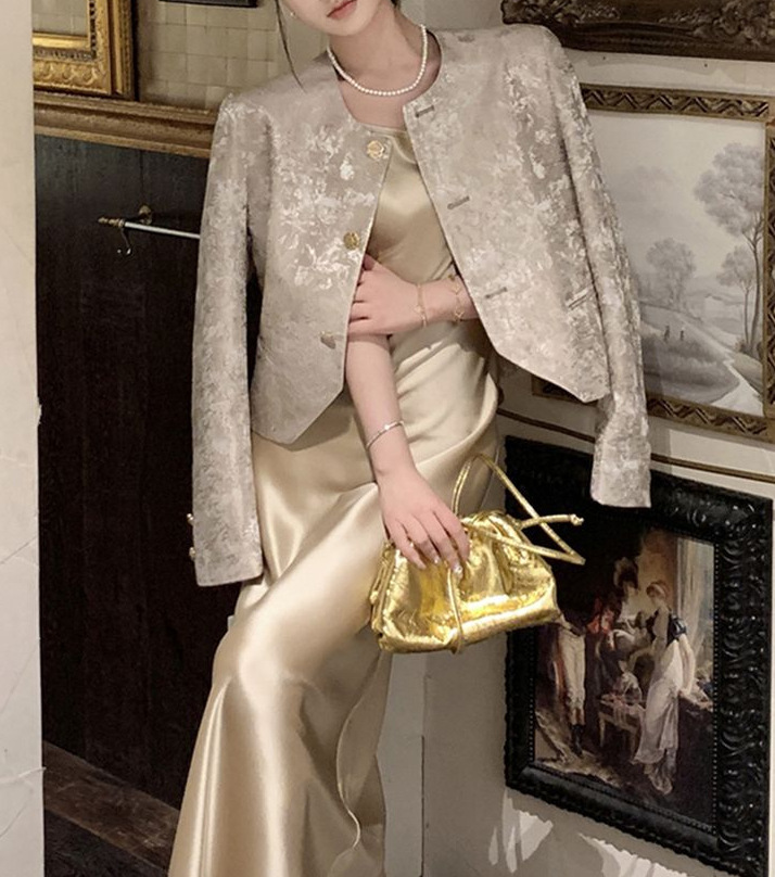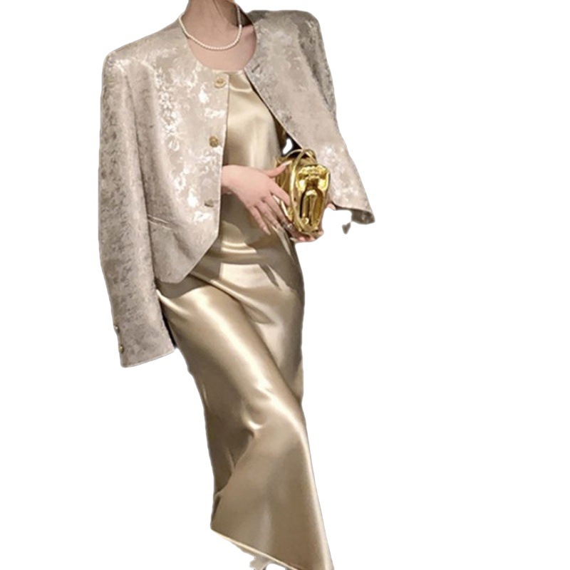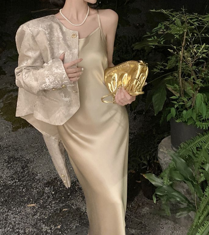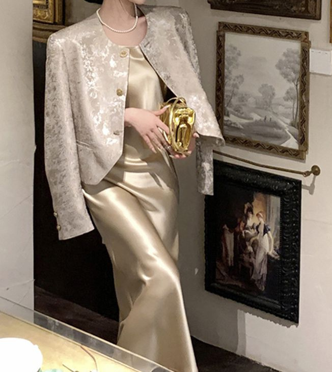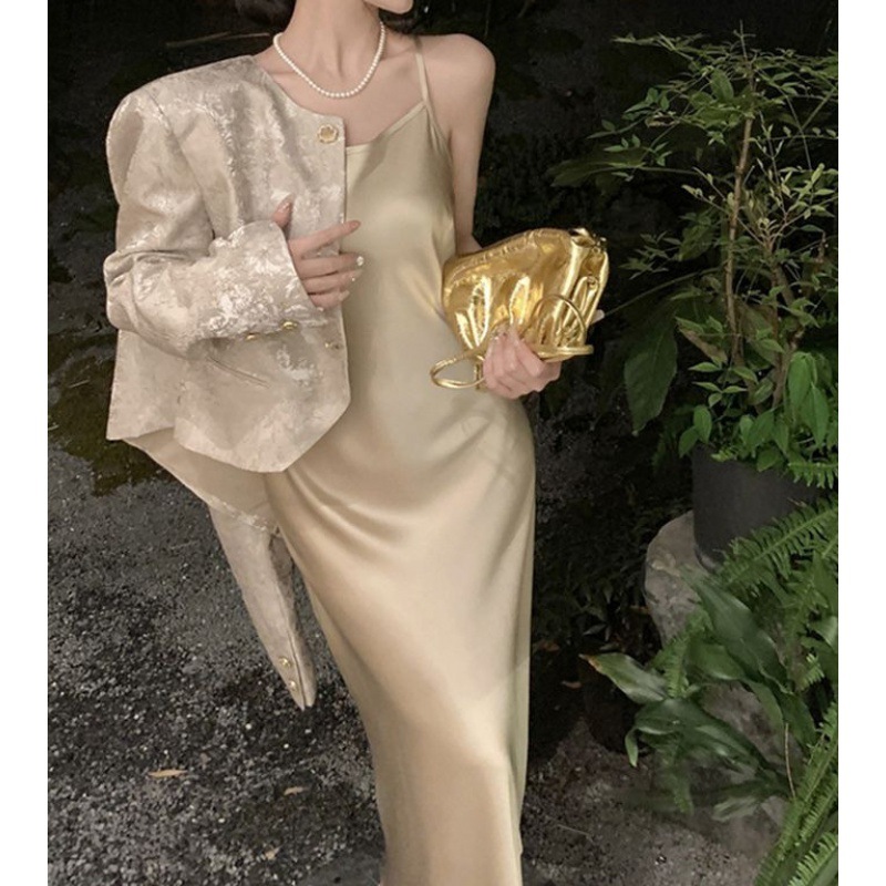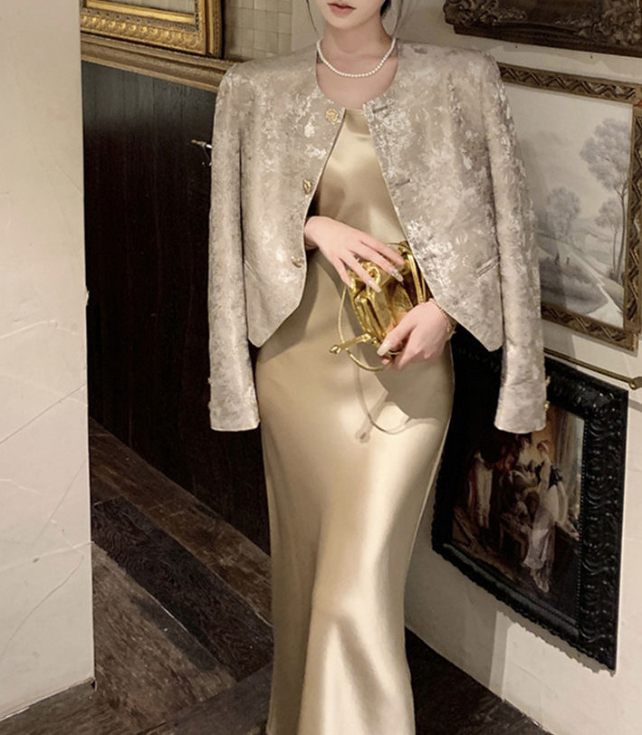 Bộ trang phục này gồm áo khoác mỏng và đầm váy liền, phù hợp cho mùa xuân và mùa thu. Áo được dệt hoa văn tinh tế, mặc cùng đầm dáng suông chất vải mềm mại. Kiểu dáng mang nét đẹp xưa nhẹ nhàng nhưng vẫn hiện đại. Có thể mặc nguyên bộ hoặc phối với trang phục khác. Phù hợp cho nhiều dịp trong ngày, từ dạo phố đến gặp mặt. | Tên sản phẩm: Áo Hai Dây Nữ Họa Tiết Hoa Hai Dây Hở Vai Hàng Mùa Xuân Thu Đông Phục Cổ Cổ Điển - Thời Trang Nữ | Mã sản phẩm: A9566 - Giá: 990.000đ | Mã nhà sản xuất: CHTYAI-G03Hình ảnh sản phẩm