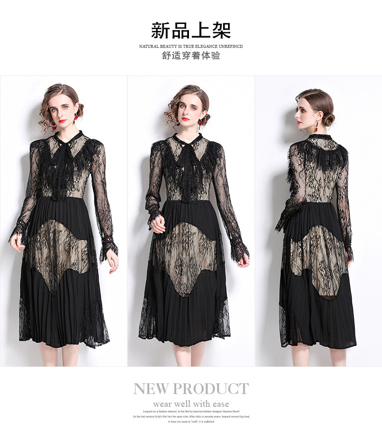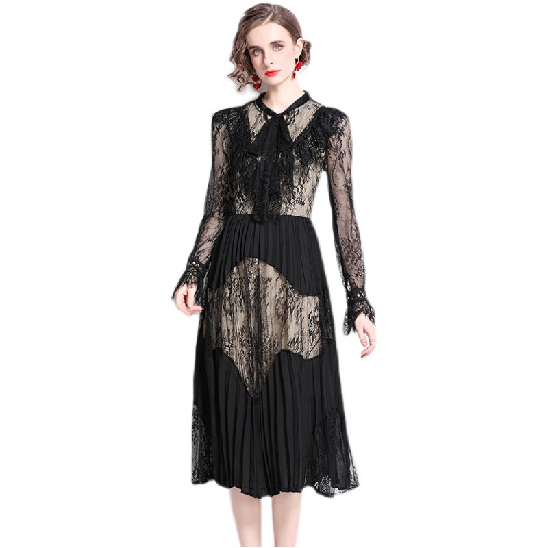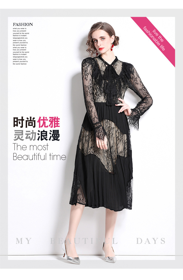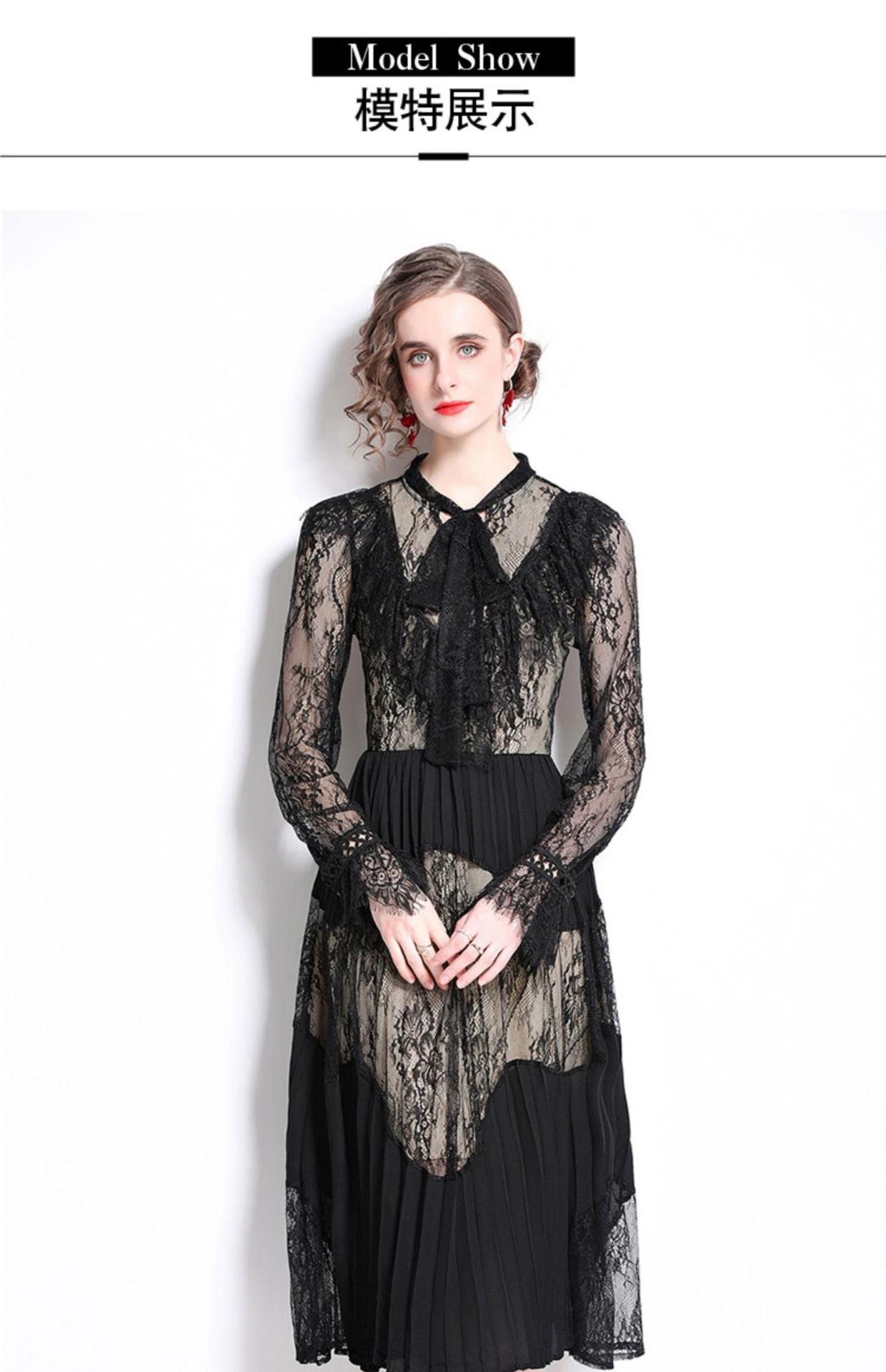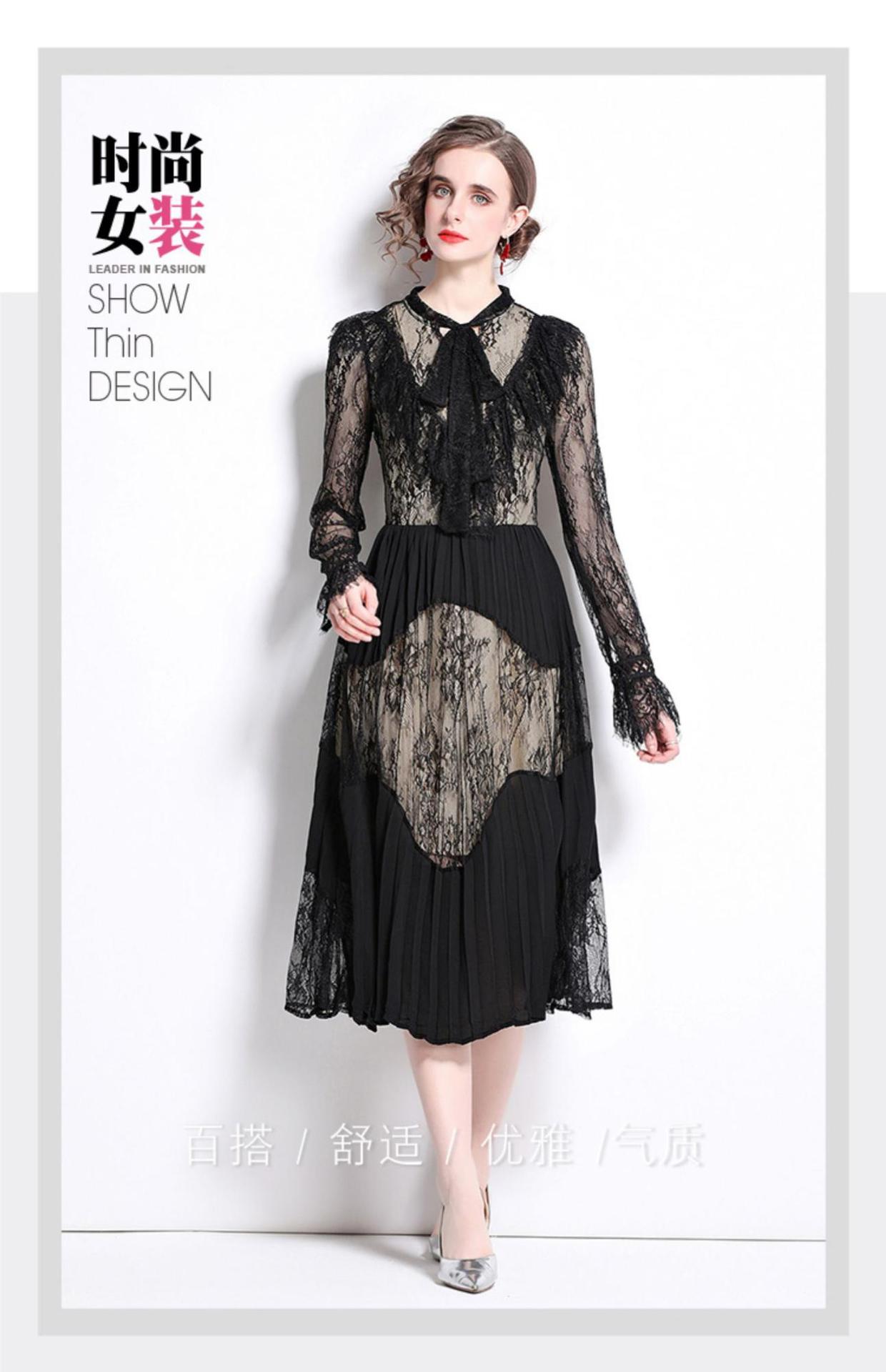 Chiếc đầm dành cho mùa xuân với điểm nhấn là phần cổ có nơ điều chỉnh được. Tay áo dài sử dụng chất liệu có hiệu ứng xuyên thấu tinh tế, kết hợp cùng đường diềm đăng ten mềm mại. Thiết kế ôm eo, phối cùng phần thân dưới xếp li và vạt rộng tạo dáng điệu thướt tha. Mặc cùng giày cao gót hoặc giày búp bê đều phù hợp để tôn lên vẻ nữ tính. | Tên sản phẩm: Váy Đầm Liền Thân Nữ Chất Liệu Ren Dài Tay Hàng Mùa Xuân Thu Đông - Thời Trang Nữ | Mã sản phẩm: A9593 - Giá: 940.000đ | Mã nhà sản xuất: GUDG-G03Hình ảnh sản phẩm