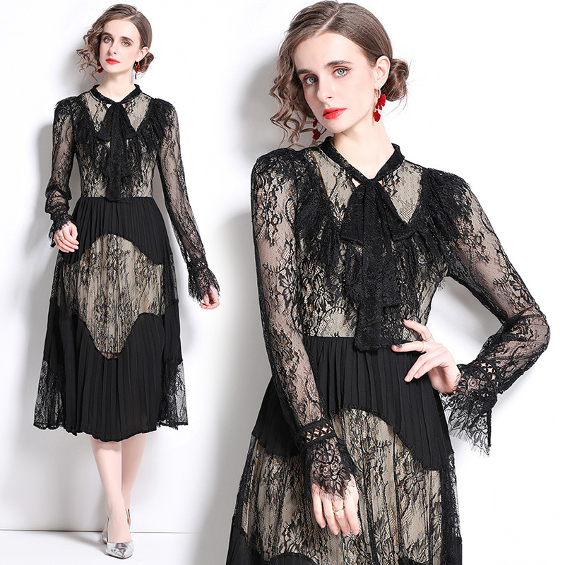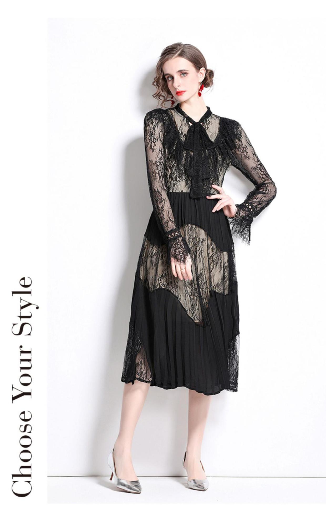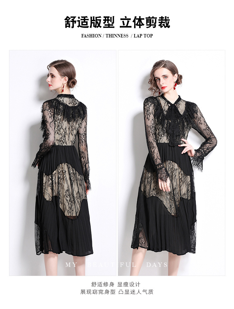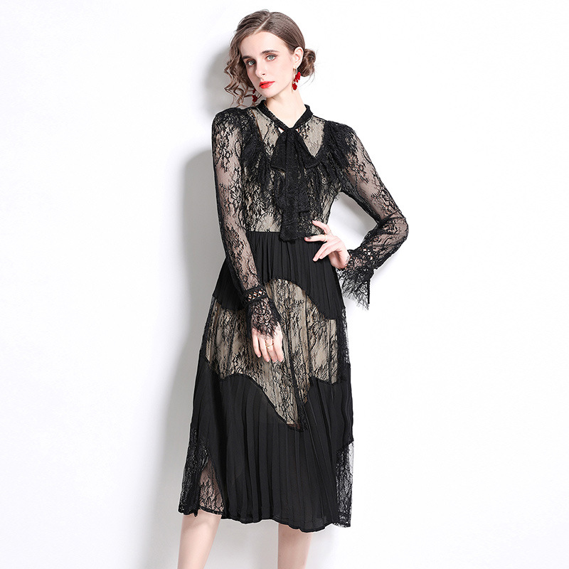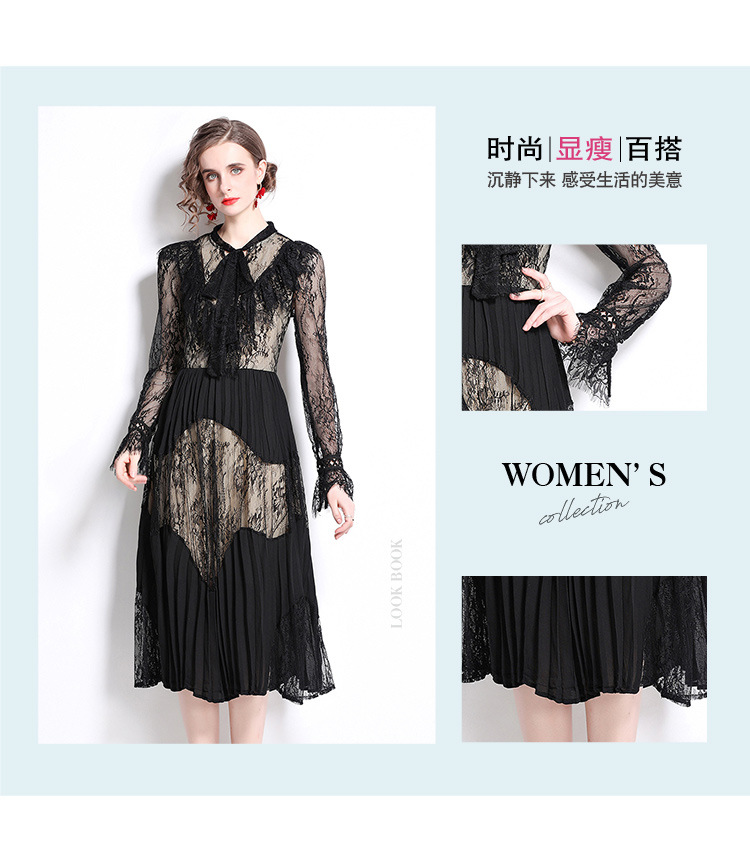 Chiếc đầm dành cho mùa xuân với điểm nhấn là phần cổ có nơ điều chỉnh được. Tay áo dài sử dụng chất liệu có hiệu ứng xuyên thấu tinh tế, kết hợp cùng đường diềm đăng ten mềm mại. Thiết kế ôm eo, phối cùng phần thân dưới xếp li và vạt rộng tạo dáng điệu thướt tha. Mặc cùng giày cao gót hoặc giày búp bê đều phù hợp để tôn lên vẻ nữ tính. | Tên sản phẩm: Váy Đầm Liền Thân Nữ Chất Liệu Ren Dài Tay Hàng Mùa Xuân Thu Đông - Thời Trang Nữ | Mã sản phẩm: A9593 - Giá: 940.000đ | Mã nhà sản xuất: GUDG-G03Hình ảnh sản phẩm