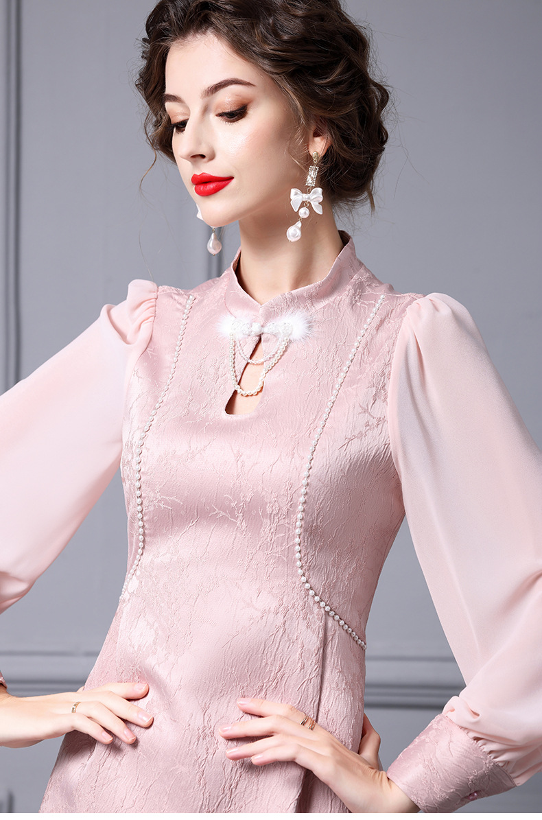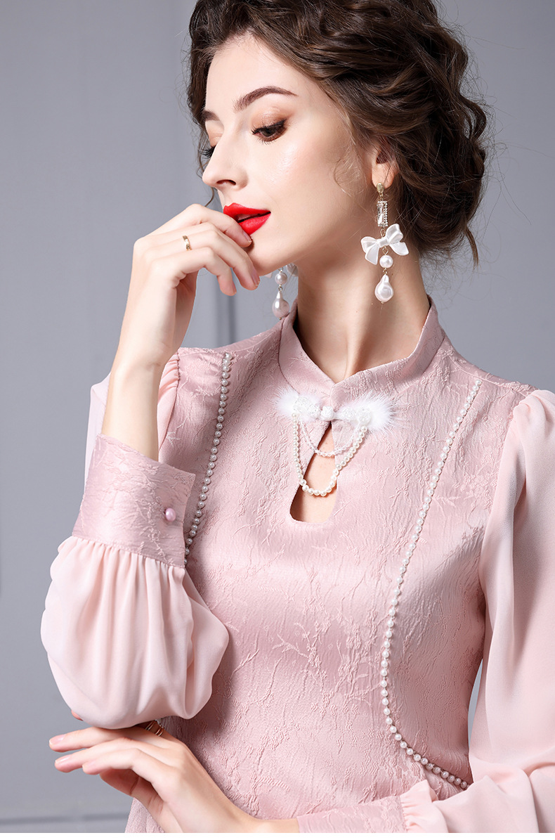 Chiếc đầm dáng dài cách tân mang sắc hồng dịu dàng. Cổ đứng thanh lịch kết hợp nút cài hình lông vũ tinh xảo. Chất vải dệt hoa văn nổi bền đẹp, ôm nhẹ đường cong cơ thể. Mẫu thiết kế phù hợp mặc trong tiết trời xuân thu, dễ dàng phối cùng giày cao gót hay balo. Sản phẩm thích hợp cho các dịp gặp mặt, dạo phố hay chụp ảnh lưu niệm. | Tên sản phẩm: Váy Đầm Liền Thân Nữ Họa Tiết Hoa Hàng Mùa Xuân Thu Đông - Thời Trang Nữ | Mã sản phẩm: A9734 - Giá: 2.160.000đ | Mã nhà sản xuất: SHDAP-G05Hình ảnh sản phẩm