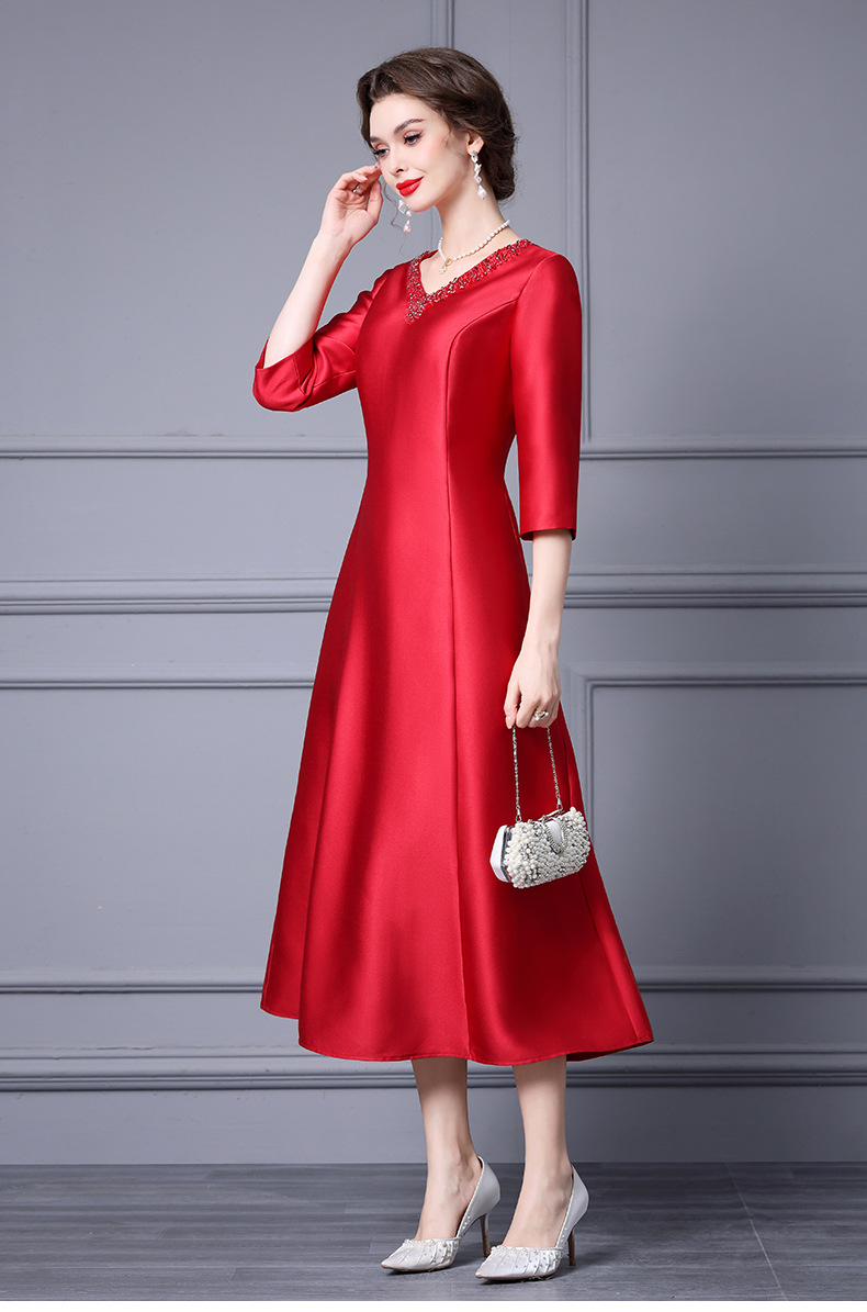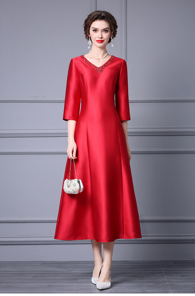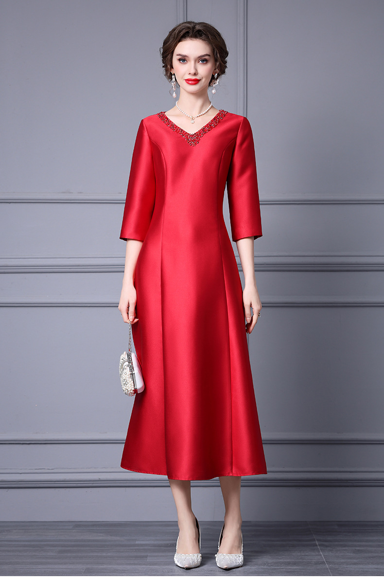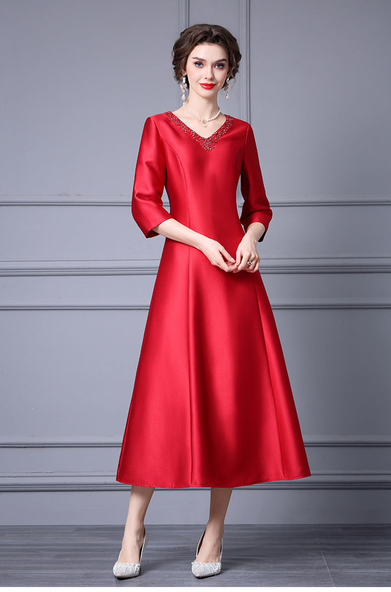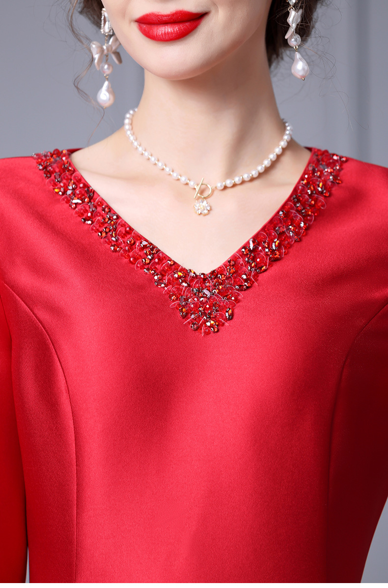 Chiếc đầm dáng dài mang sắc đỏ nổi bật, phù hợp cho mùa thu. Thiết kế có phần cổ chữ V, tay áo dài ba phần và thân váy xòe nhẹ nhàng tạo dáng điệu đà. Điểm nhấn tinh tế đến từ những hạt đá được gắn tỉ mỉ bằng tay. Sản phẩm thích hợp để mặc trong các buổi gặp mặt hoặc sự kiện. Có thể giặt bằng tay và phơi ở nơi râm mát để giữ dáng váy lâu bền. | Tên sản phẩm: Váy Đầm Liền Thân Dáng Dài Nữ Cổ Chữ V Hàng Mùa Xuân Thu Đông - Thời Trang Nữ | Mã sản phẩm: A9853 - Giá: 2.870.000đ | Mã nhà sản xuất: SHDAP-G06Hình ảnh sản phẩm