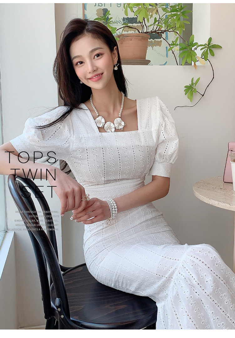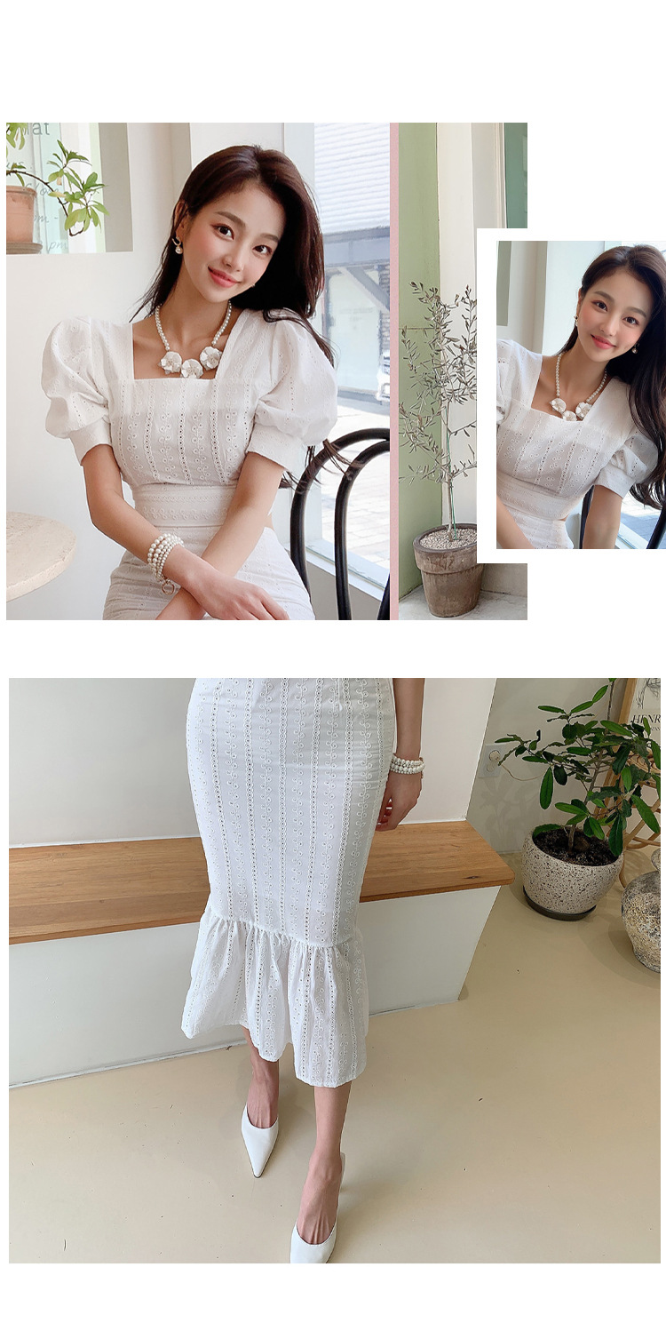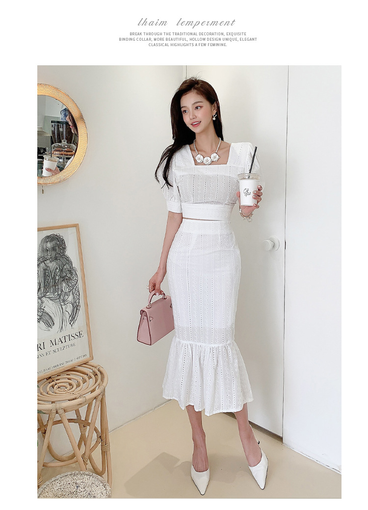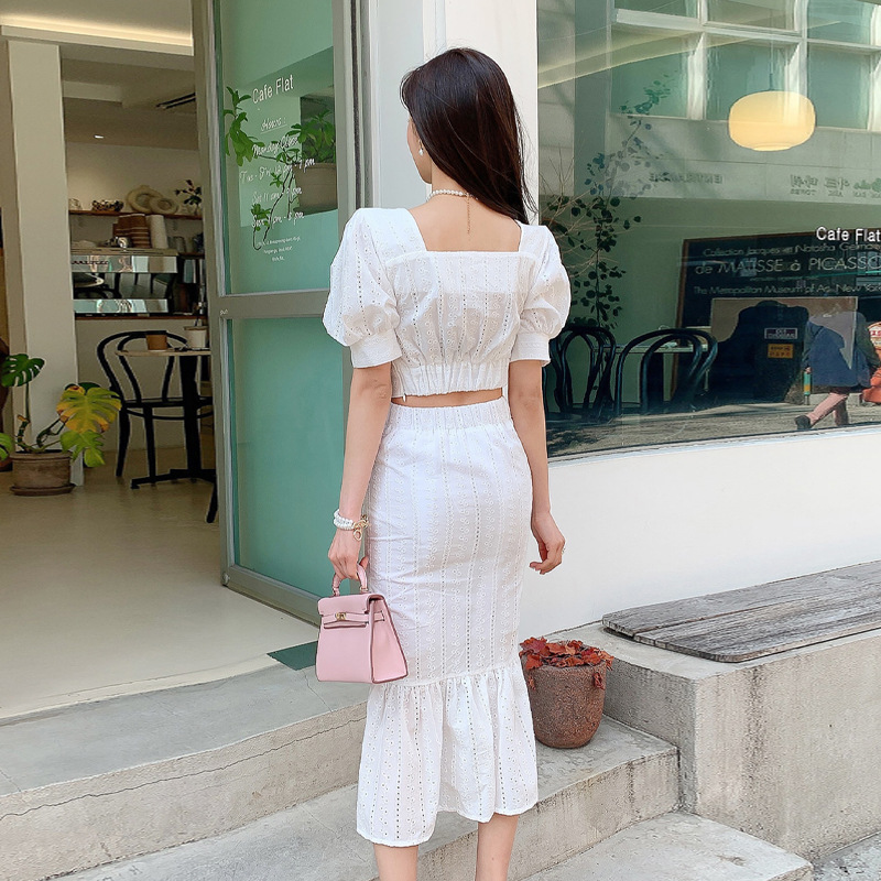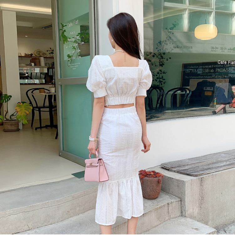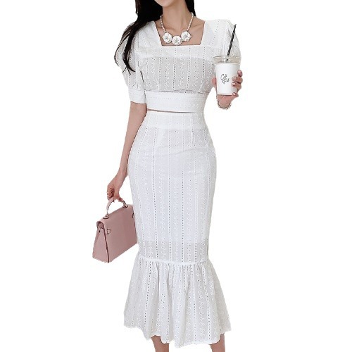 Bộ trang phục hai mảnh này có áo cổ vuông kết hợp tay bồng, cùng chân váy dáng dài xòe nhẹ phần gấu như đuôi cá. Kiểu dáng tôn dáng, phù hợp cho những dịp đi chơi hay gặp mặt. Chất vải mềm mại, thoáng mát giúp người mặc dễ chịu. Có thể mặc nguyên bộ hoặc phối cùng các món đồ khác. Giặt nhẹ tay và phơi nơi râm mát để giữ form váy đẹp lâu. | Tên sản phẩm: Đồ Bộ Nữ Tay Phồng Cả Bộ 2 Món Kiểu Đuôi Cá Hàng Mùa Hè - Thời Trang Nữ | Mã sản phẩm: A9940 - Giá: 900.000đ | Mã nhà sản xuất: ZHOUT-G03Hình ảnh sản phẩm