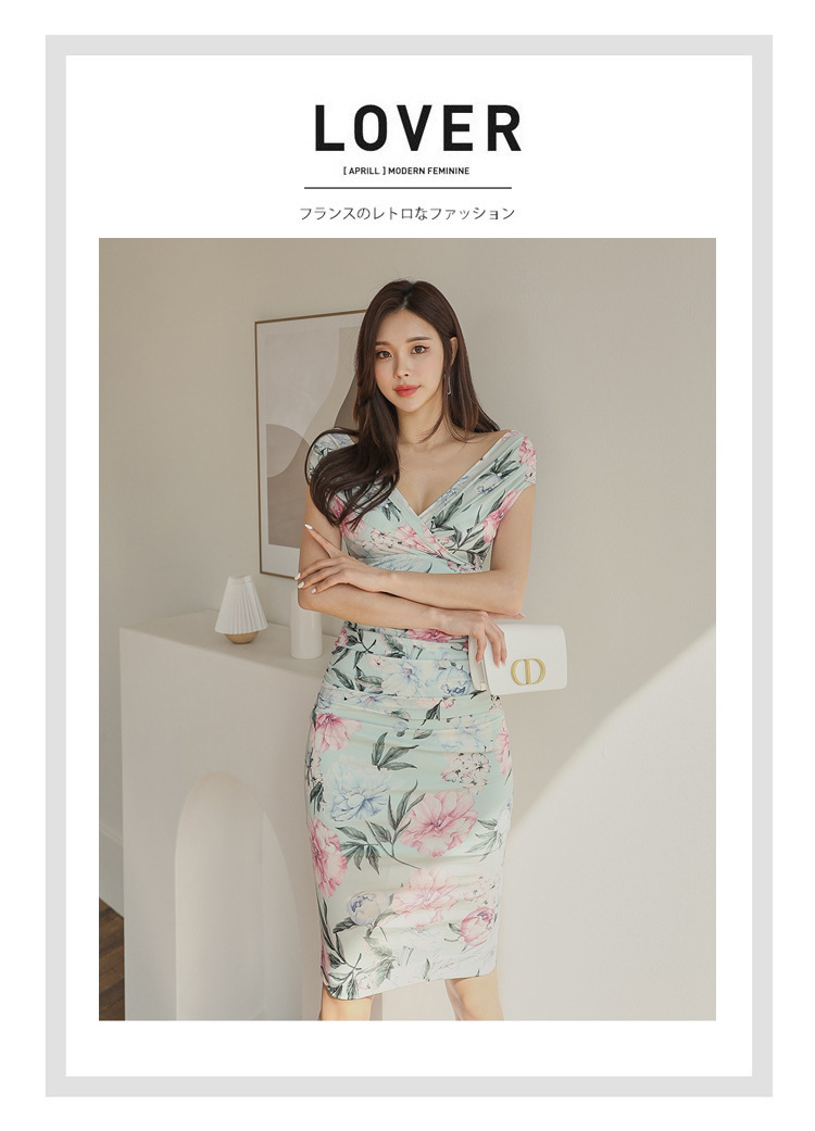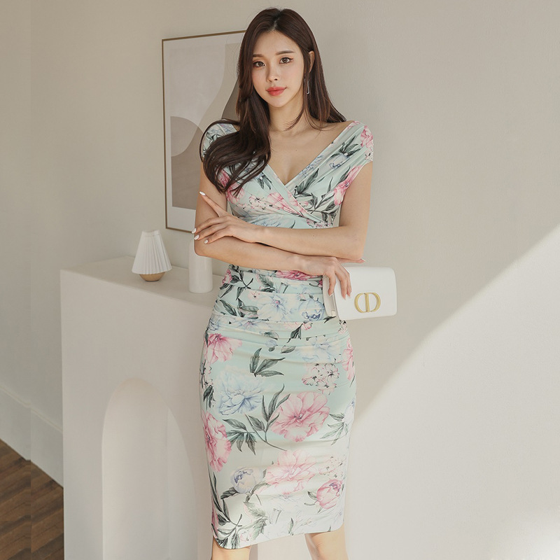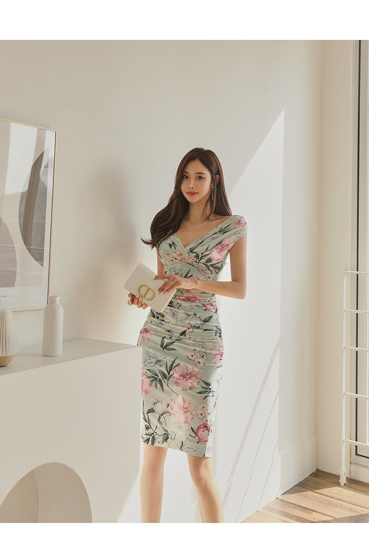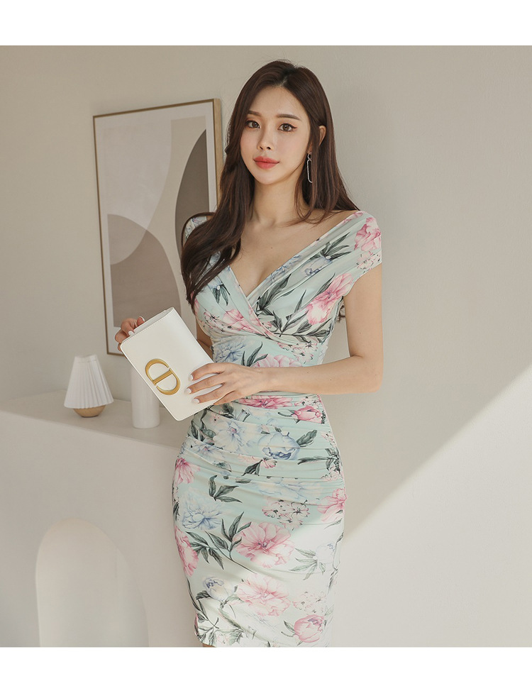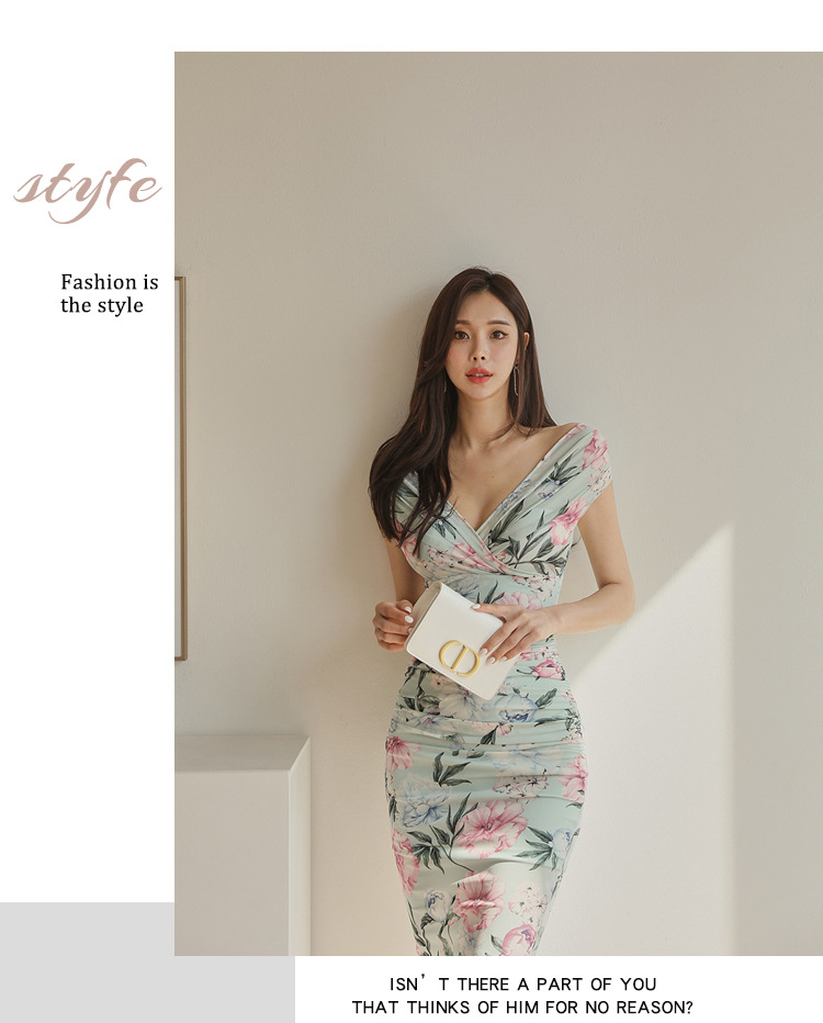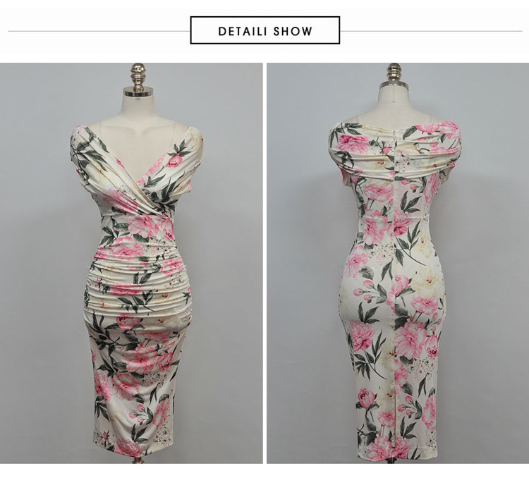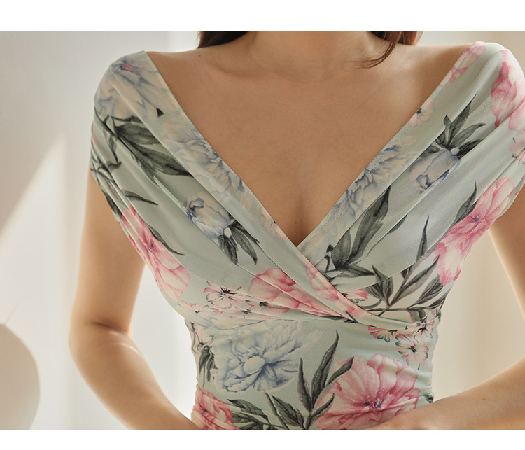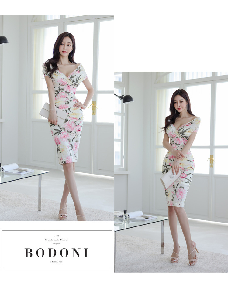 Chiếc đầm này có điểm nhấn ở phần cổ khoét hình chữ V tạo dáng thanh lịch. Thân trên được thiết kế có nếp gấp xếp li co giãn, ôm nhẹ vào vòng eo. Từ eo trở xuống, đầm ôm vừa vặn qua phần hông và xòe nhẹ ở gấu. Chất vải in họa tiết mềm mại, mang đến vẻ ngoại hình nữ tính và duyên dáng. Sản phẩm phù hợp để mặc đi làm, dự tiệc hoặc tạo phong cách thời trang hàng ngày. | Tên sản phẩm: Váy Đầm Liền Thân Nữ Trễ Ngực Họa Tiết Hoa Cổ Chữ V Hàng Mùa Hè - Thời Trang Nữ | Mã sản phẩm: A9990 - Giá: 650.000đ | Mã nhà sản xuất: ZHOUT-G02Hình ảnh sản phẩm