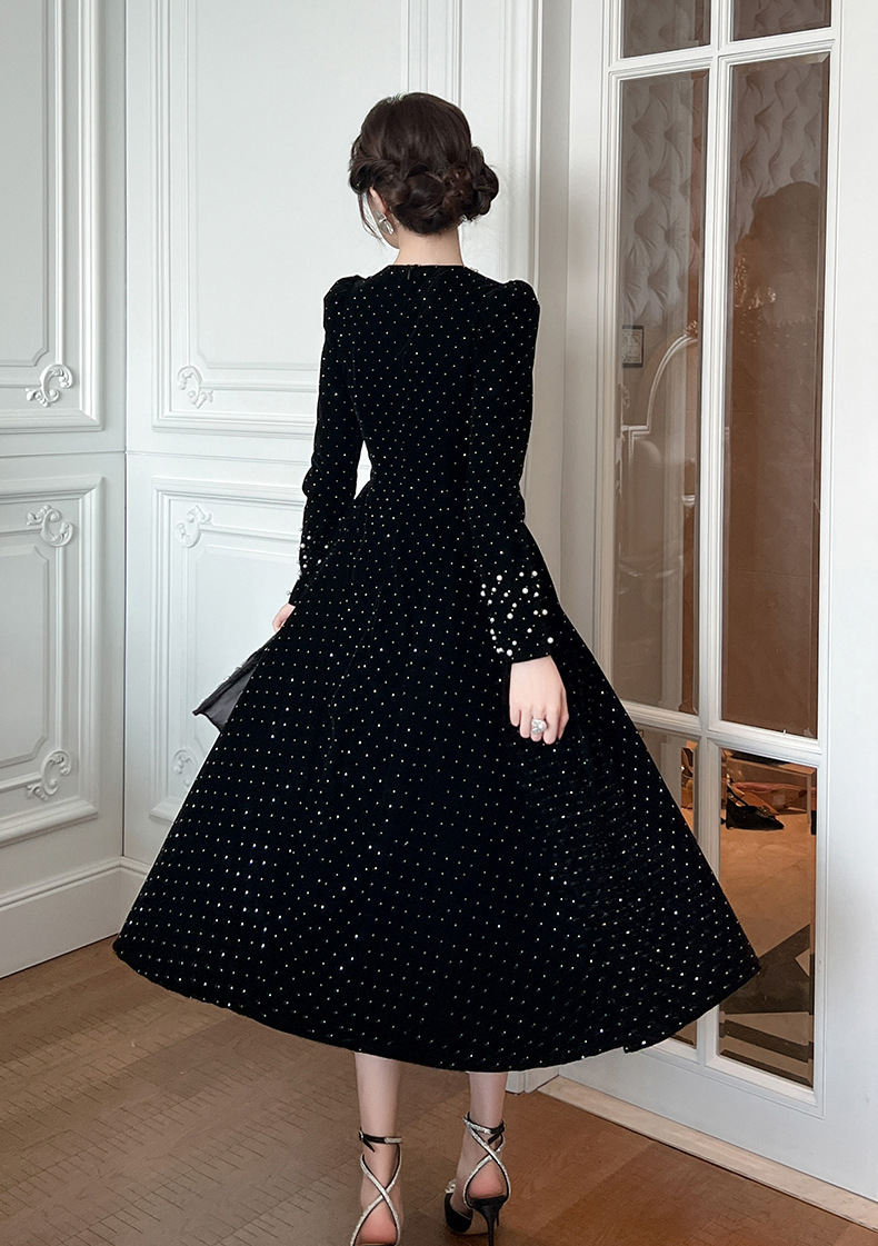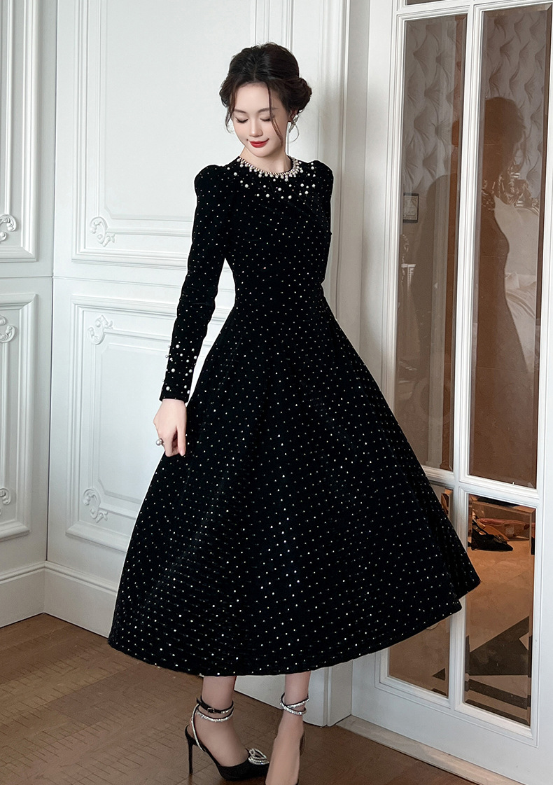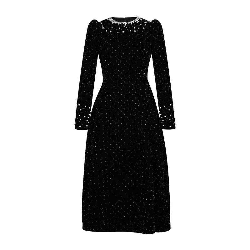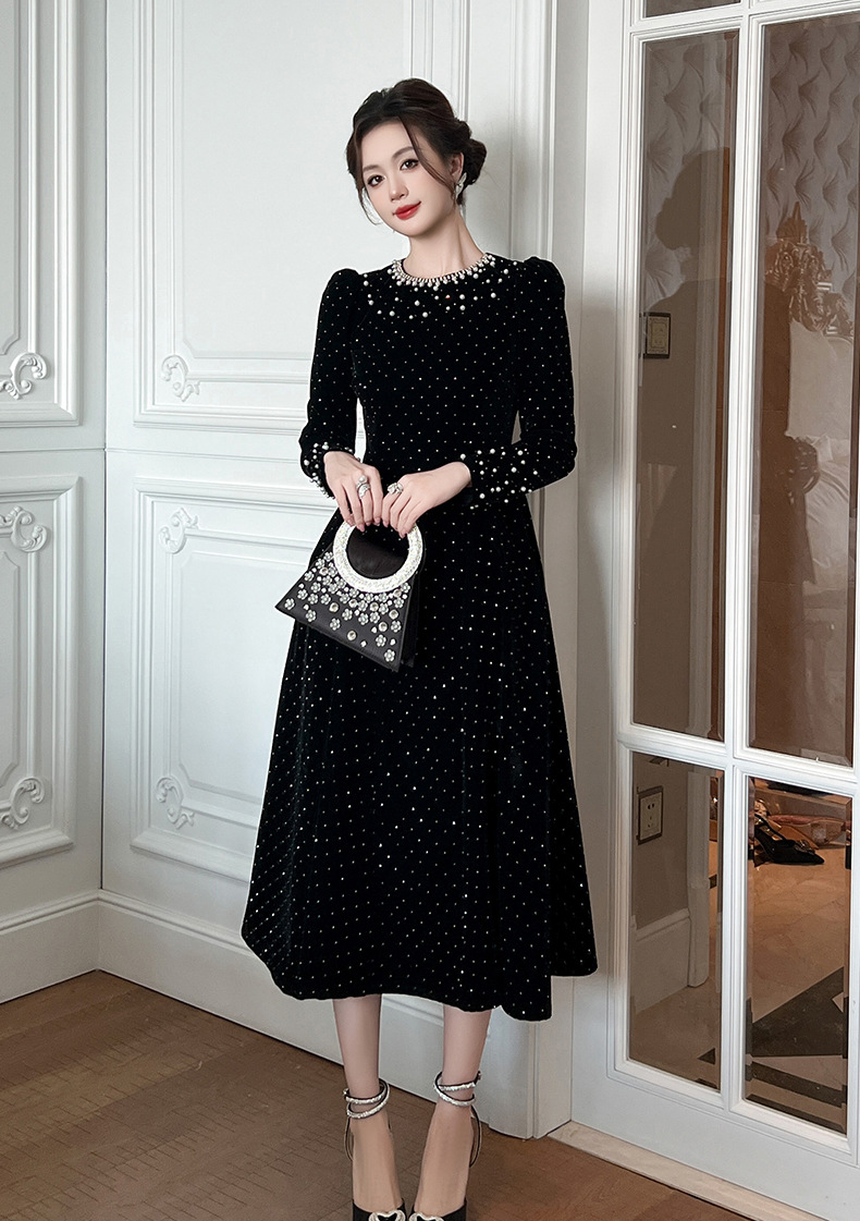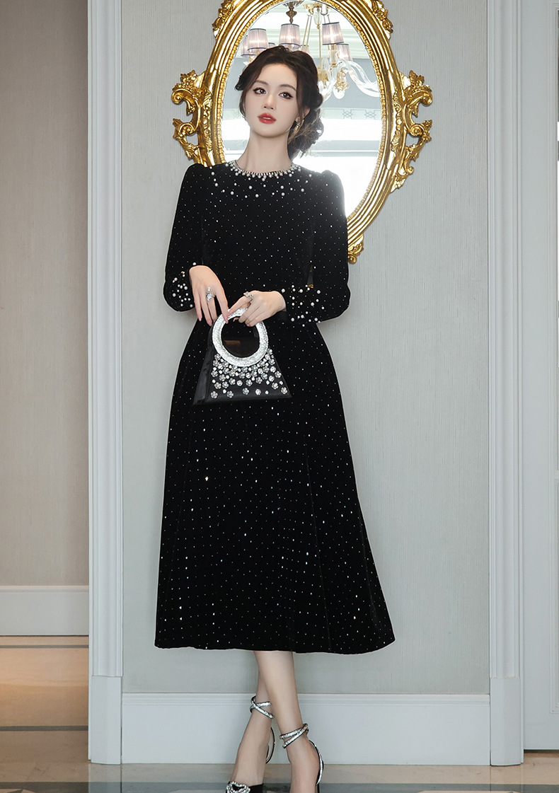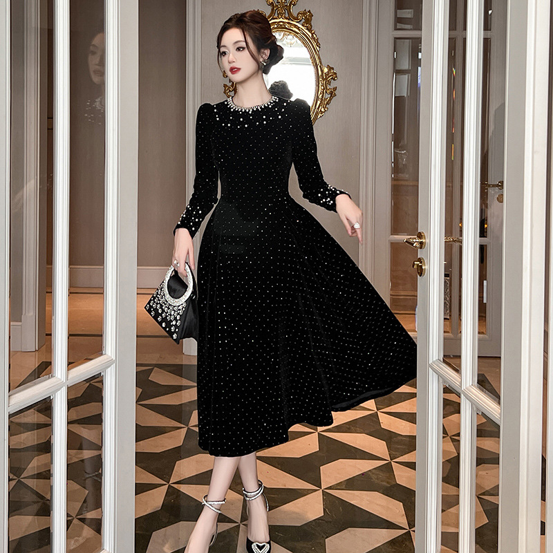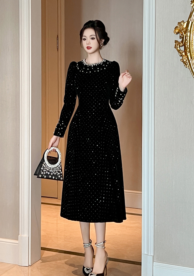 Chiếc đầm dáng dài cho nữ với form ôm eo, tôn dáng người mặc. Cổ tròn và tay áo được trang trí bằng những hạt đá lấp lánh, tạo điểm nhấn tinh tế. Chất liệu vải mềm mại, có độ rũ nhẹ nhàng giúp tôn lên nét duyên dáng. Sản phẩm phù hợp cho nhiều dịp đi chơi, gặp gỡ. Giữ gìn bằng cách giặt tay và phơi trong bóng râm để bền đẹp. | Tên sản phẩm: Váy Đầm Liền Thân Nữ Hàng Mùa Xuân Thu Đông - Thời Trang Nữ | Mã sản phẩm: B0202 - Giá: 1.620.000đ | Mã nhà sản xuất: CHDG-G05Hình ảnh sản phẩm
